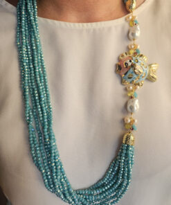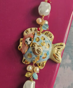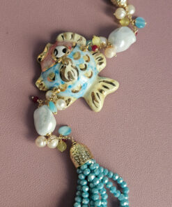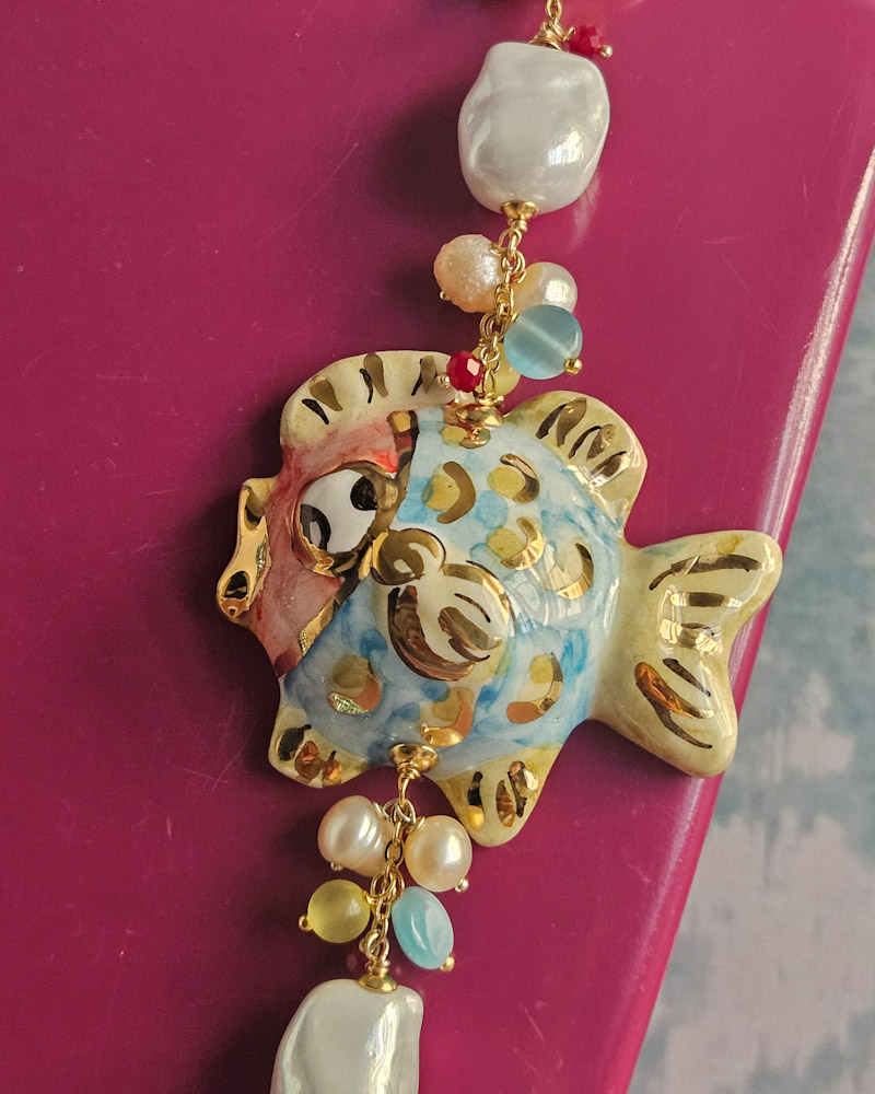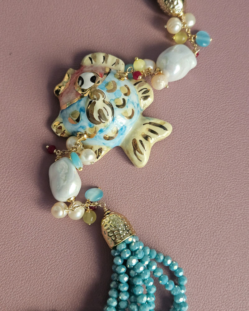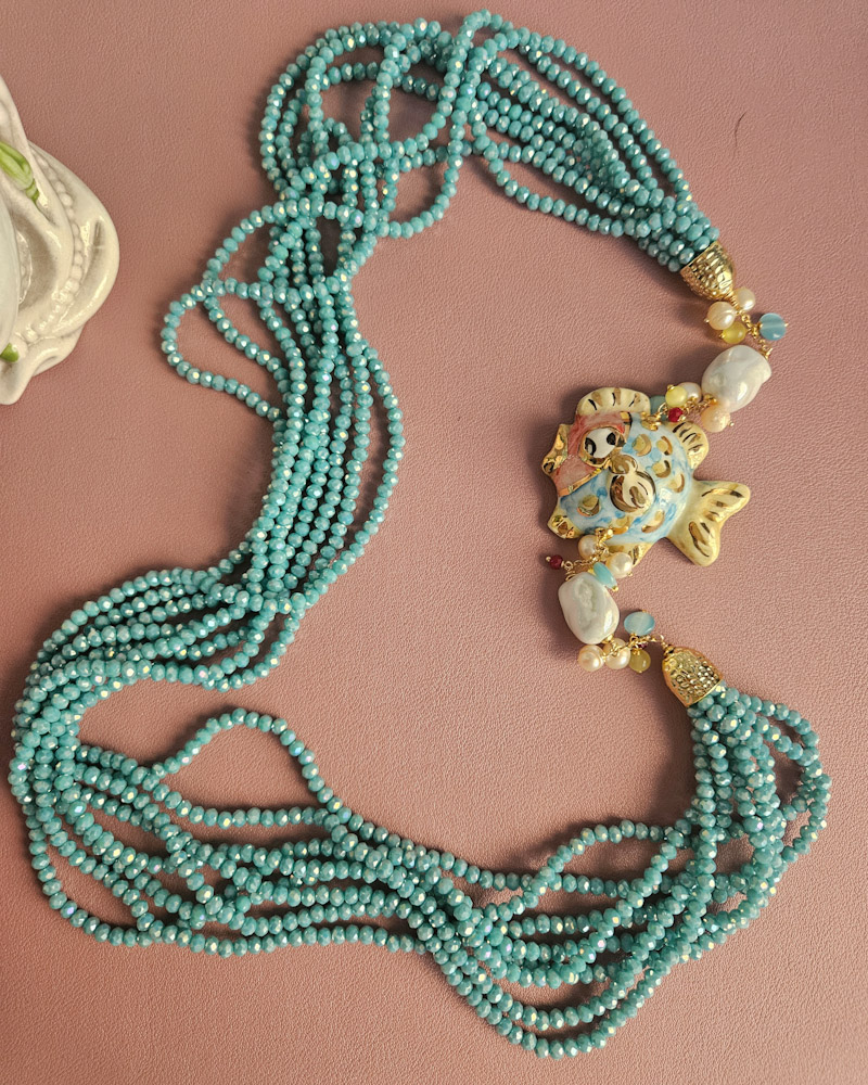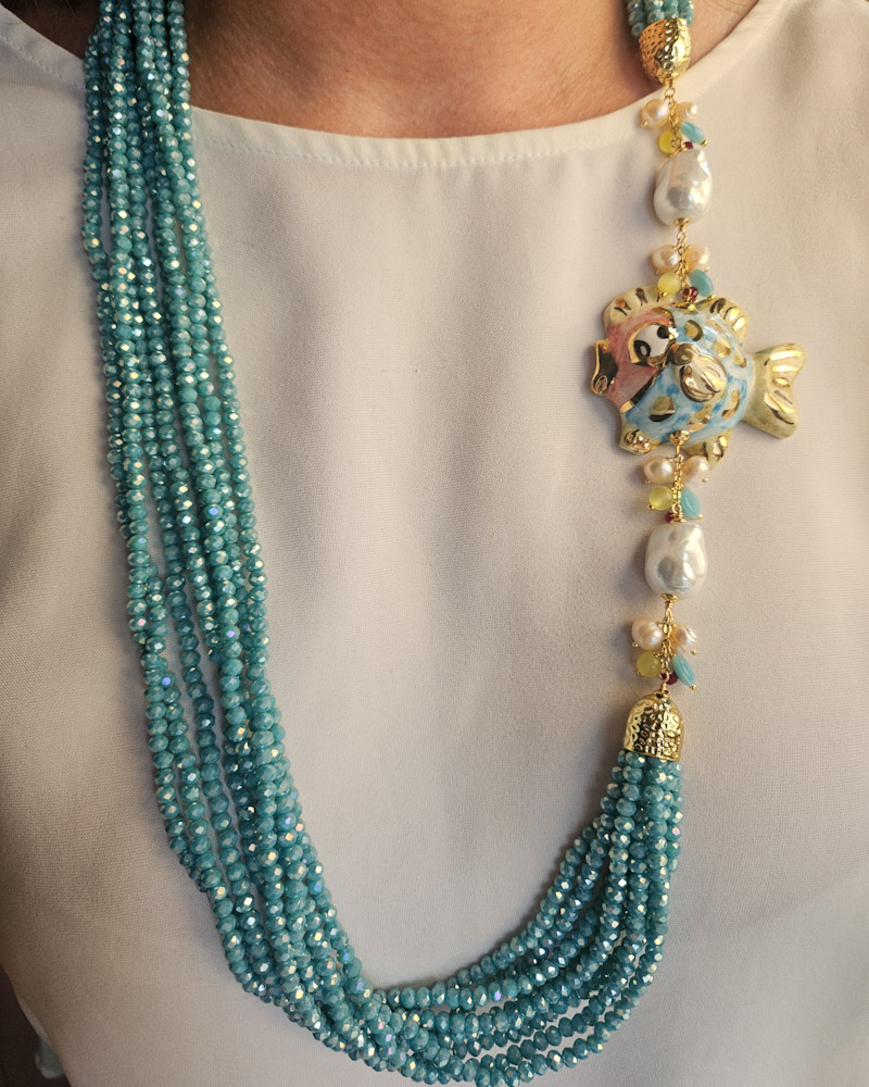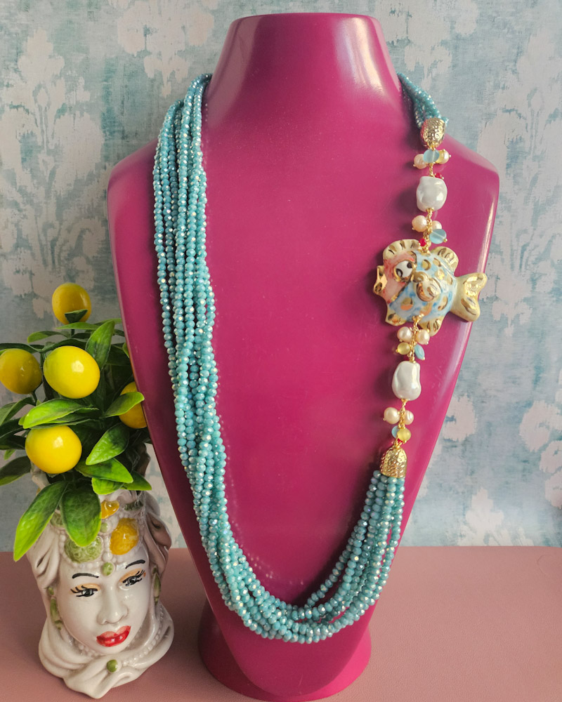Statement Necklace with Light Blue Crystals and Sicilian Ceramic Fish