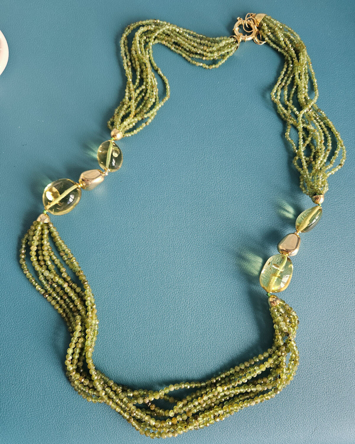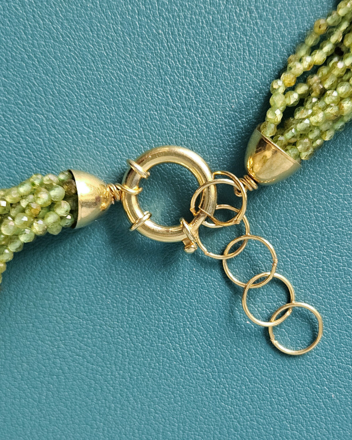 Ten strands of peridot, luminous and vibrant, flow together to create a rich yet light volume that captures the light with every movement. The green of the peridot is never uniform, and it is precisely this natural irregularity that makes it so sophisticated and authentic.