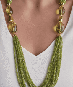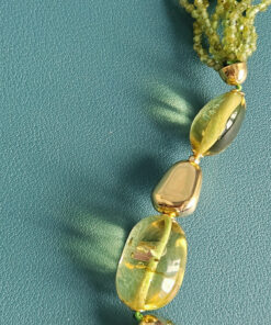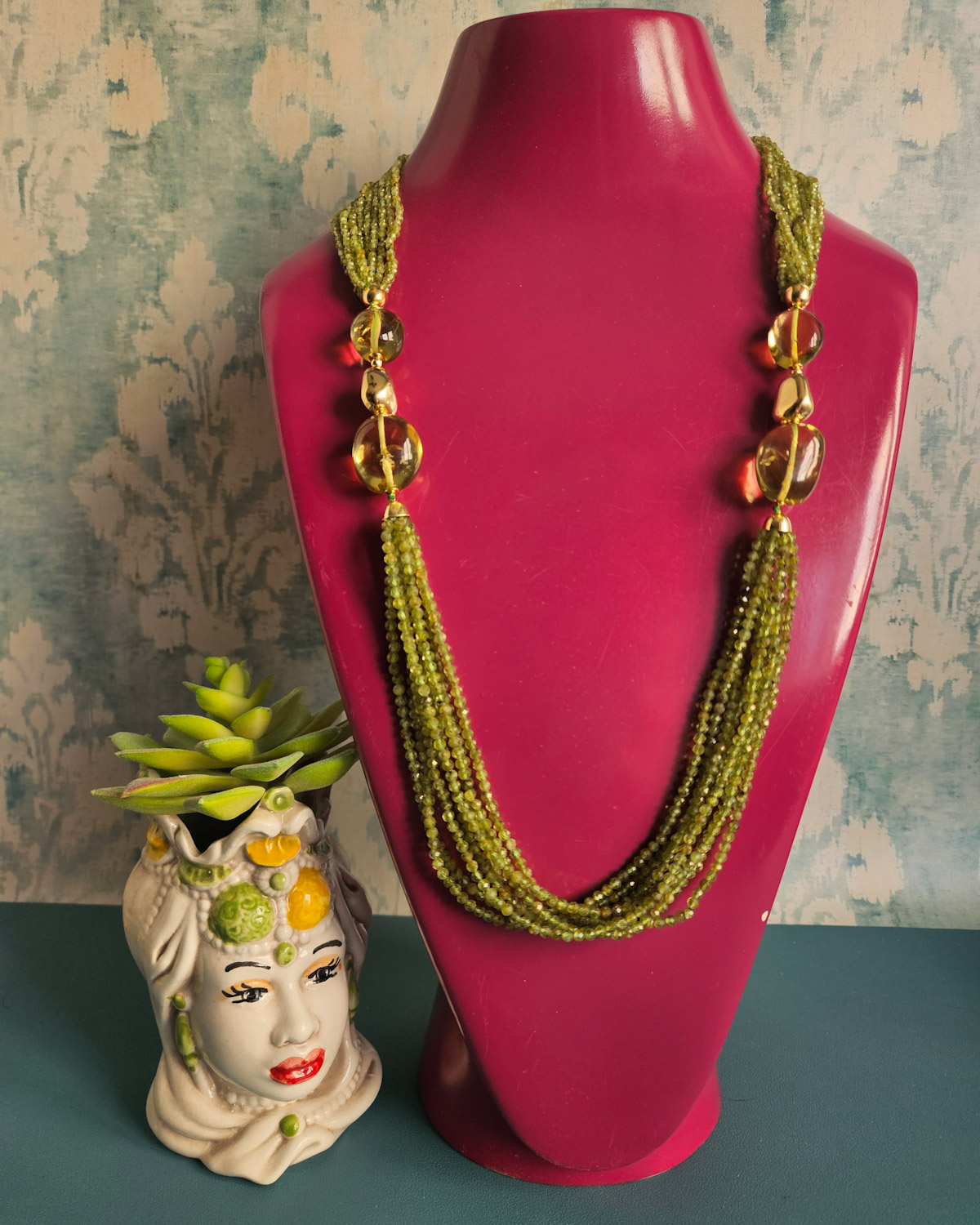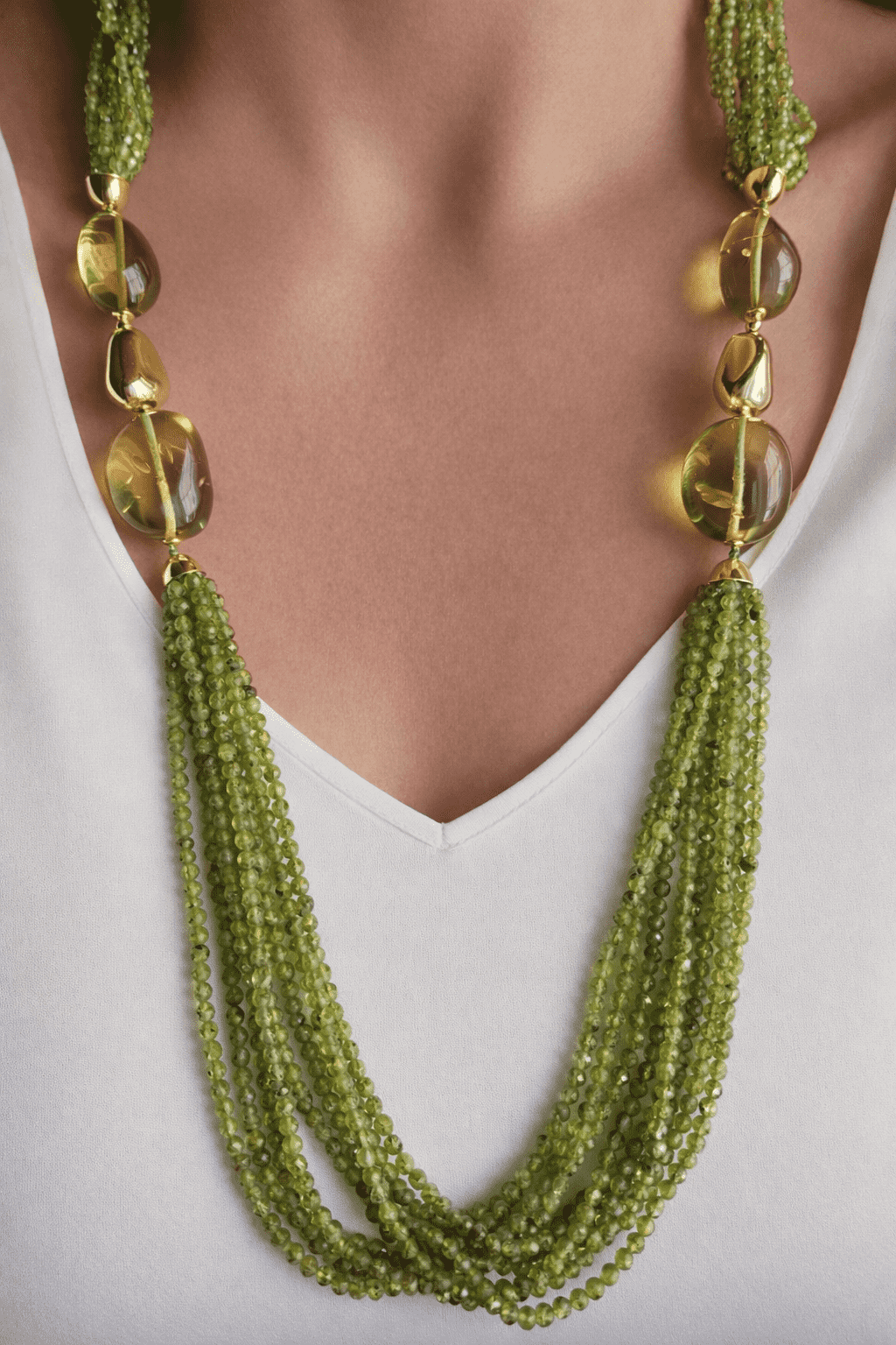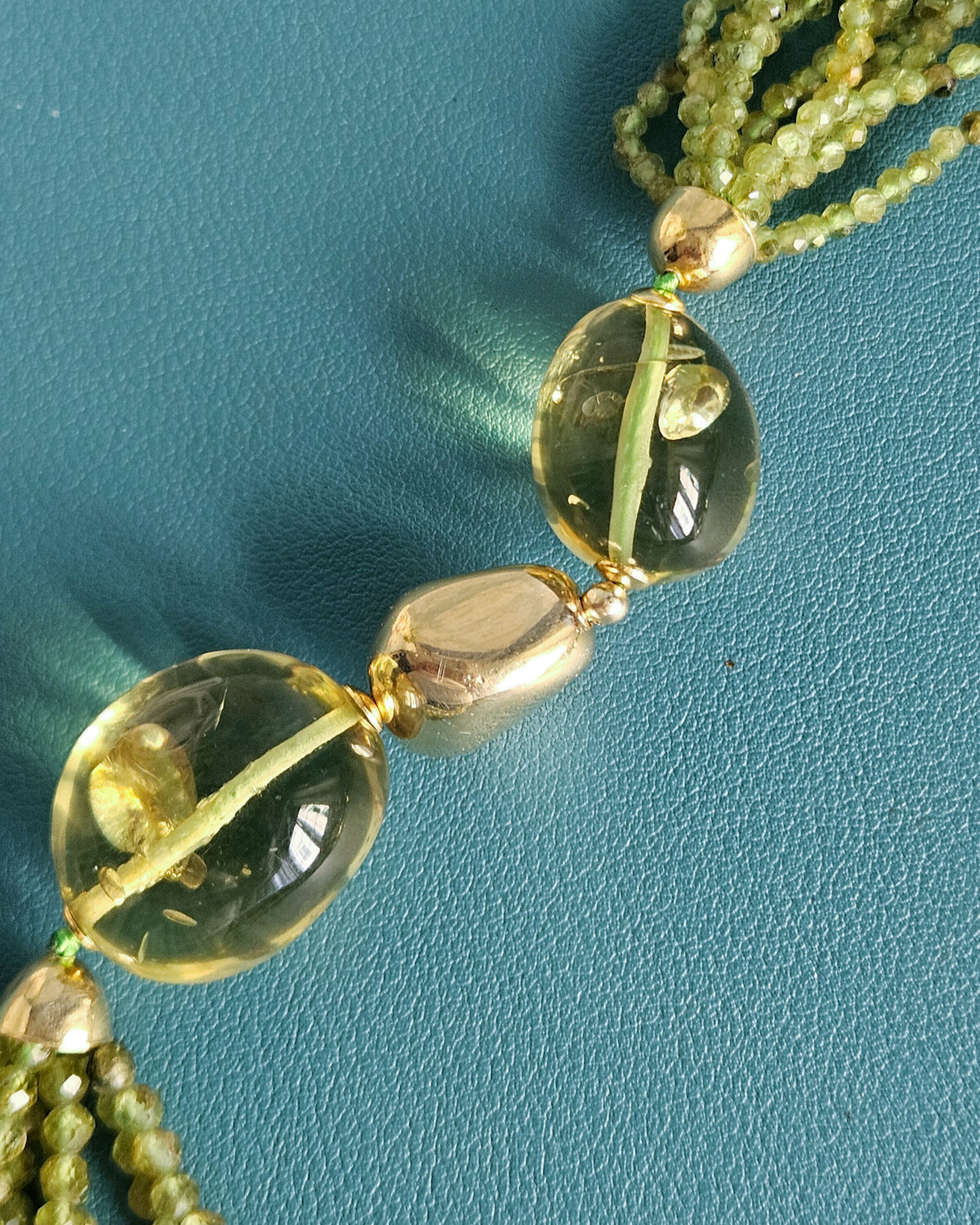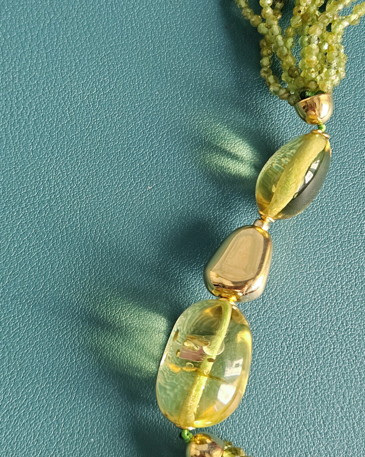 A precious handcrafted necklace featuring peridot and Mexican green amber.