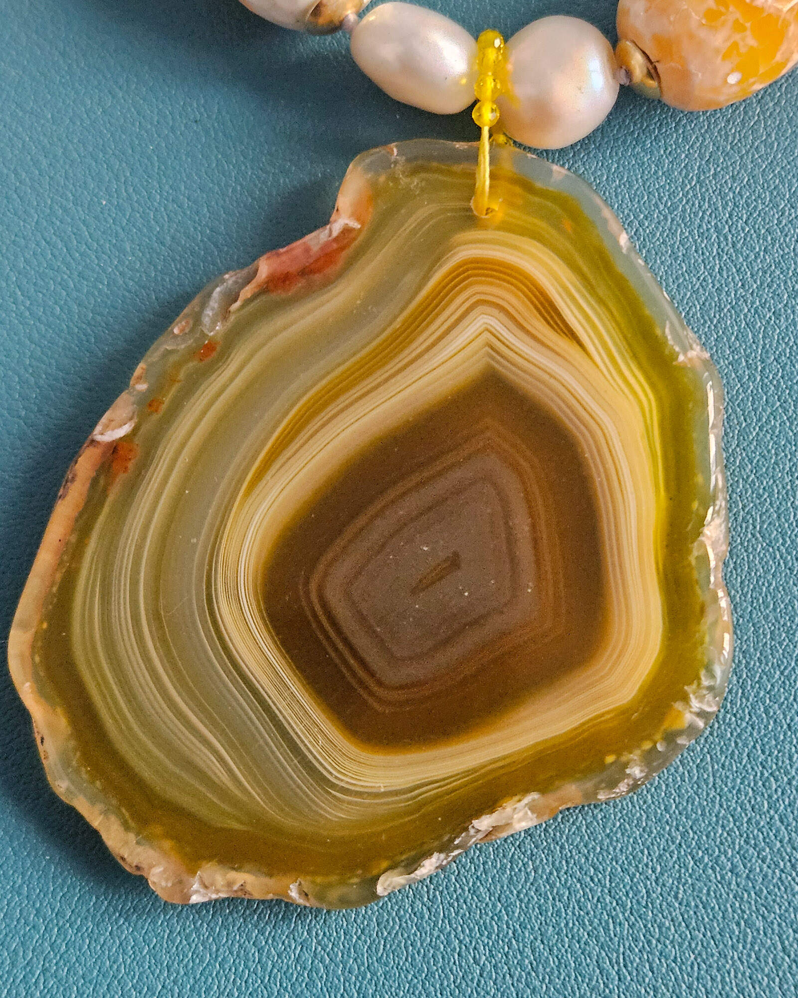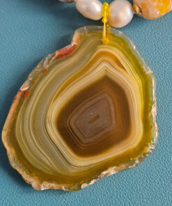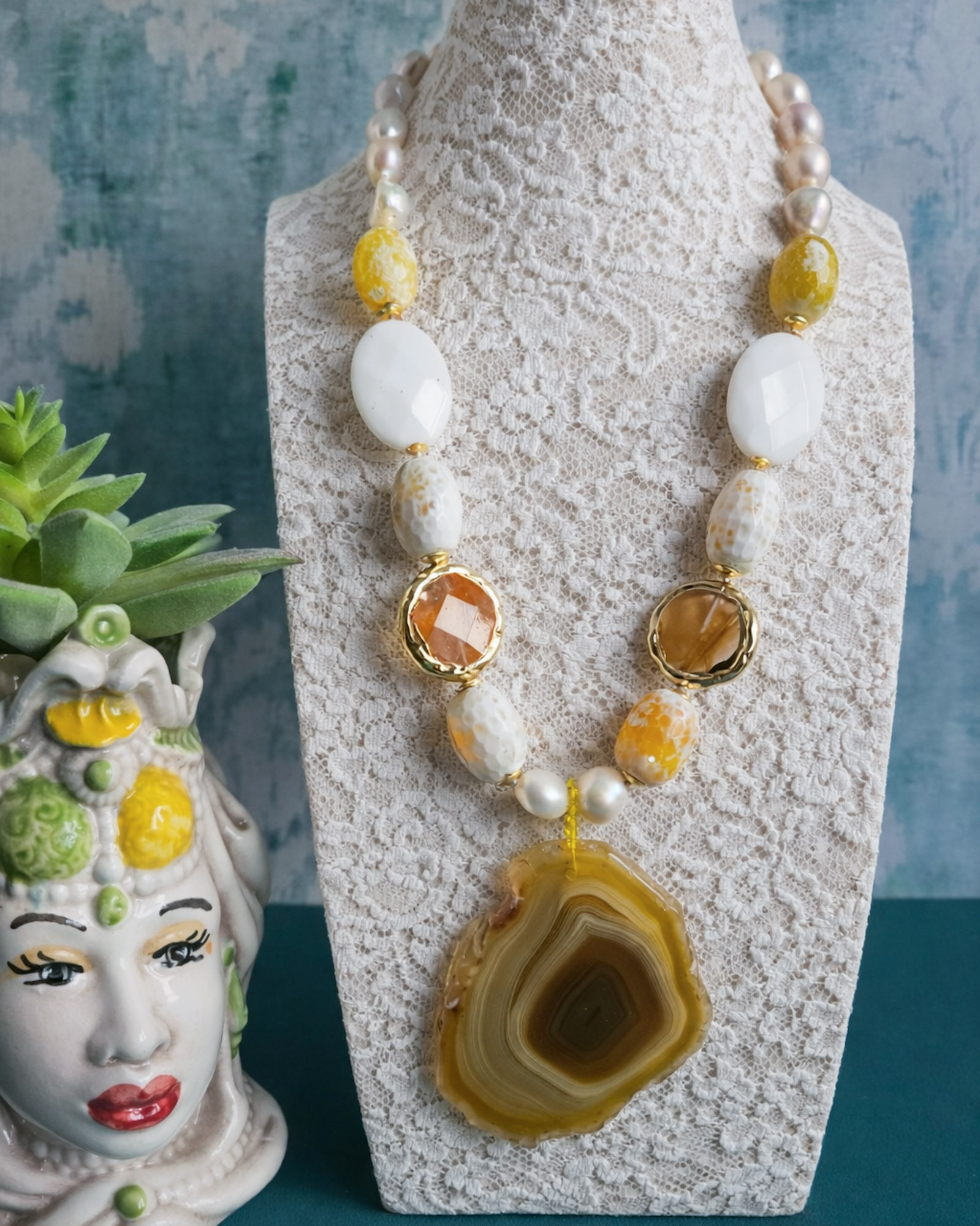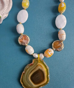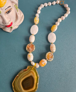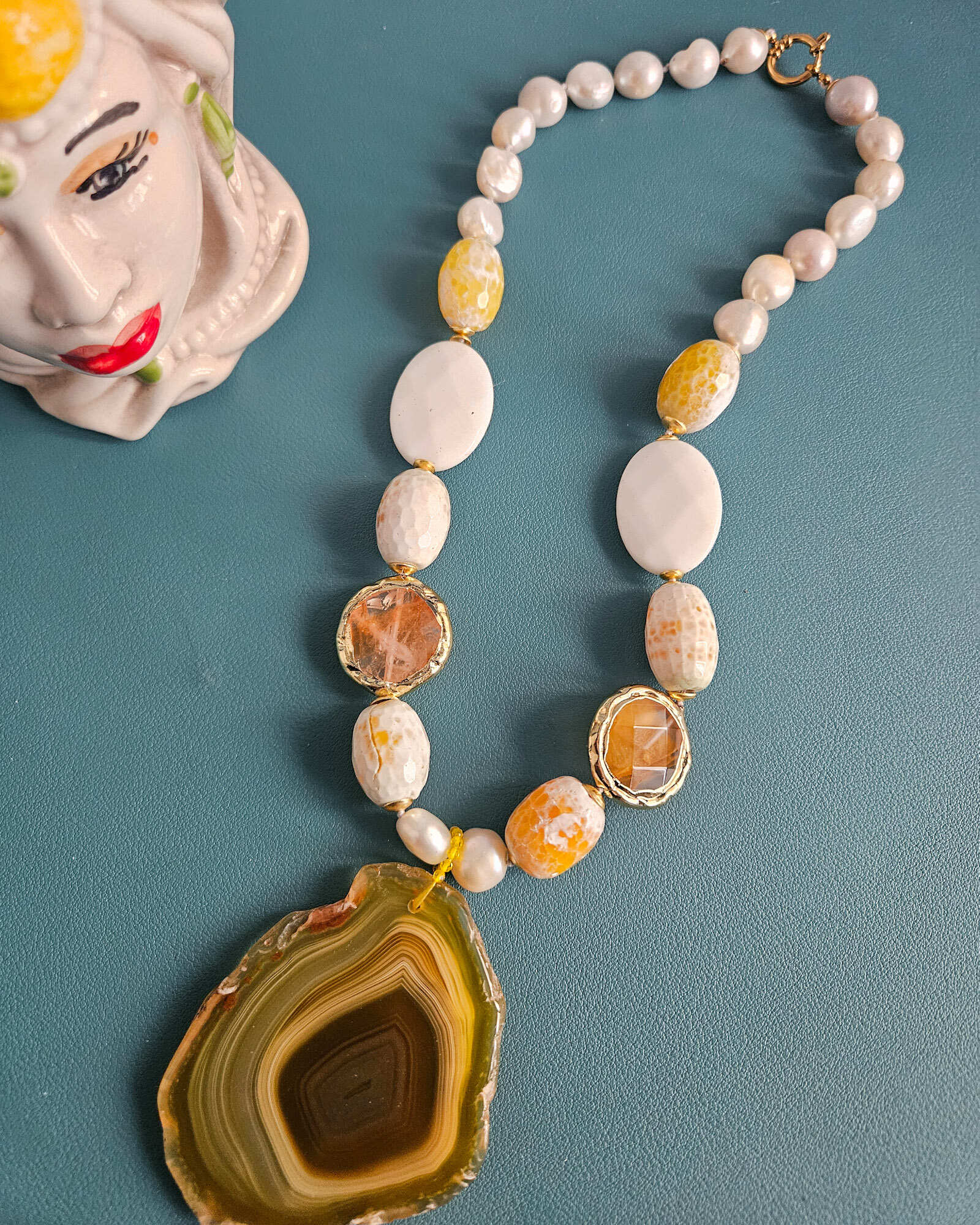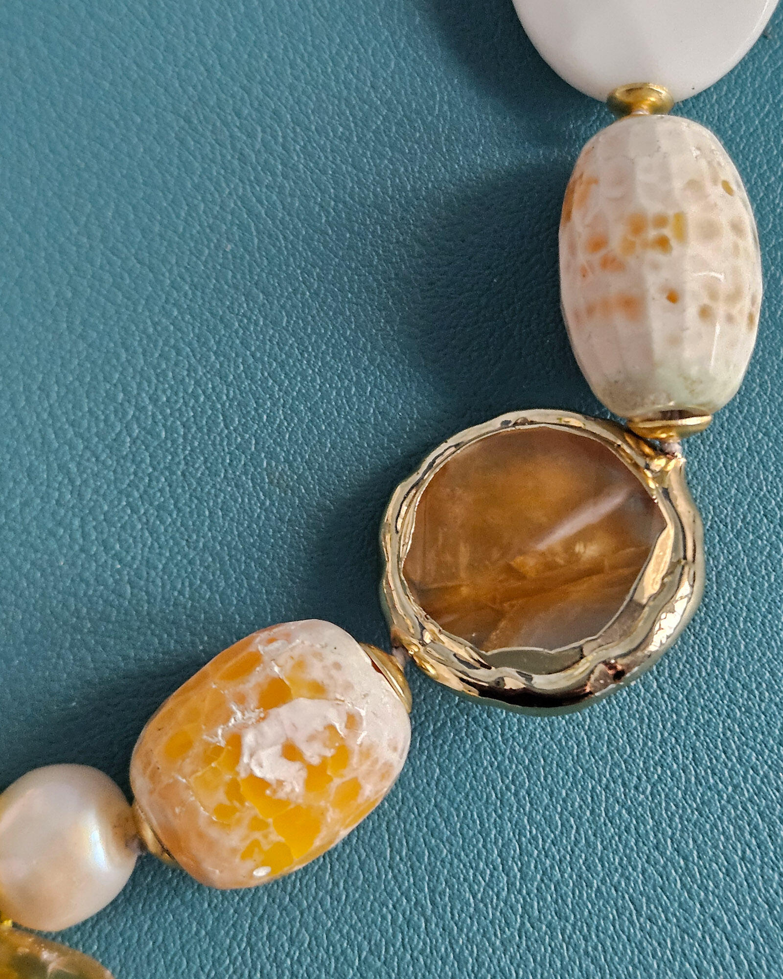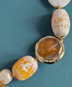 Elegant and luminous, this handcrafted necklace combines natural materials and refined details. River pearls, with their soft and irregular luster, alternate with natural agate stones in delicate shades of beige and cream, creating a harmonious balance between light and color.