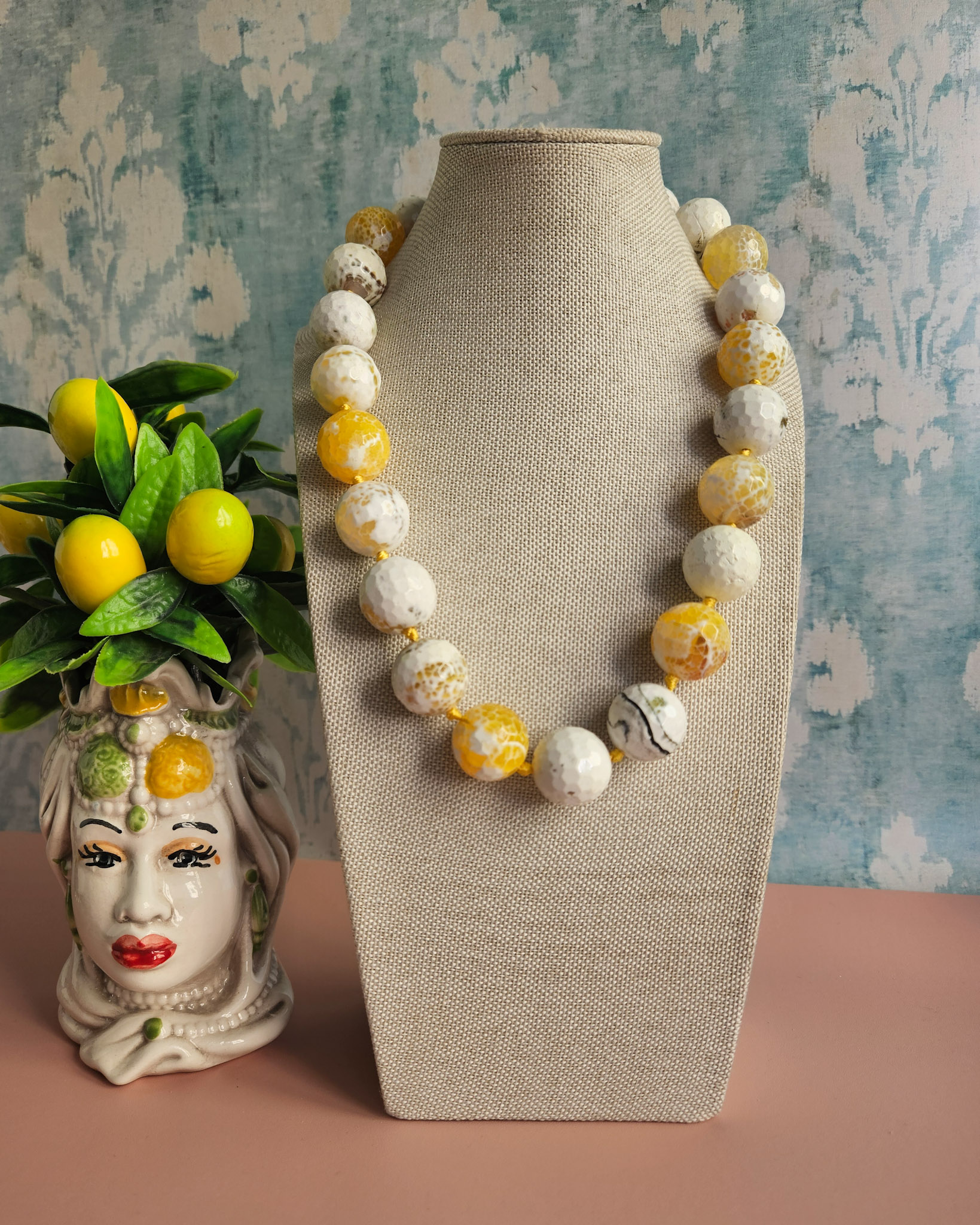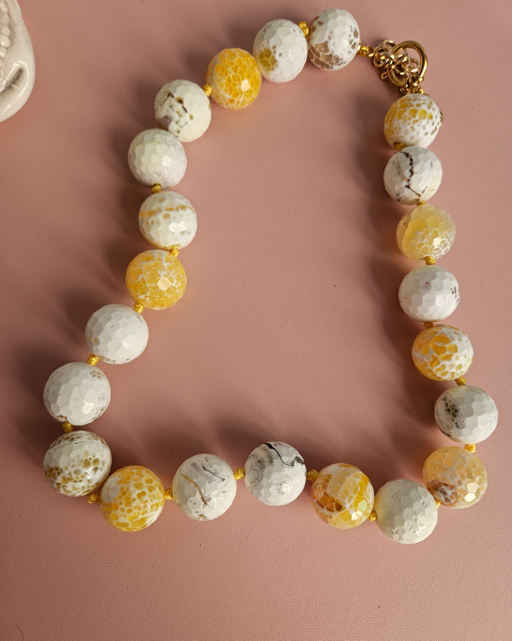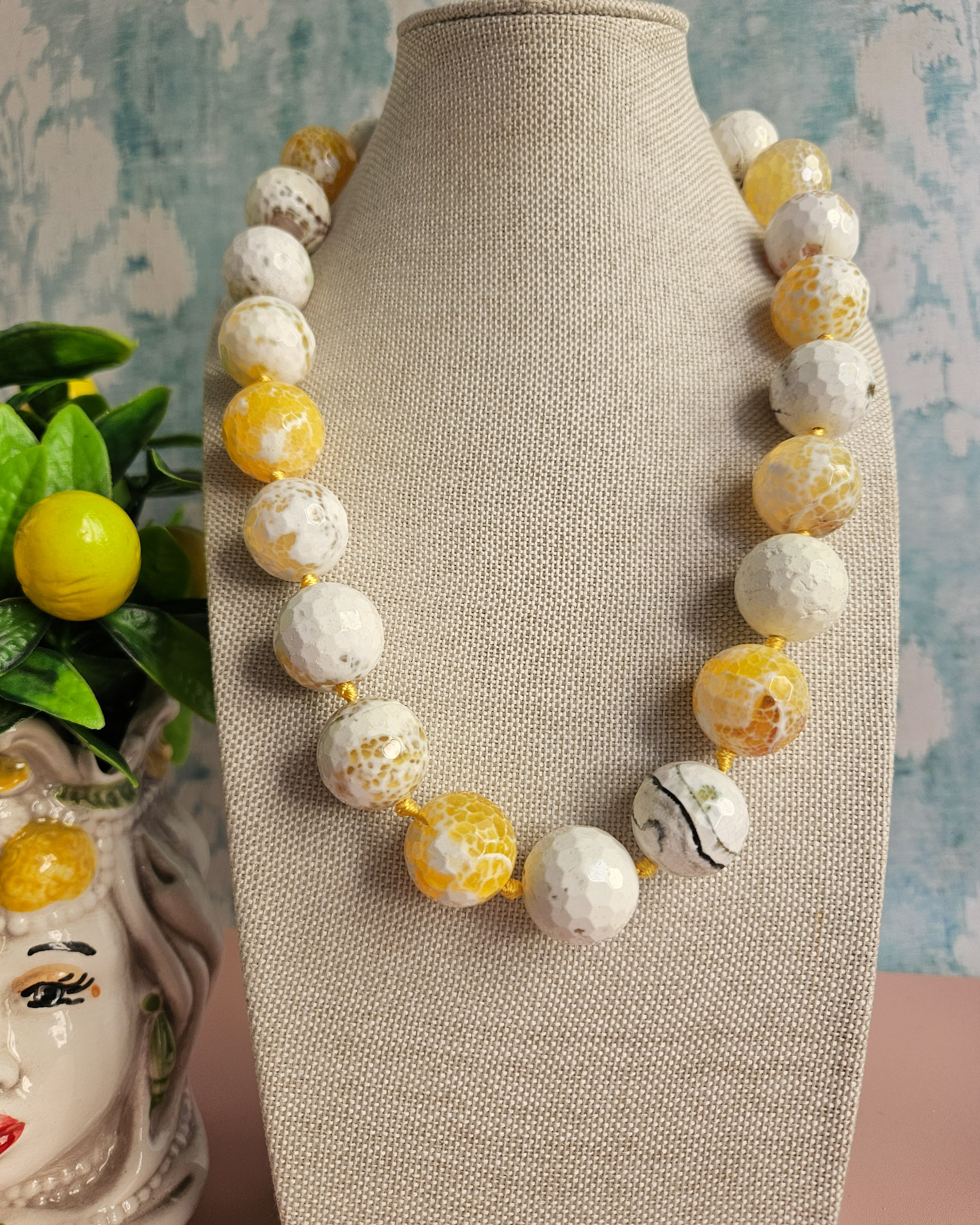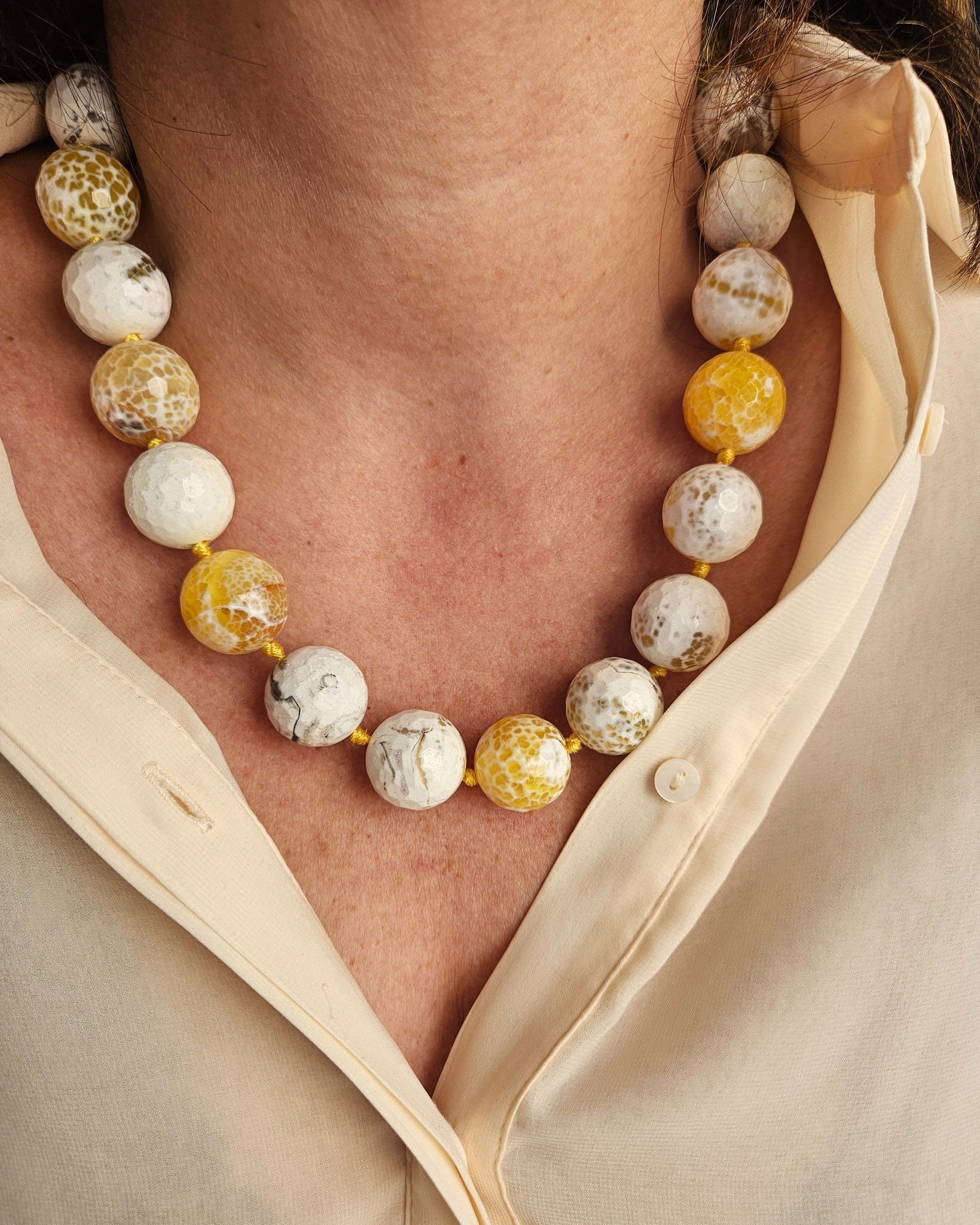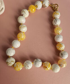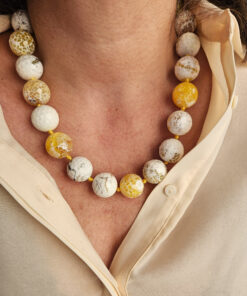 A necklace of authentic beauty, made with natural yellow fire agate with irresistible golden, amber, and honey hues.