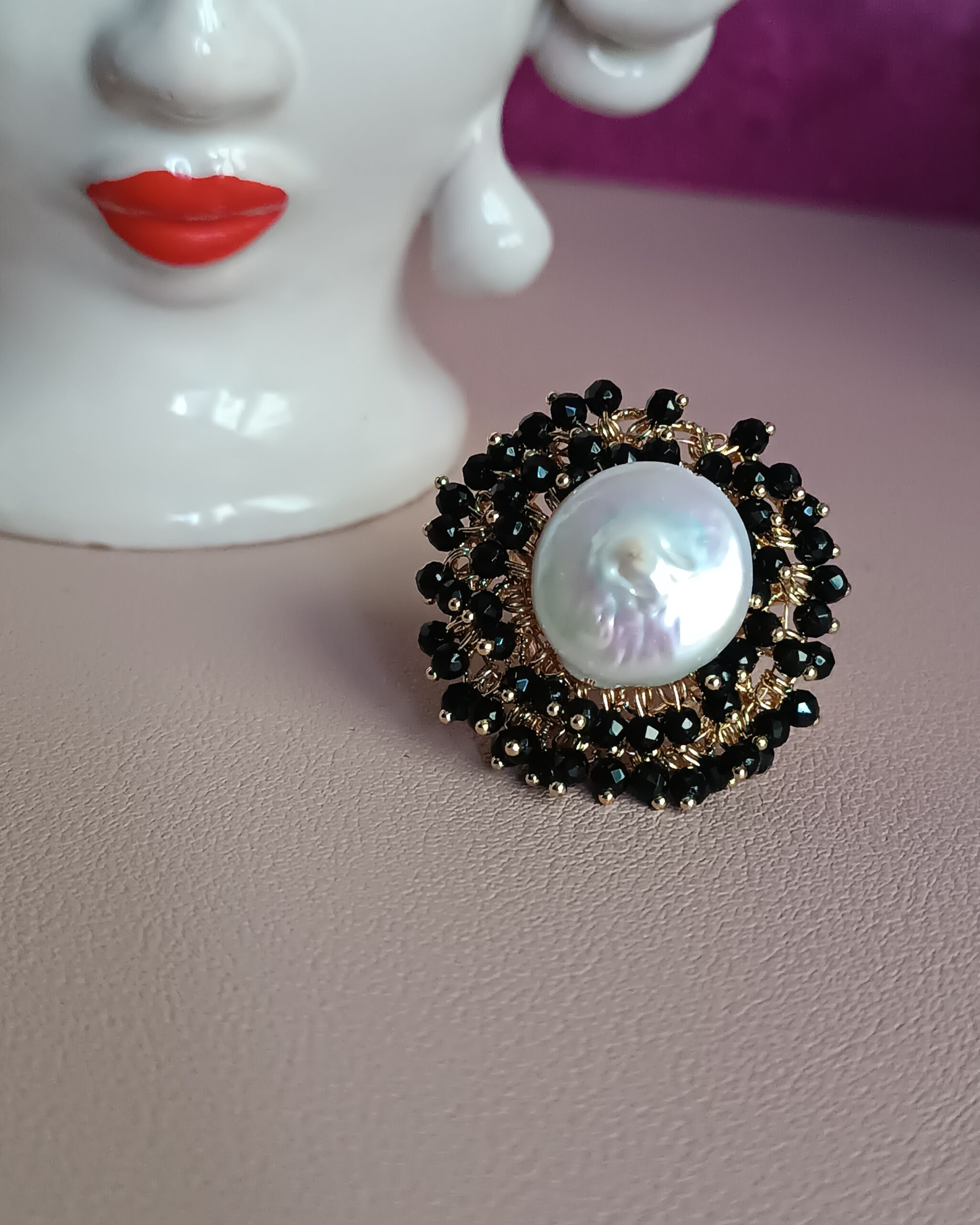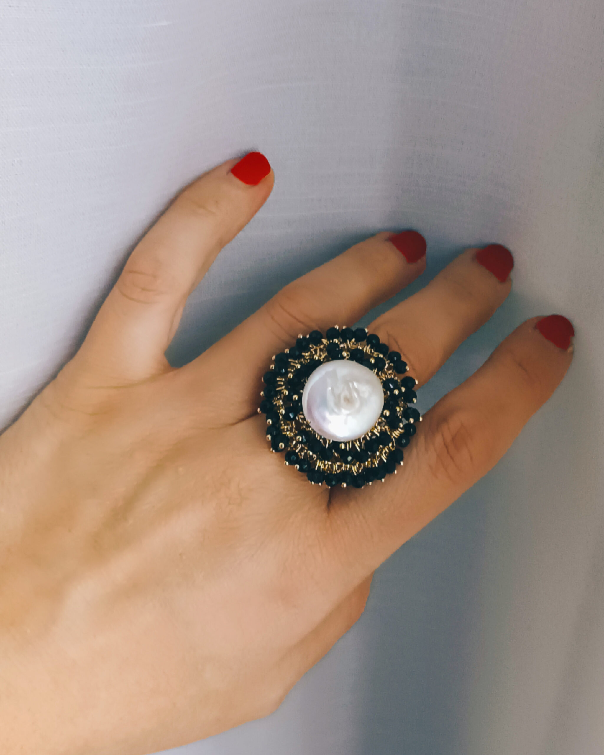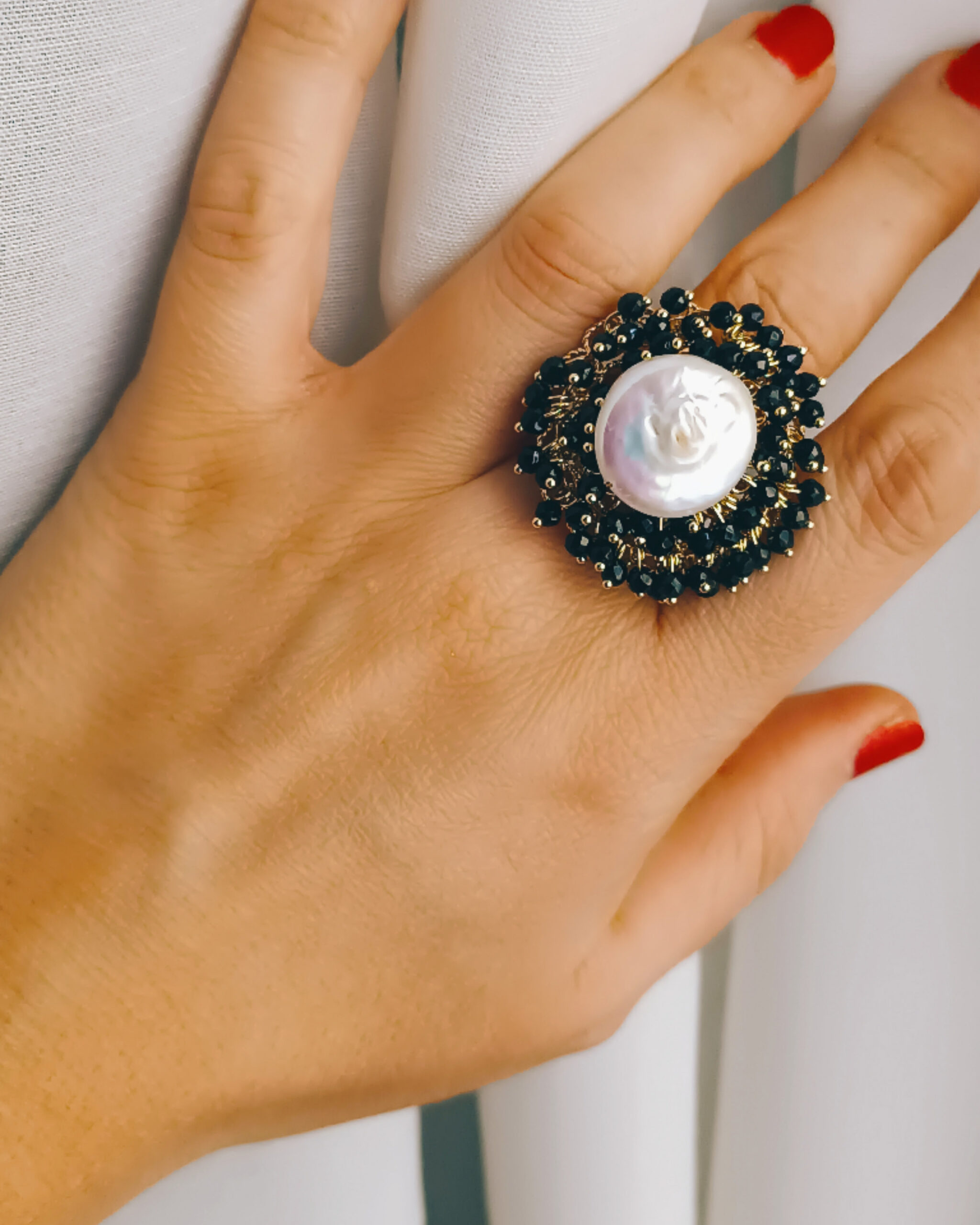 This ring falls among the “noisy” jewelry (within the limits of bearability let’s be clear ) : a central flat pearl surrounded by dozens of dangling crystals , swinging here and there with every movement of the hand.