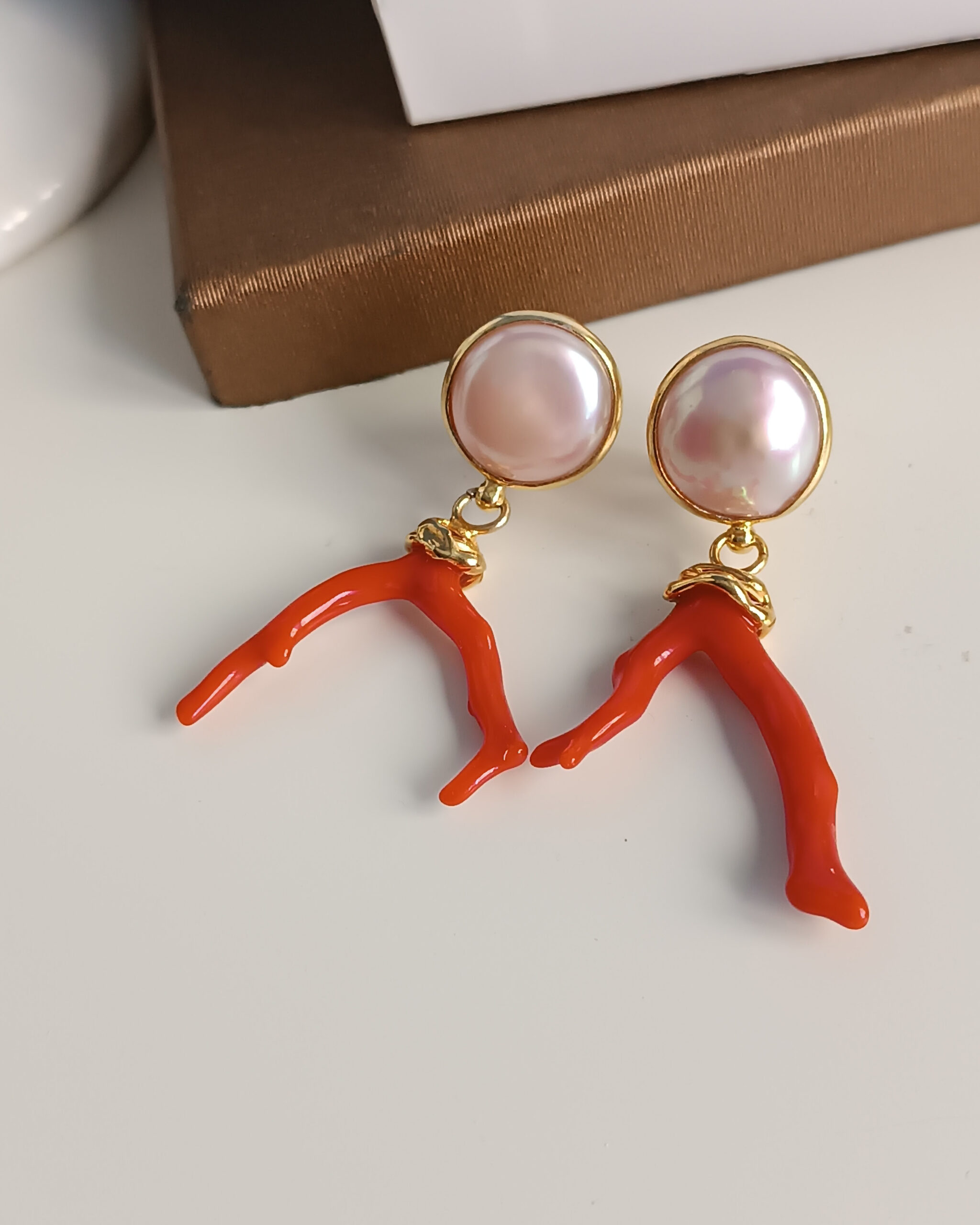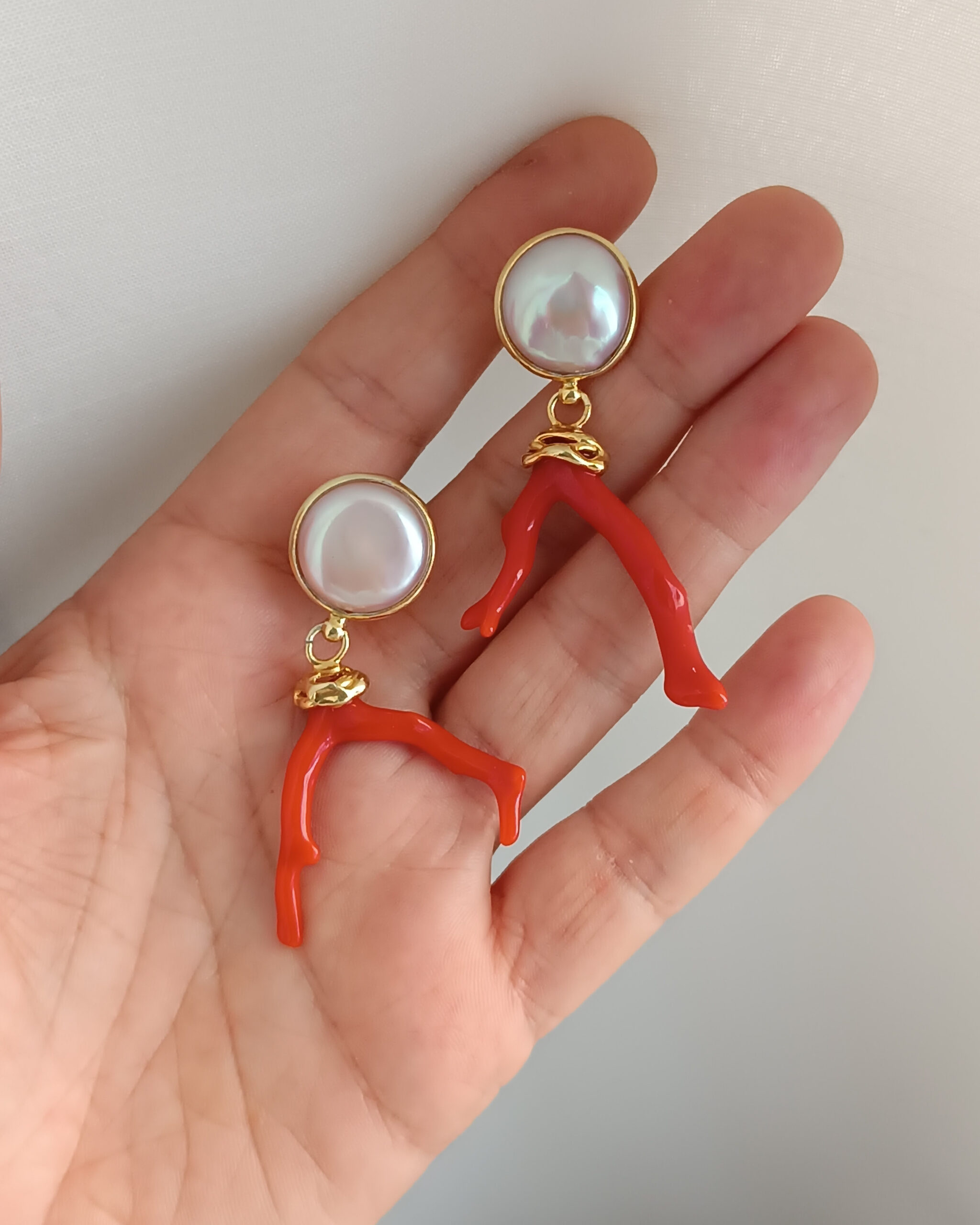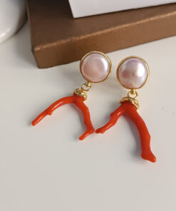 Statement Earrings with Freshwater Pearls and Red Coral Branch