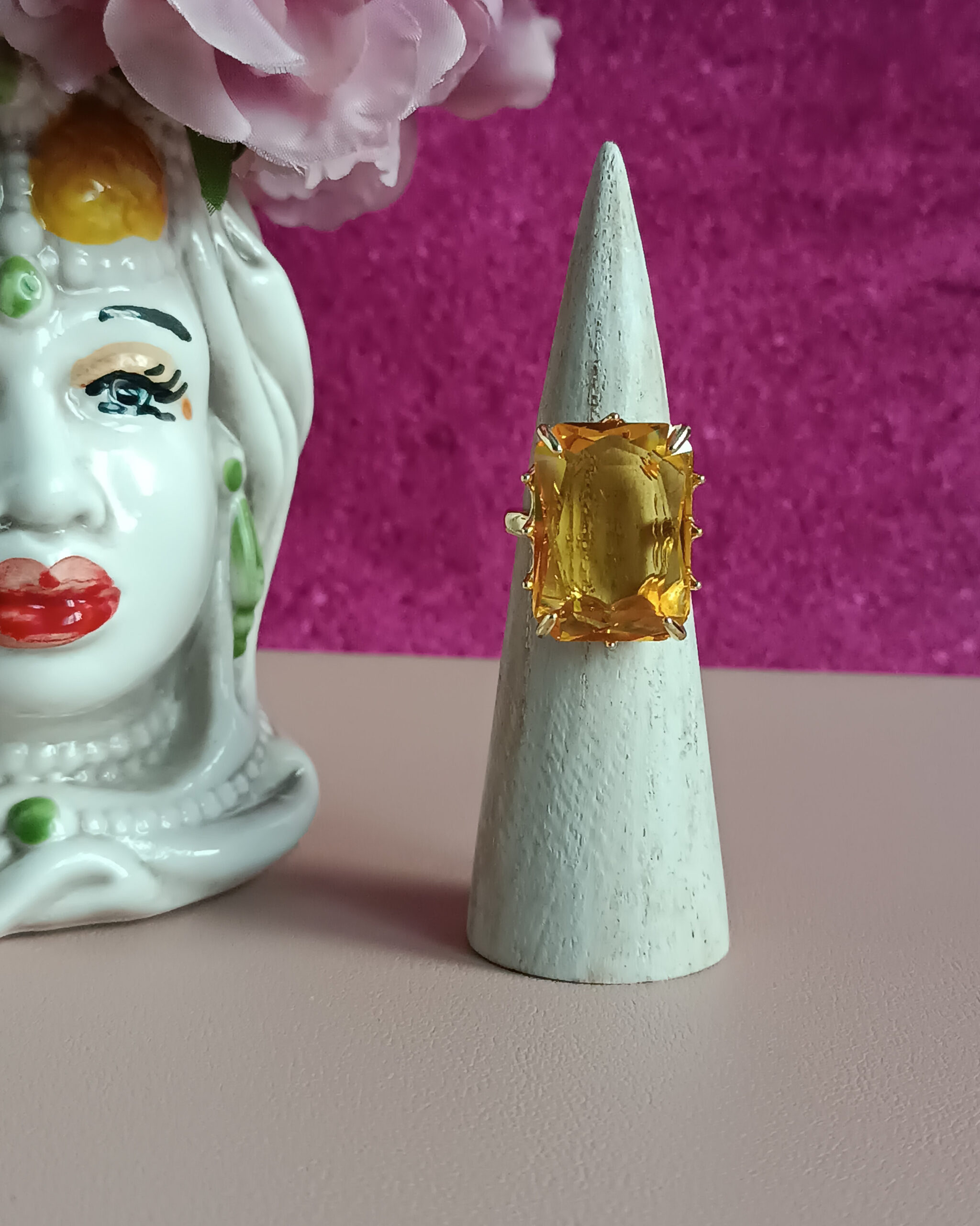 Very stylish ring handmade from Brass and rectangular Crystal stone, yellow color.