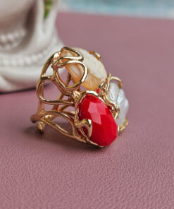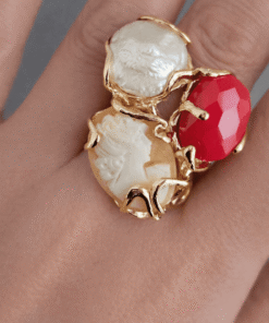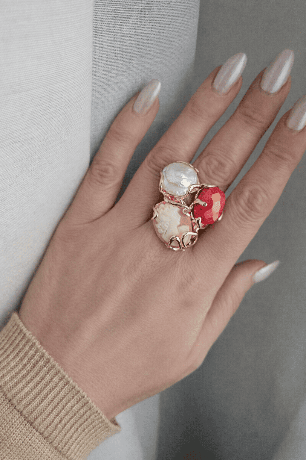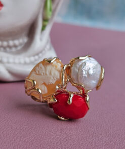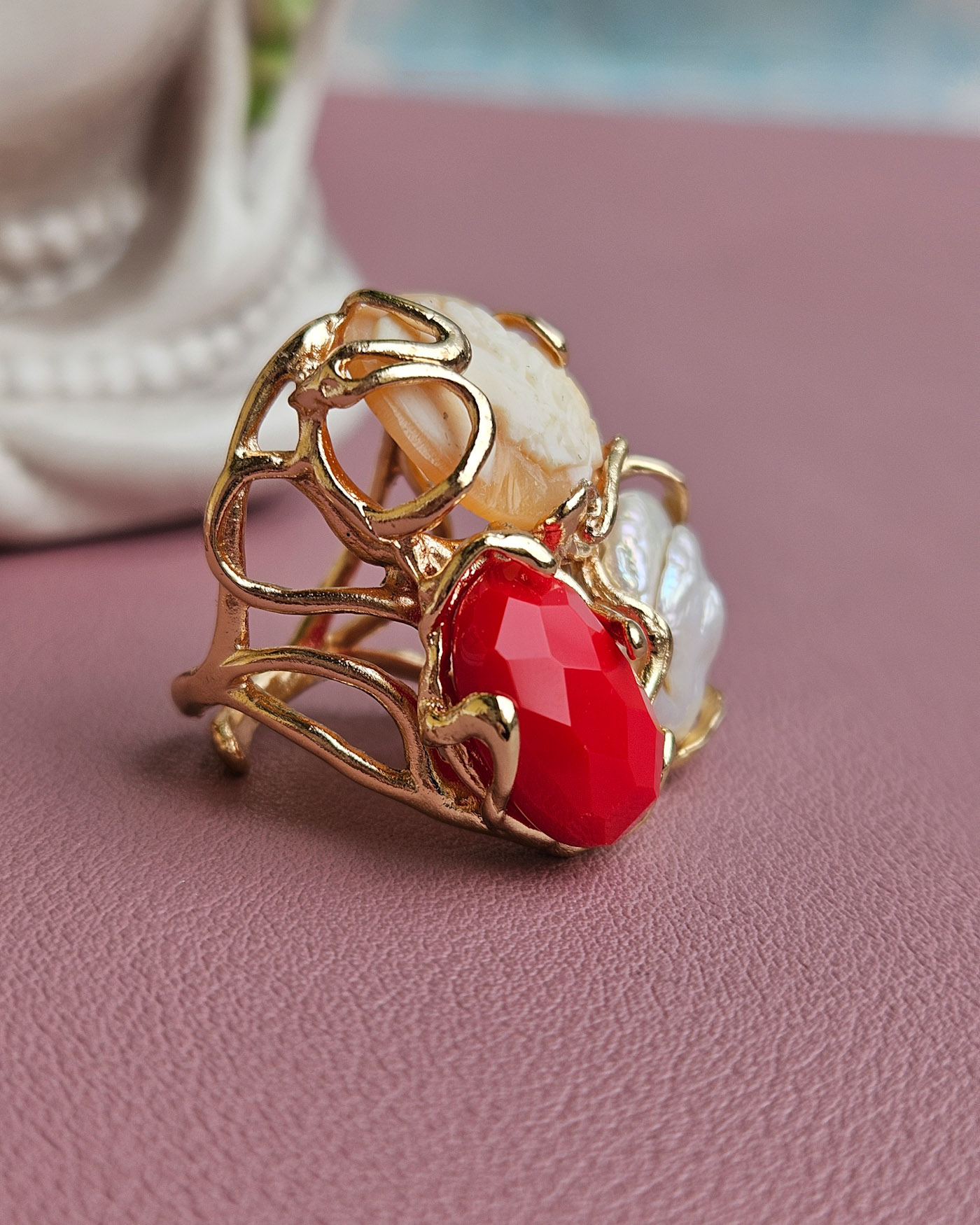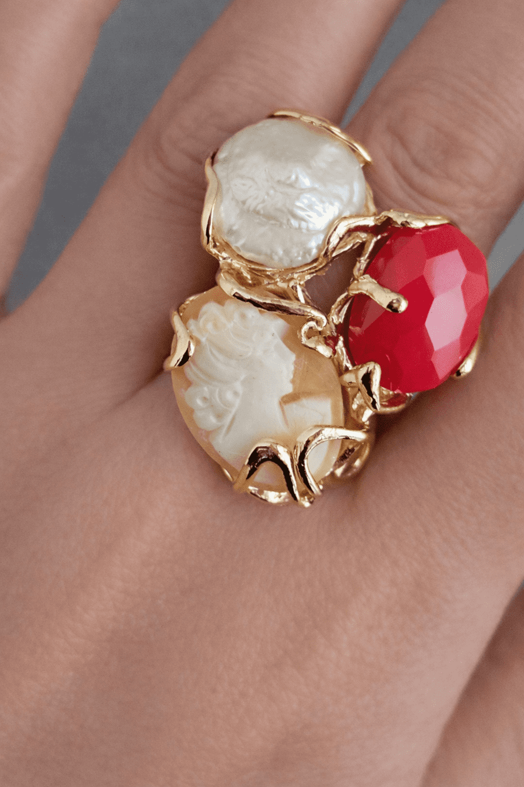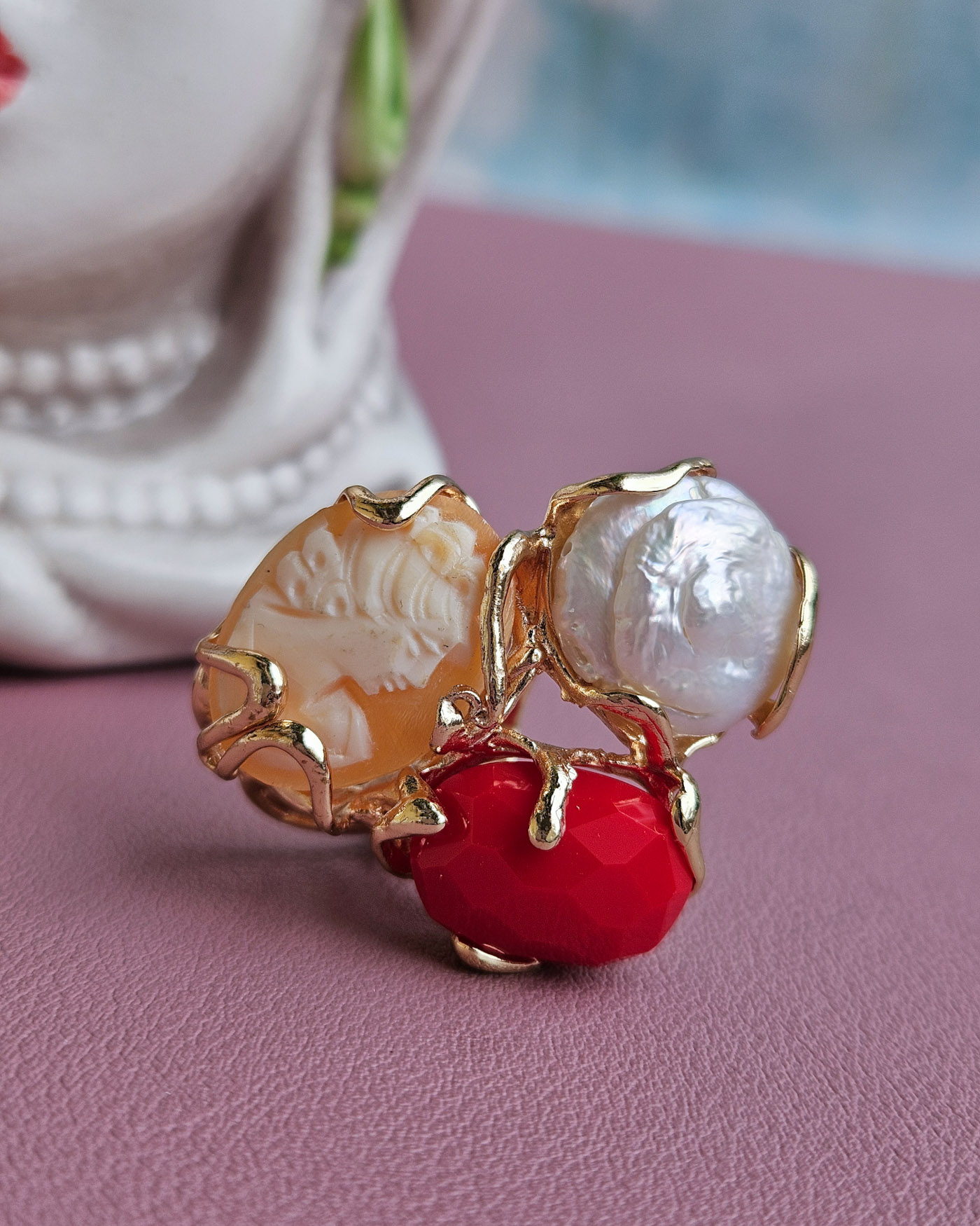 Statement Ring with Red Chrysoberyl Stone, Pearl and Shell Cameo