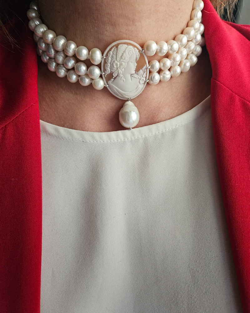 Timeless model, with river pearls and extraordinary original cameo from Torre del Greco. The depicted female figure is extraordinarily beautiful and rich in detail. Placed in the center of the necklace it will be a perfect centerpiece of your necklace and a fine element that will embellish your looks with innate style.