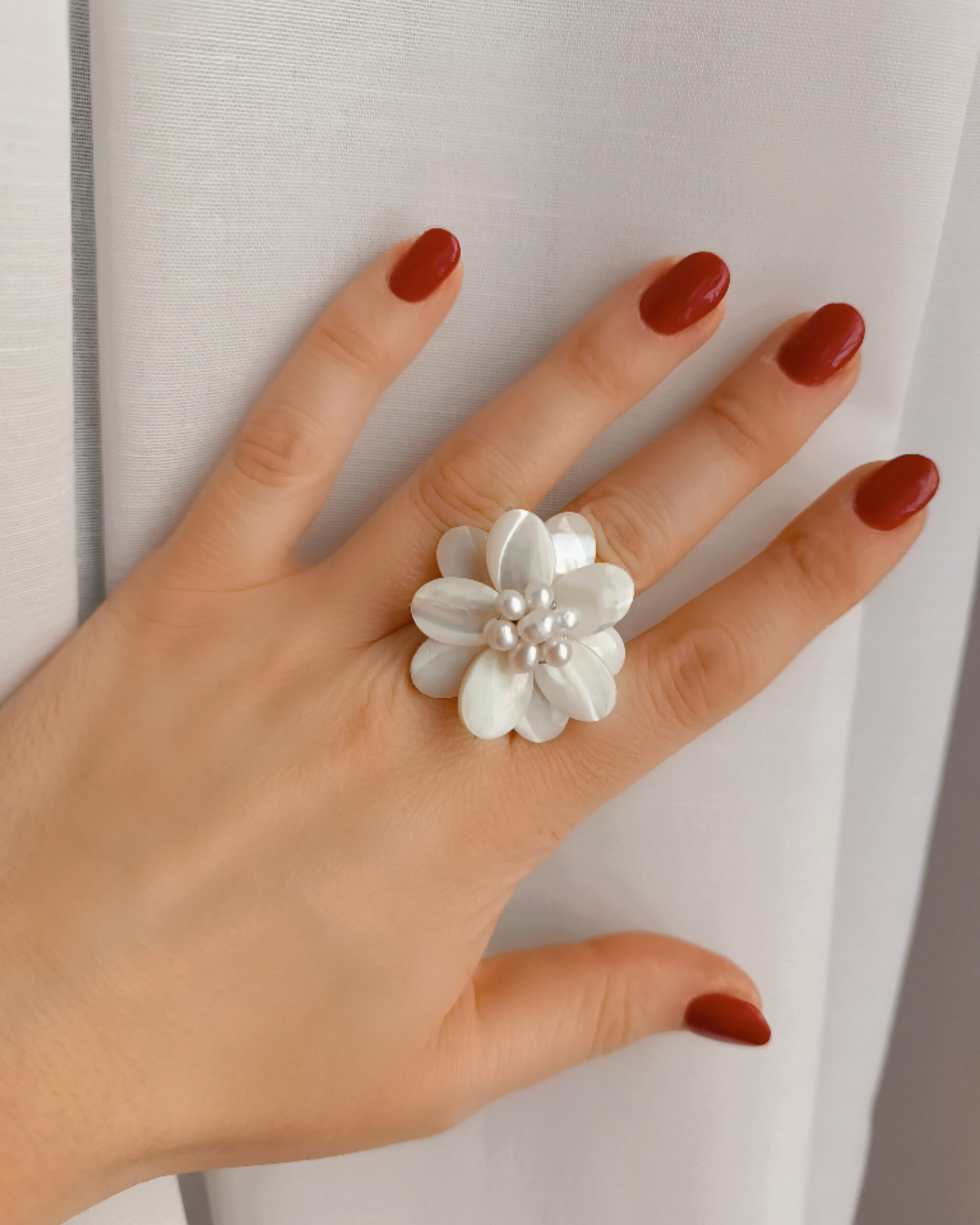 Incantevole anello a fiore realizzato con petali in madreperla e pistillo in perle di fiume.