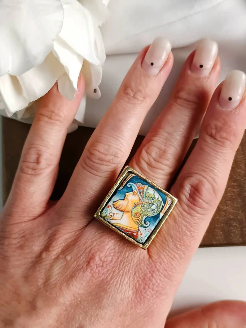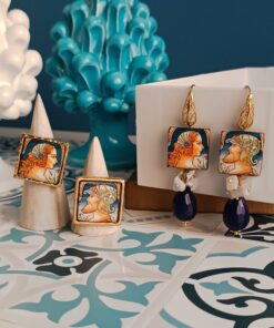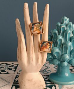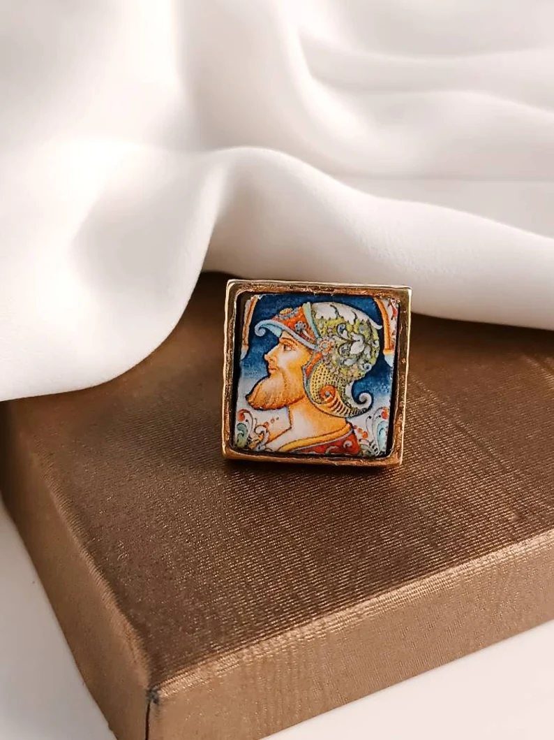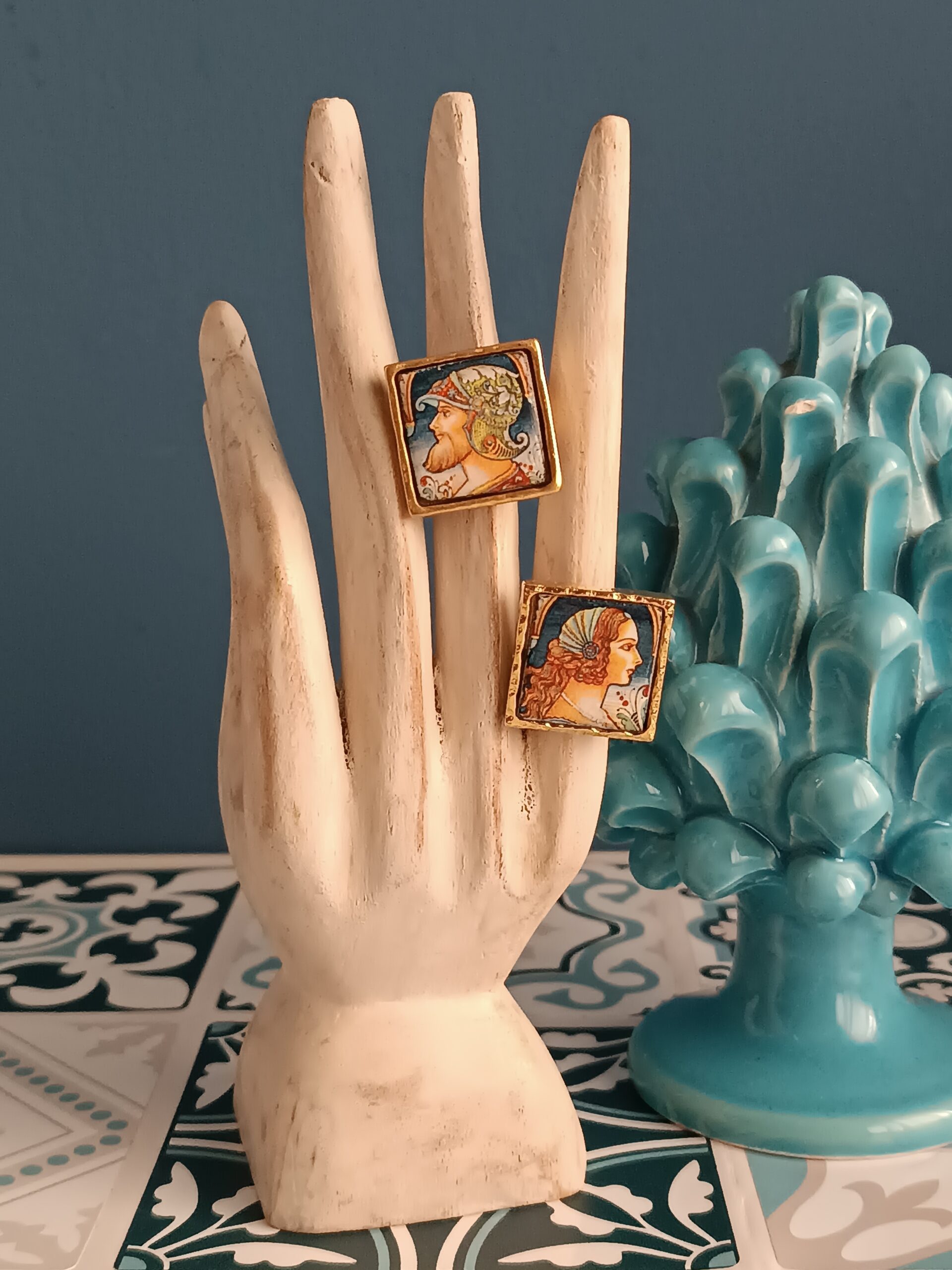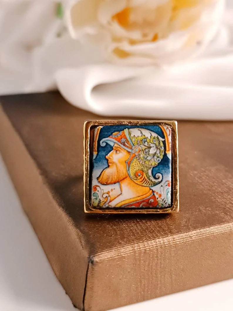 Anello siciliano con mattonella in Ceramica di Caltagirone incastonata in una struttura in Ottone.