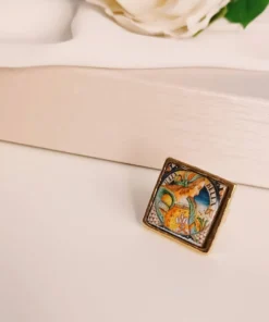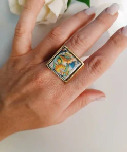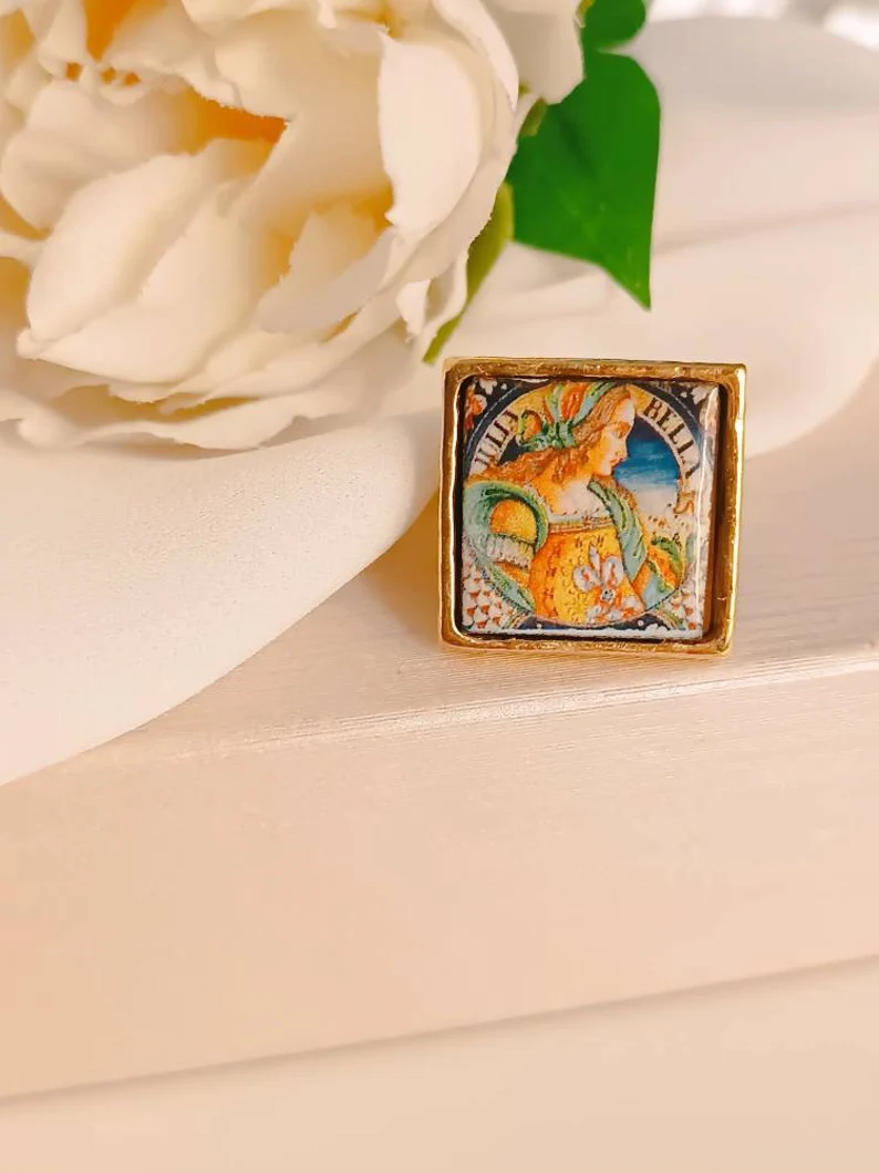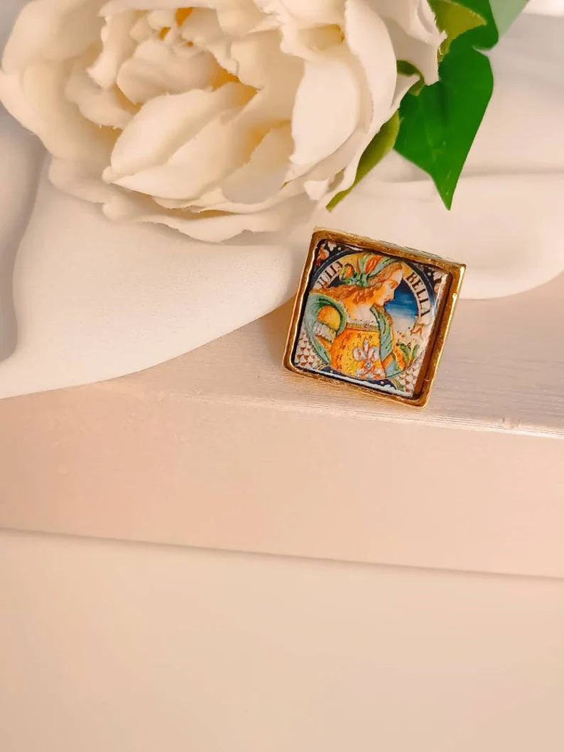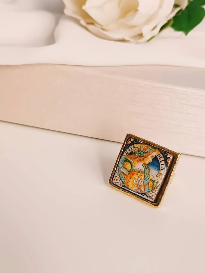 Anello siciliano con mattonella in Ceramica di Caltagirone incastonata in una struttura in Ottone.