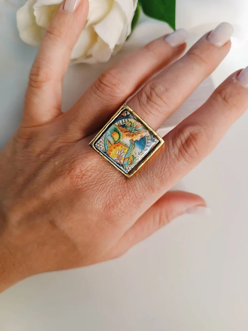 Anello artigianale con Mattonella in Ceramica di Caltagirone