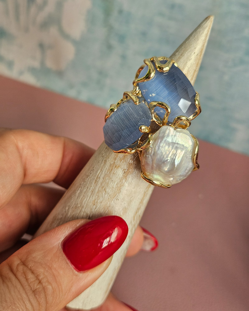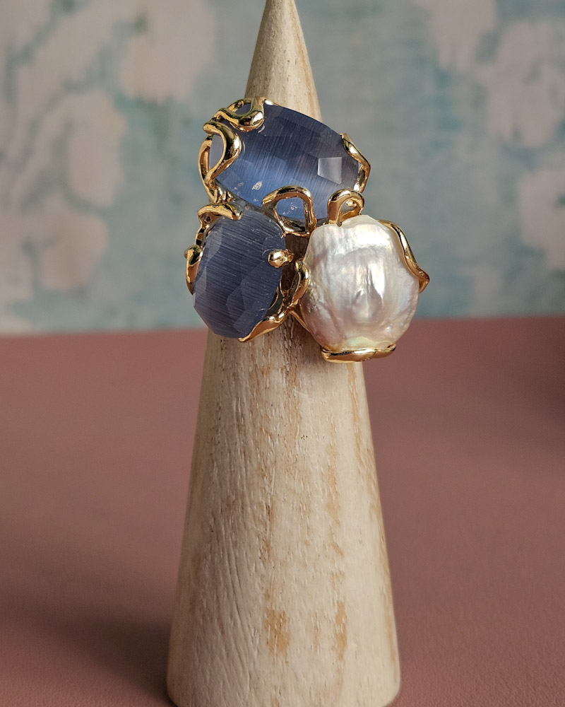 Anello in Ottone con 2pietre di Occhio di Gatto blu e una perla barocca piatta.
