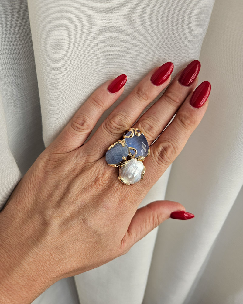 Anello artigianale con Occhio di Gatto Blu e Perla Barocca Piatta