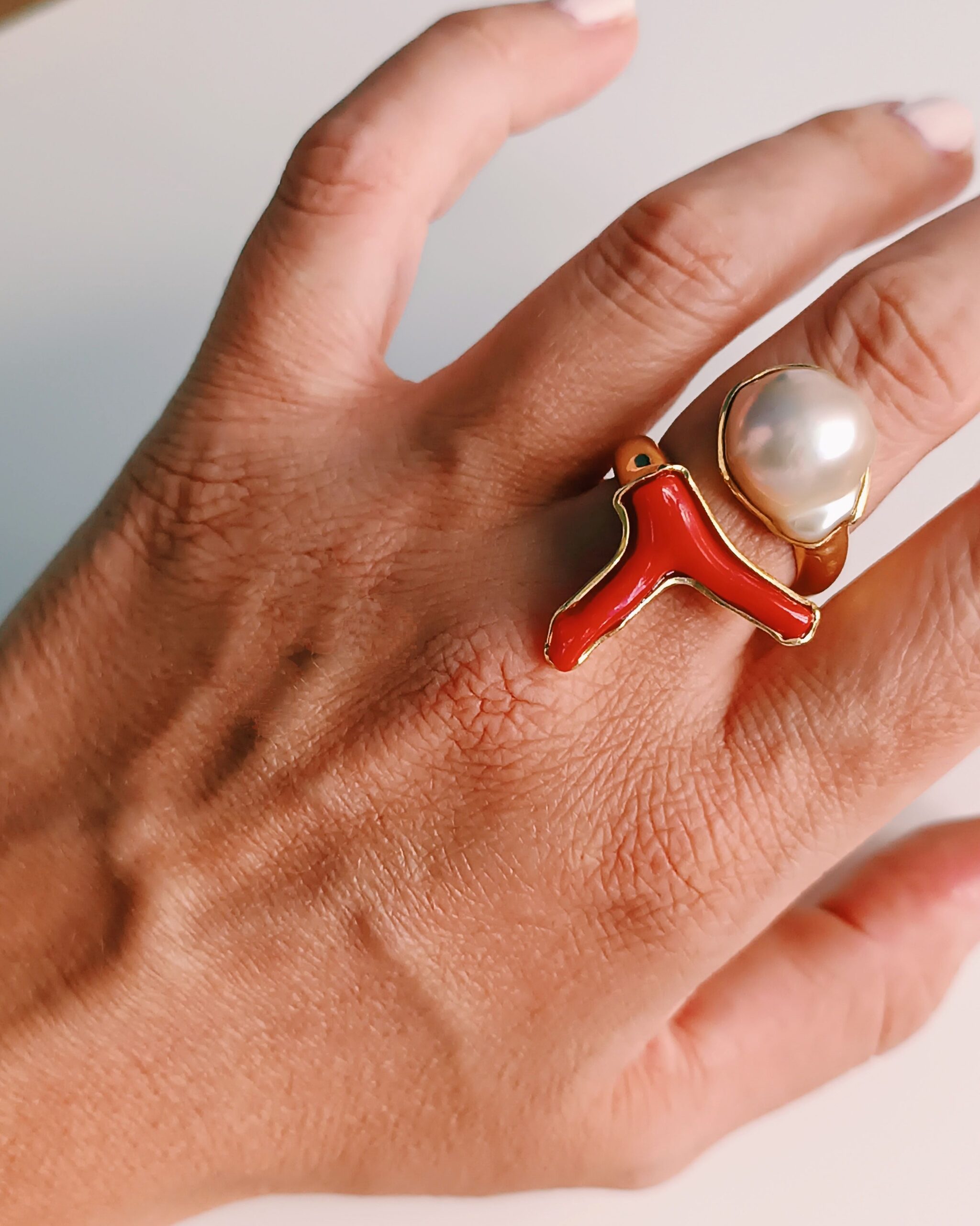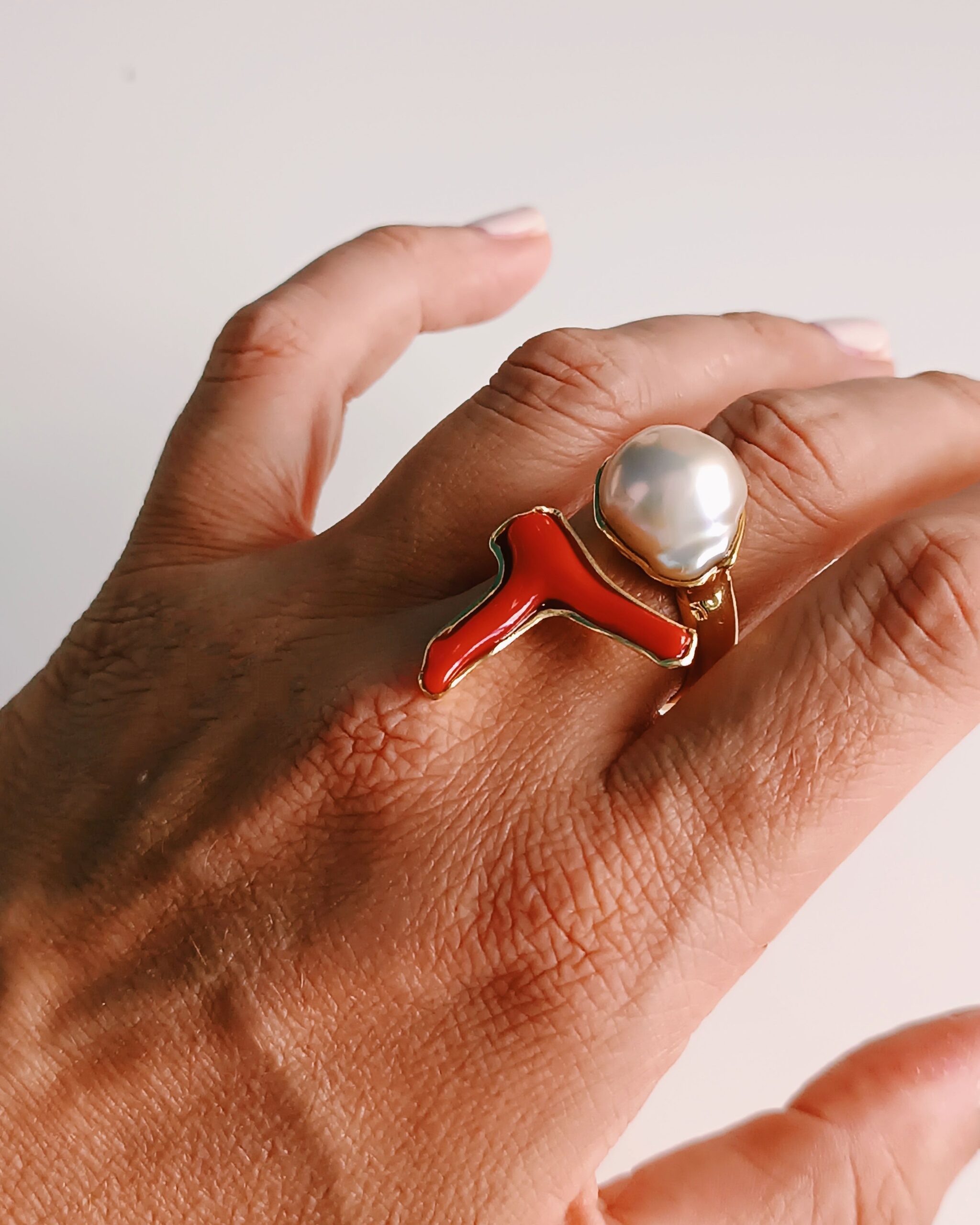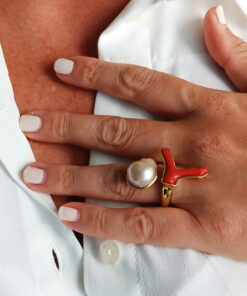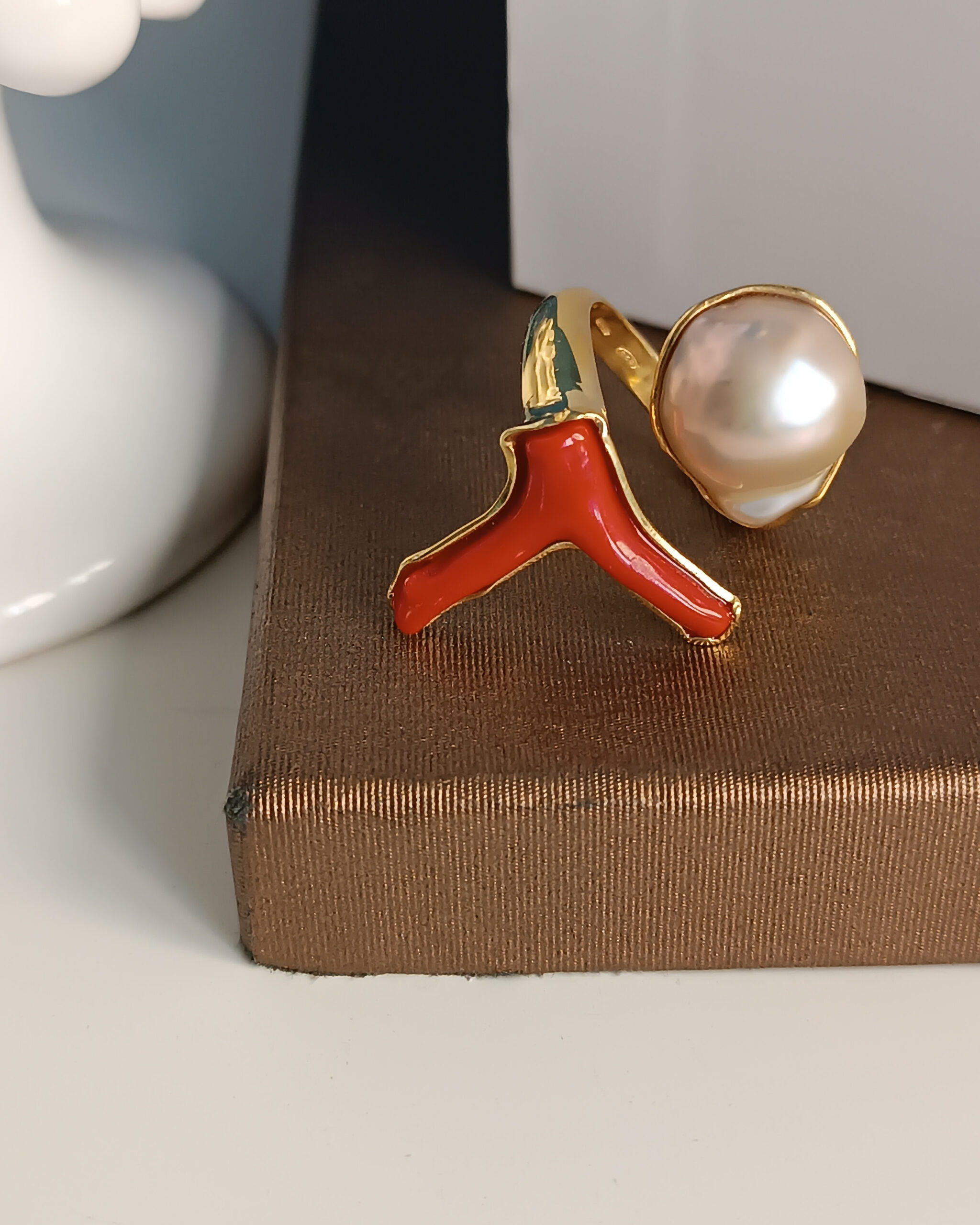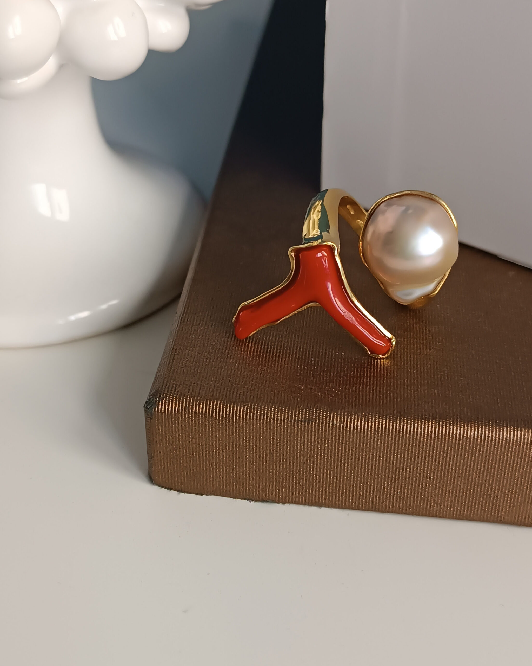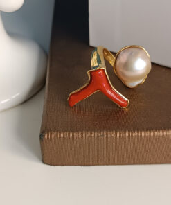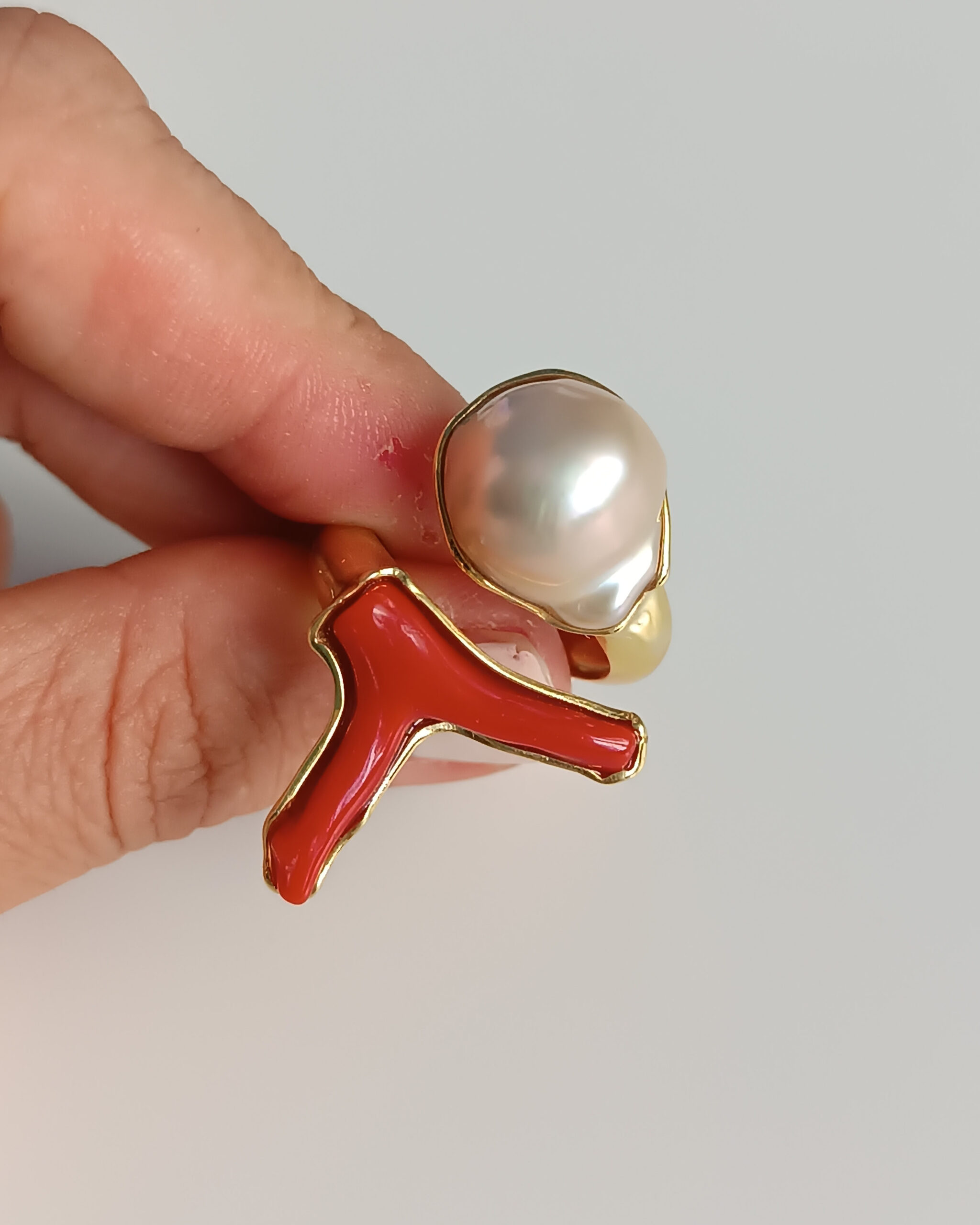Anello in Argento 925 Placcato Oro con Perla di Fiume e Ramo di Corallo