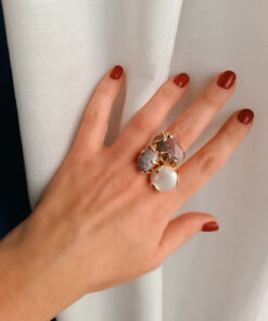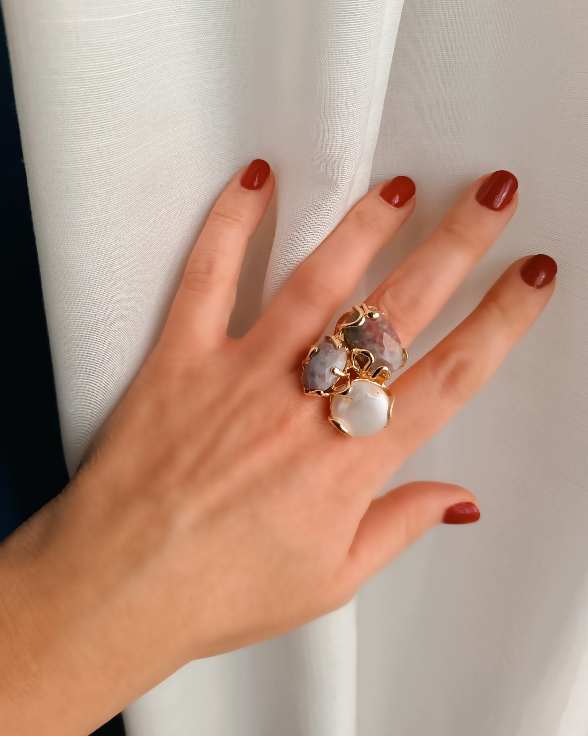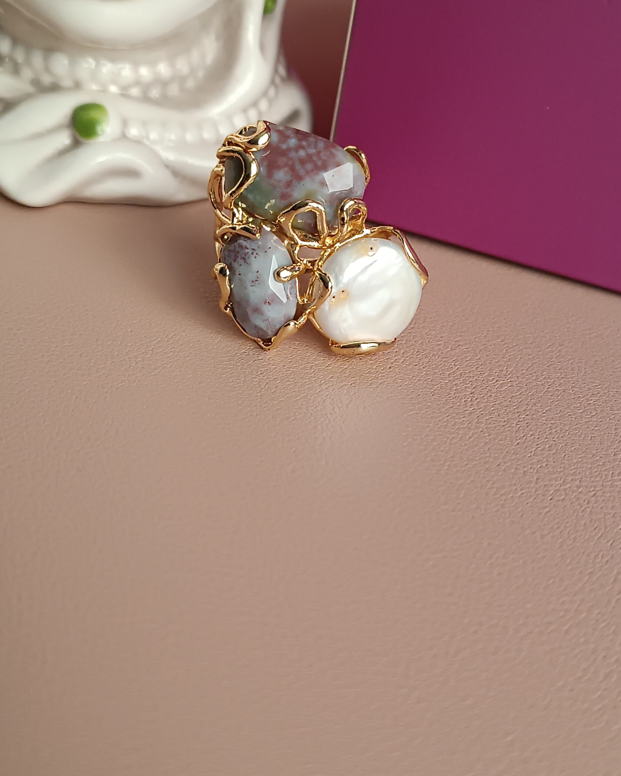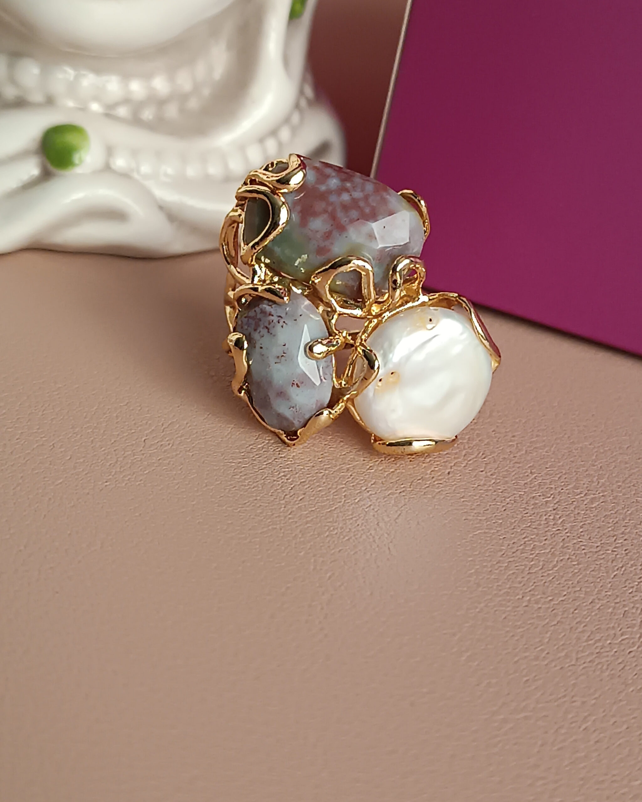 Anello artigianale realizzato con pietre naturali di Agata indiana e Perla.
