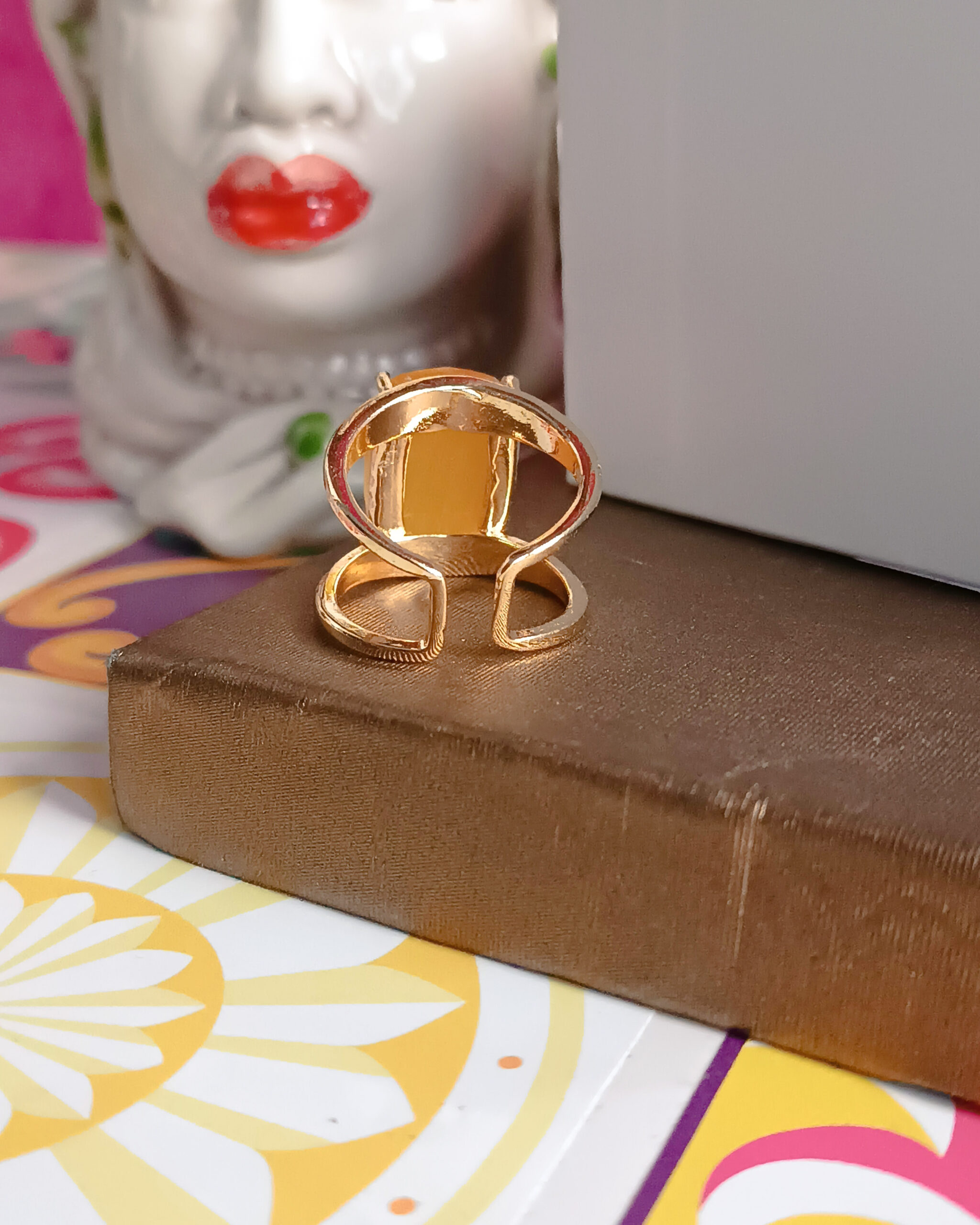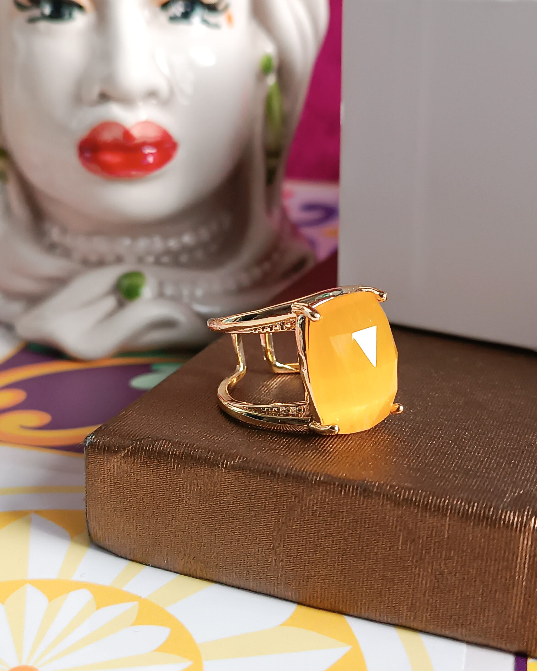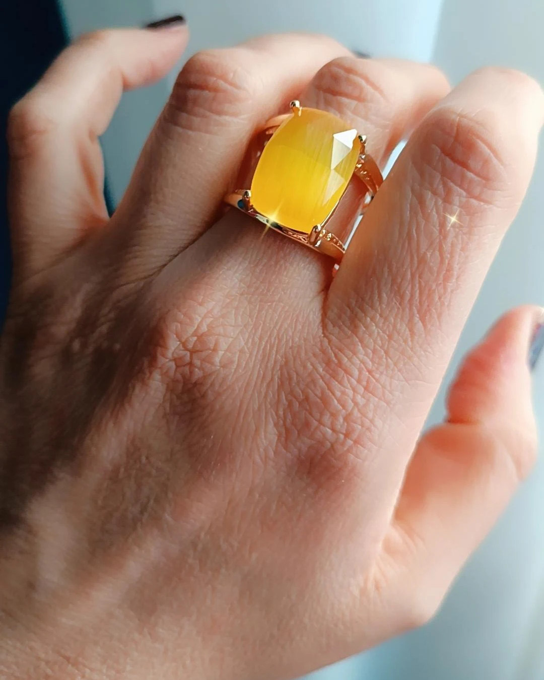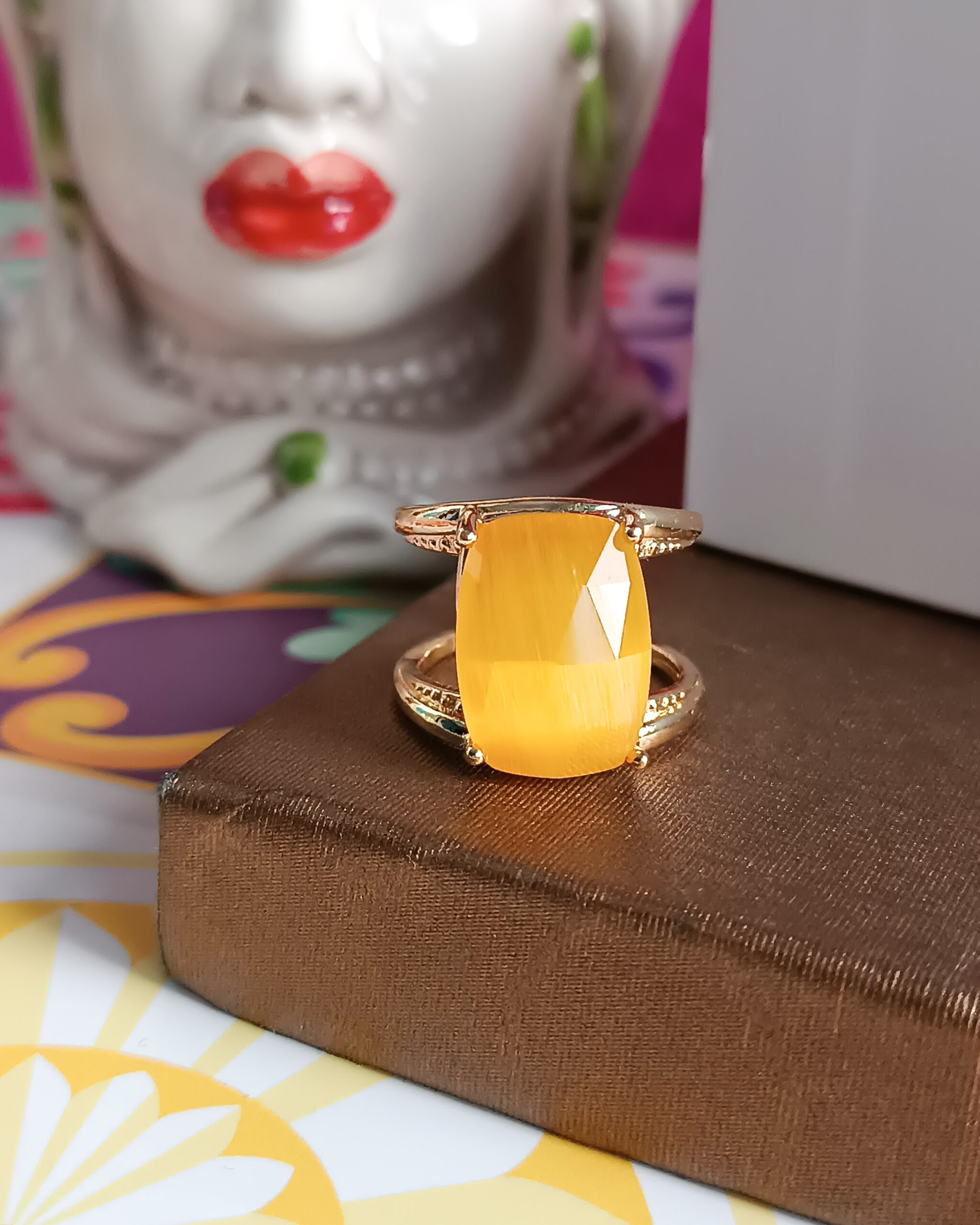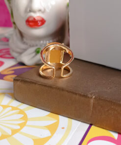 Anello super chic realizzato in Ottone con pietra gialla centrale Occhio di Gatto di forma rettangolare.