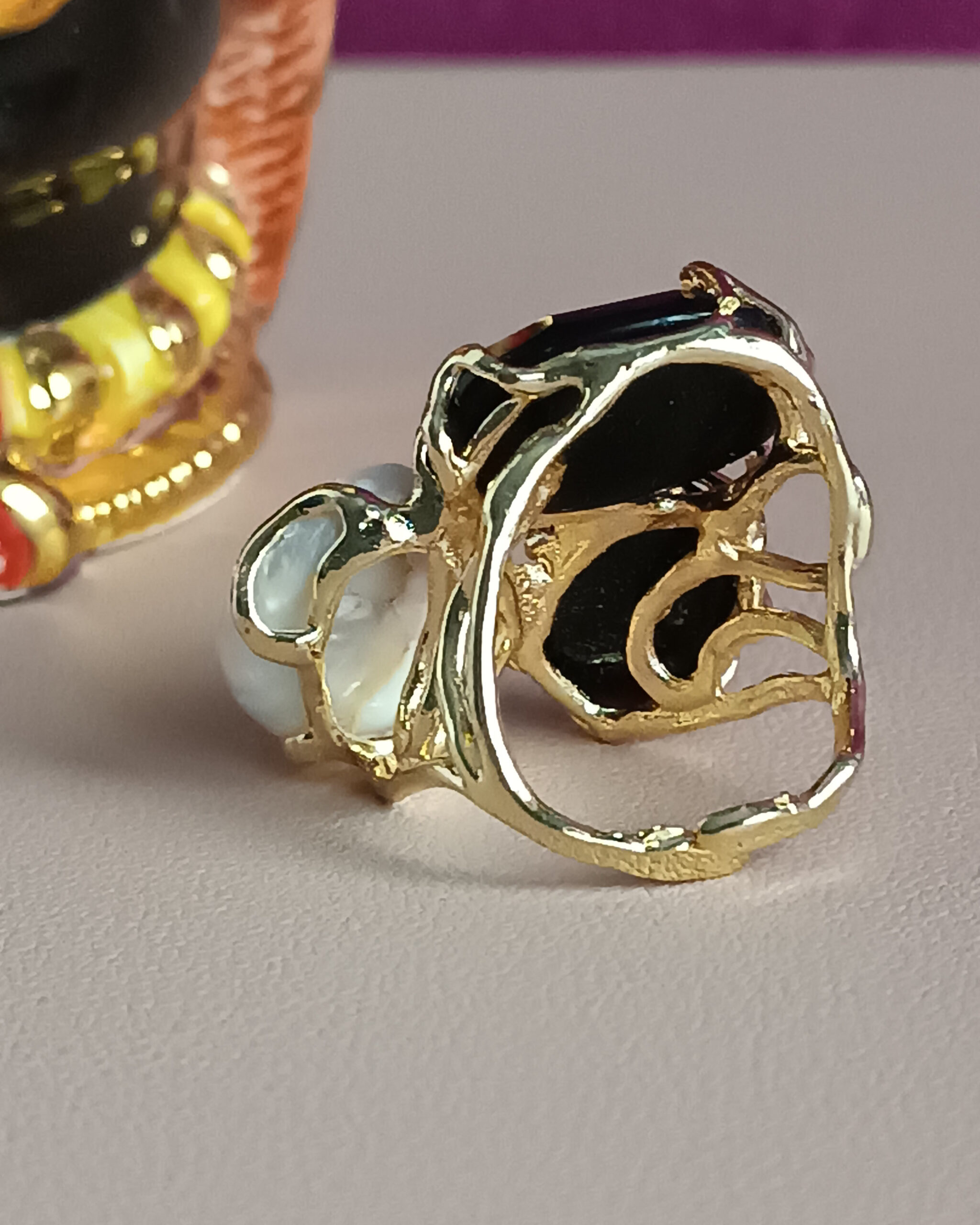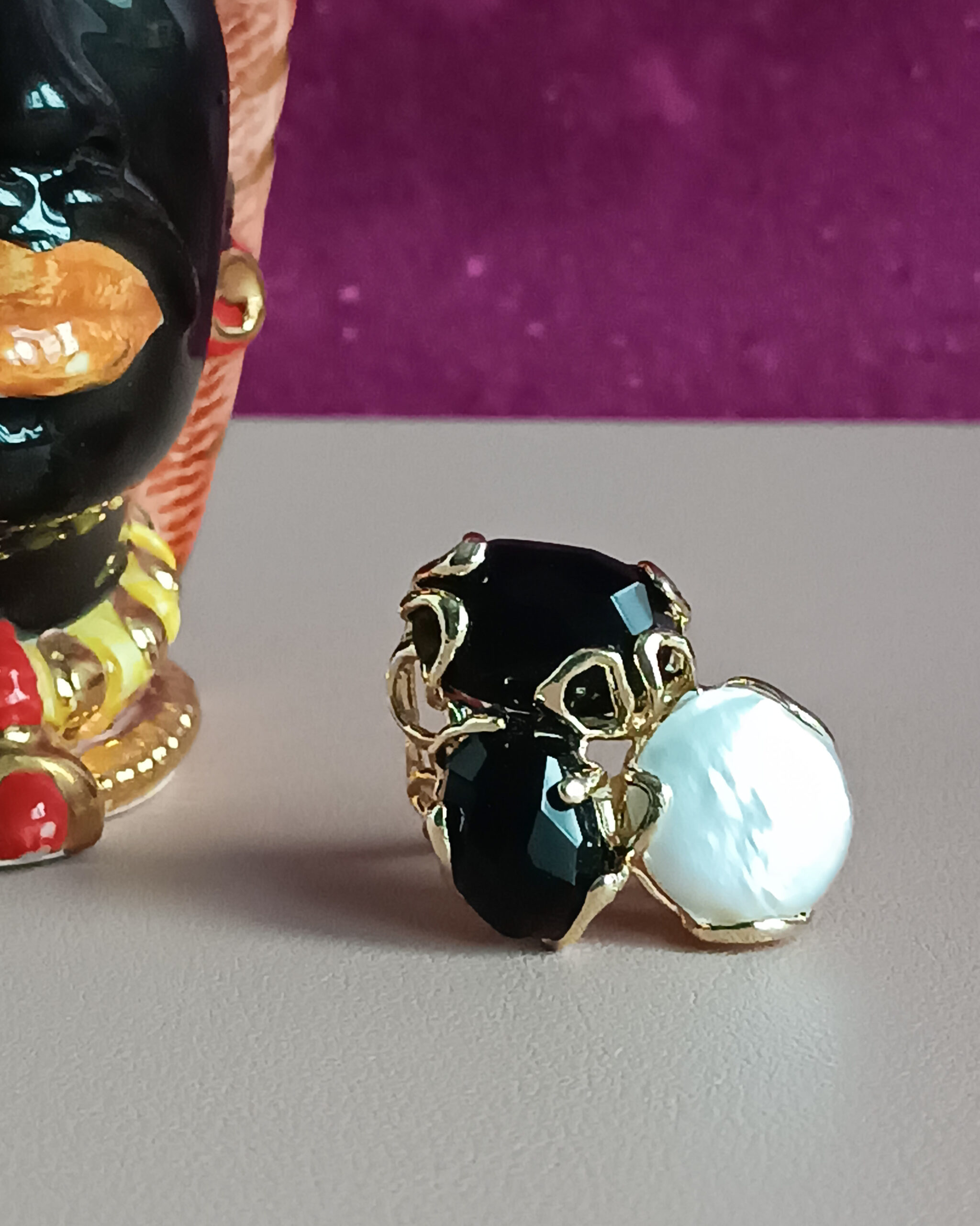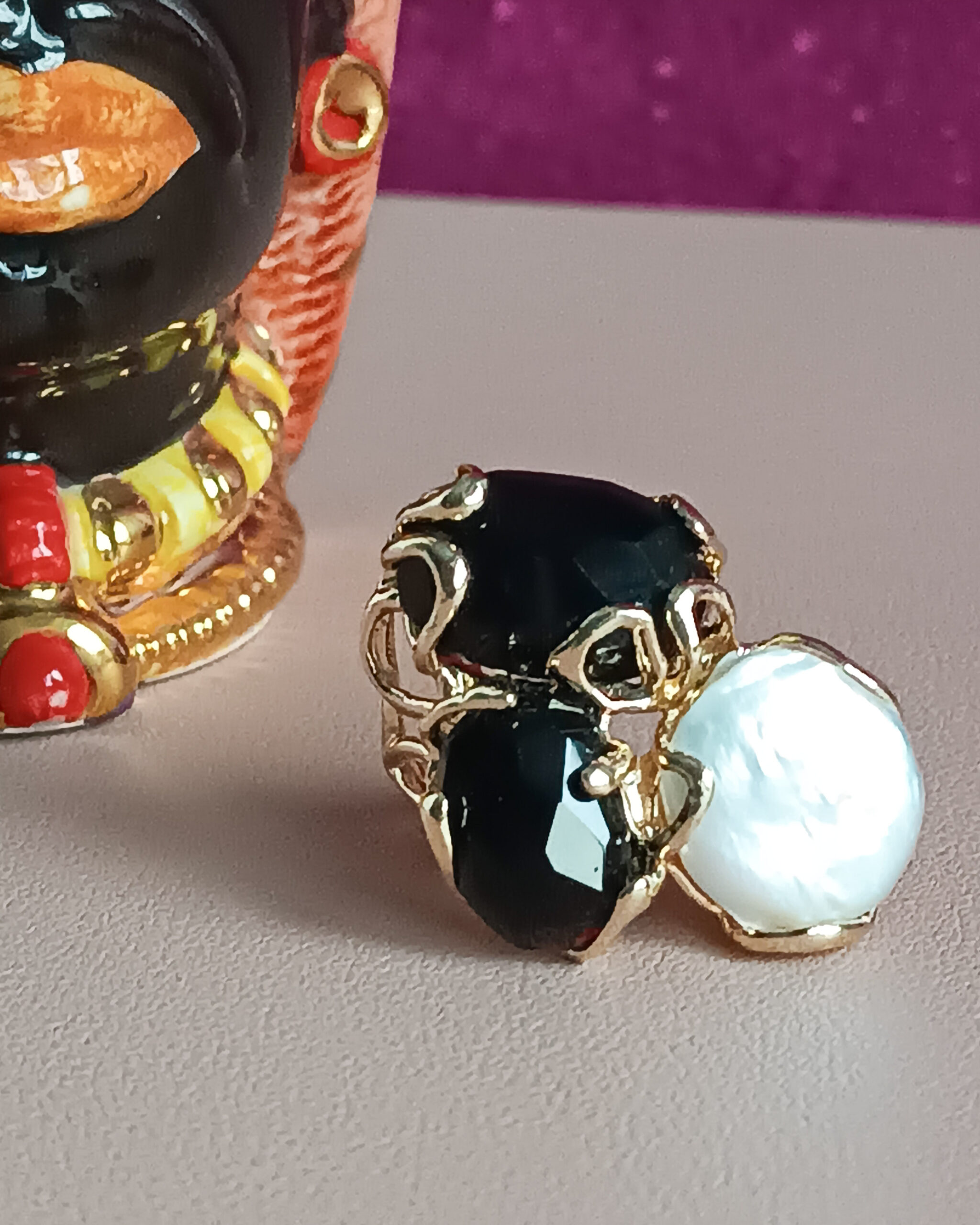 Anello in Ottone Triplo con Onice Nero e Perla Barocca Piatta