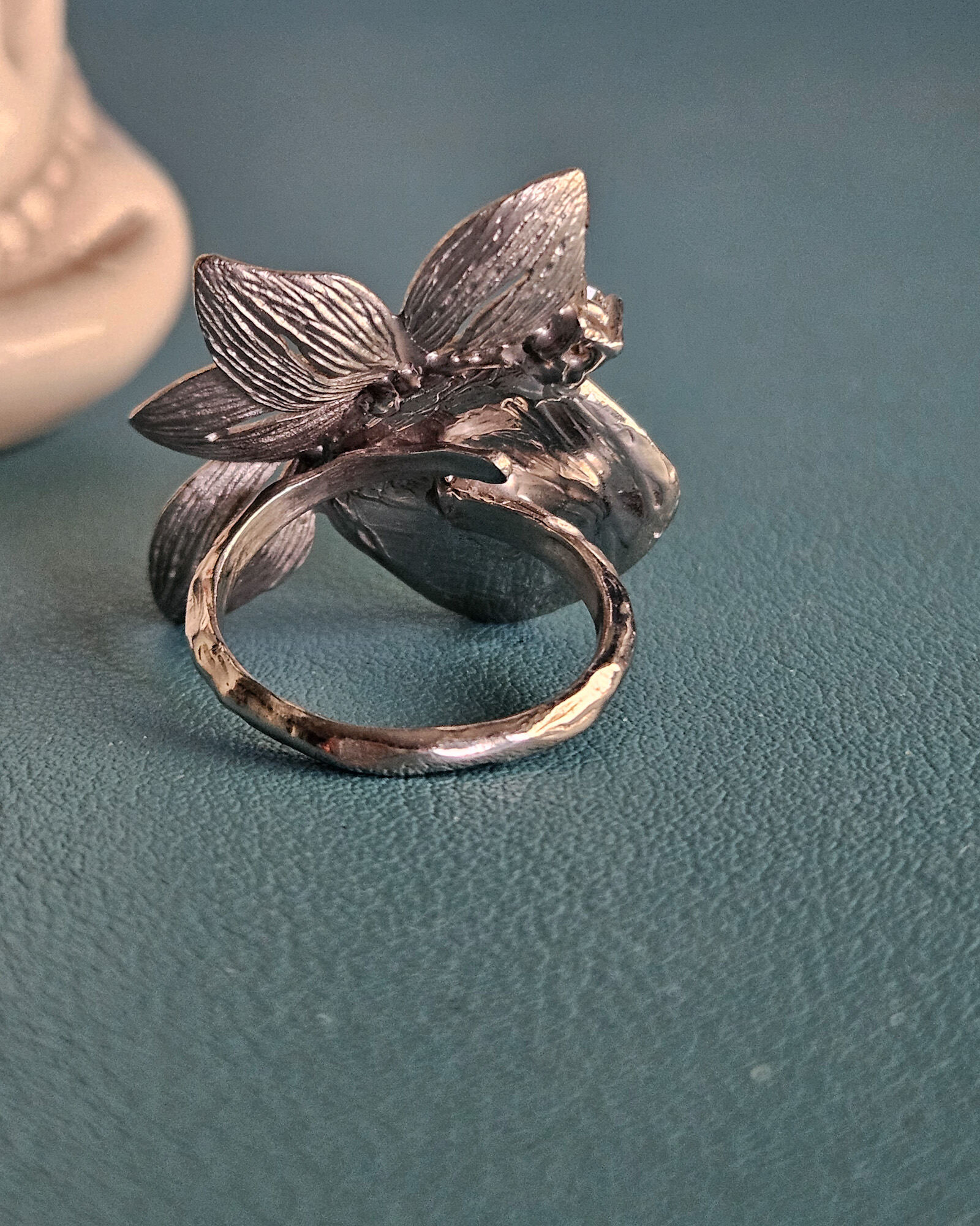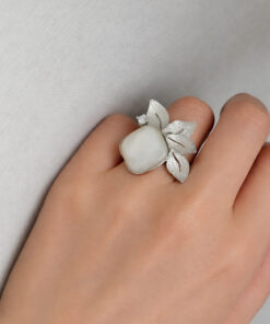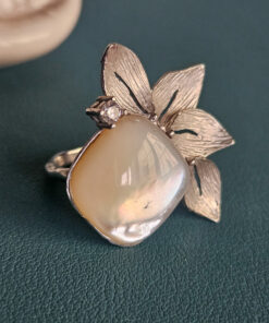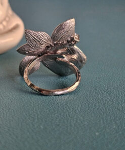 Realizzato in argento 925, questo anello si apre in un delicato mezzo fiore scolpito.