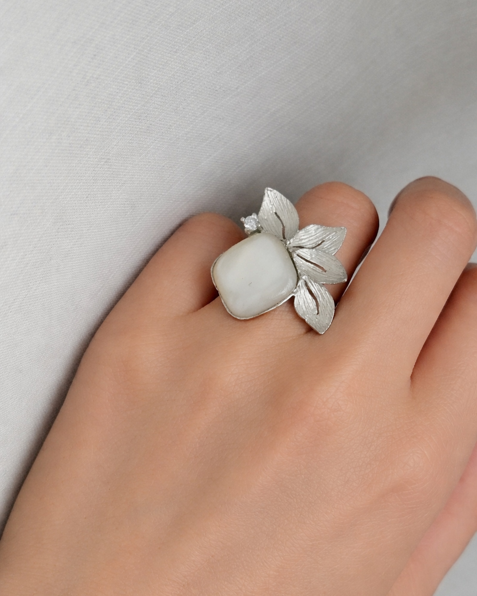 Anello Mezzo Fiore in Argento 925 con Pietra di Luna e Zircone