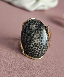 Meraviglioso anello con CORALLO AGATIZZATO, un corallo fossile che, nel corso di milioni di anni, è stato sostituito molecola per molecola da silice trasformandosi in una pietra dura, simile all’agata. Questo processo, chiamato permineralizzazione, avviene quando i resti del corallo vengono sepolti e attraversati da acque ricche di minerali. Mantiene spesso le strutture originarie del corallo (i piccoli alveoli o “favi”), ma con le venature e i colori tipici dell’agata