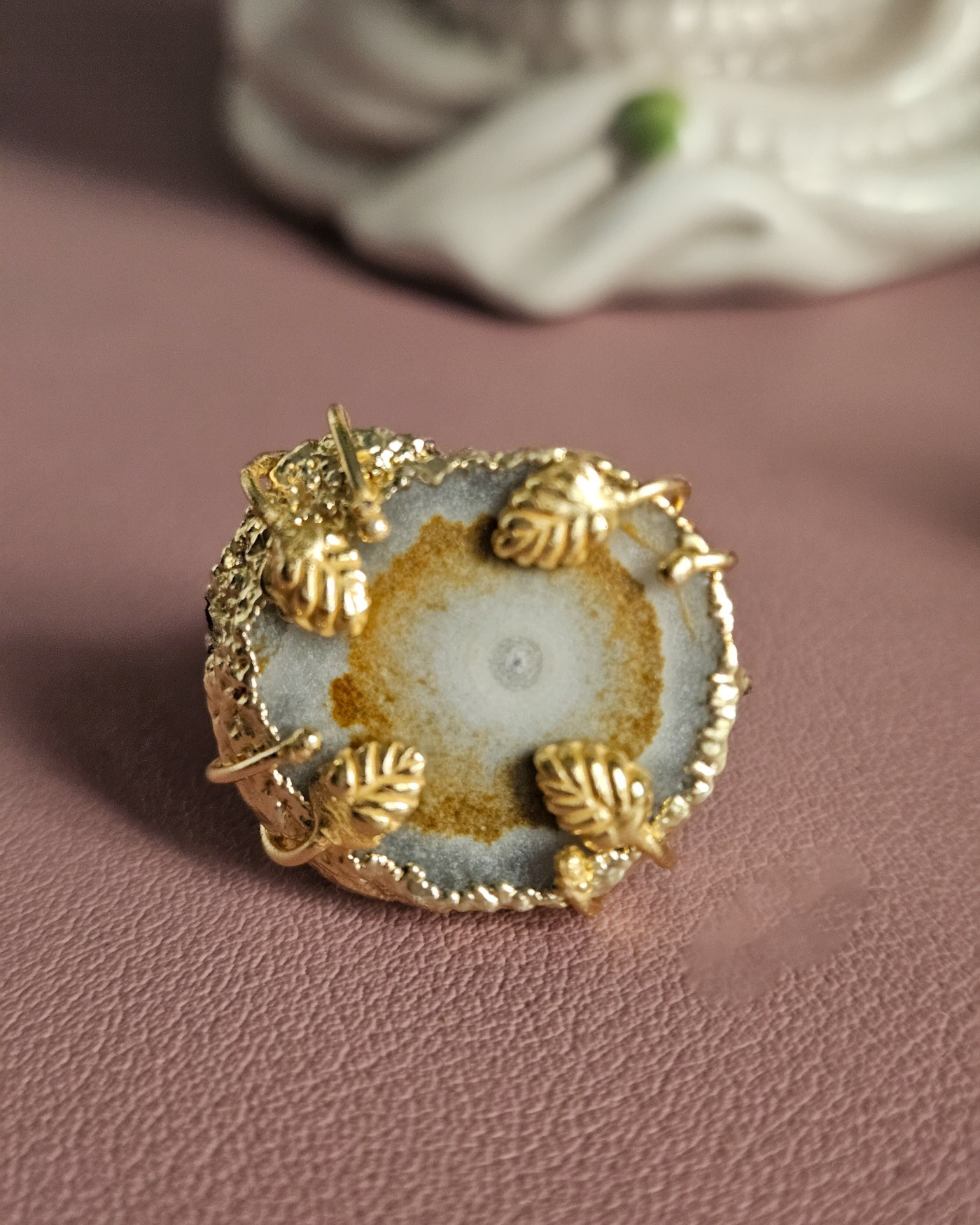 Distinguiti con stile con questo raffinato anello realizzato con autentico geode naturale dal vibrante colore bianco. Ogni pietra è unica, tagliata a mano per preservare la sua bellezza naturale e incorniciata con una elegante finitura dorata che ne esalta i contorni irregolari e la texture cristallina.