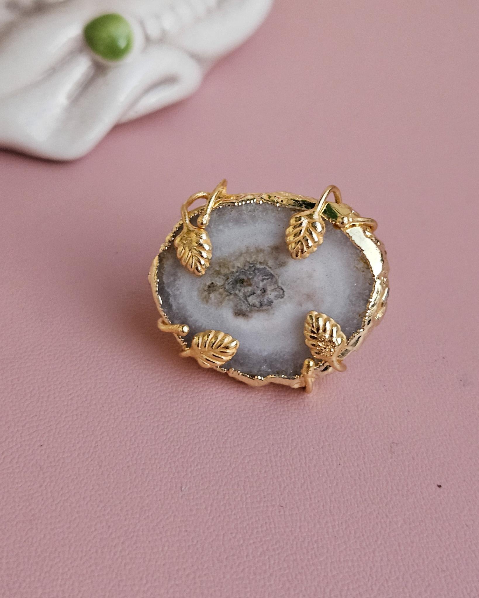 Distinguiti con stile con questo raffinato anello realizzato con autentico geode naturale dal colore bianco. Ogni pietra è unica, tagliata a mano per preservare la sua bellezza naturale e incorniciata con una elegante finitura dorata che ne esalta i contorni irregolari e la texture cristallina.