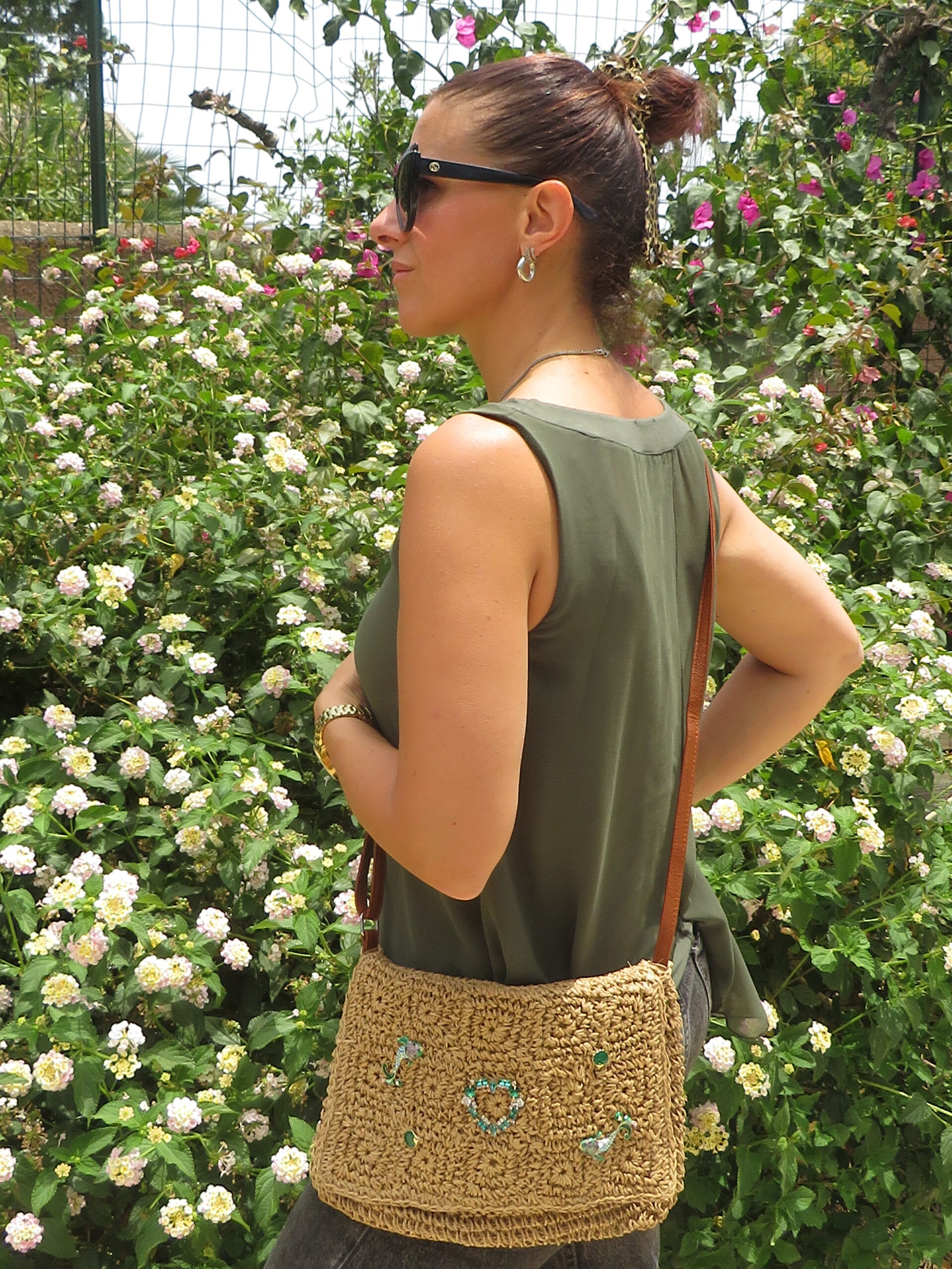 Borsa artigianale in Palma nana con pesciolini e conchiglie.