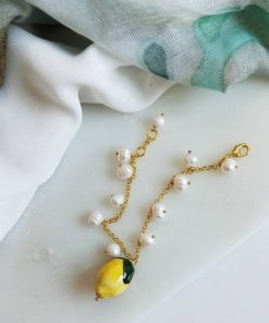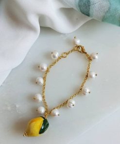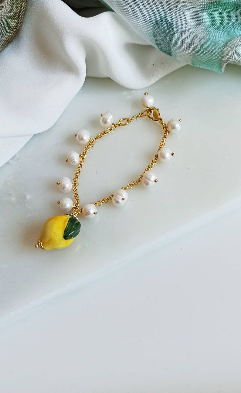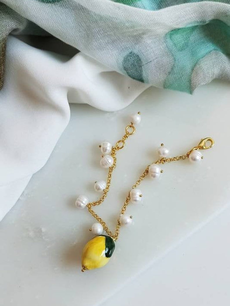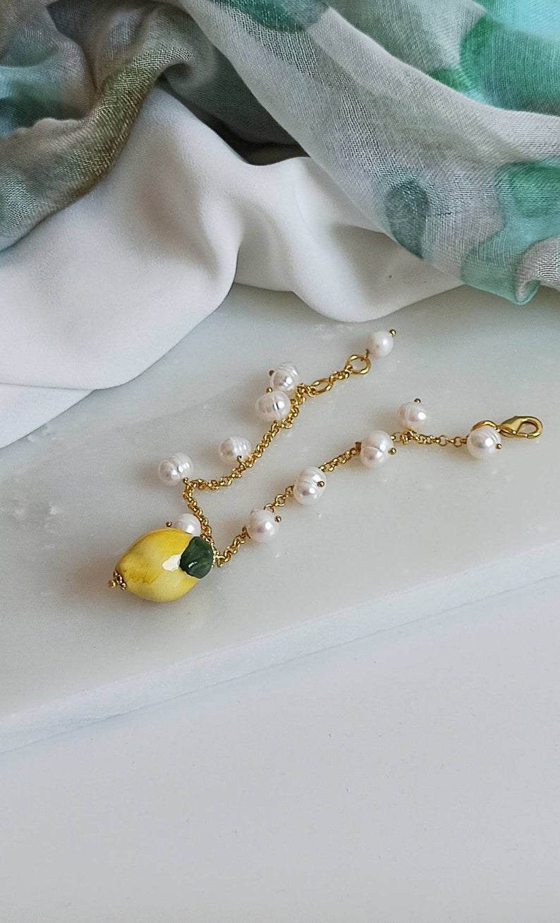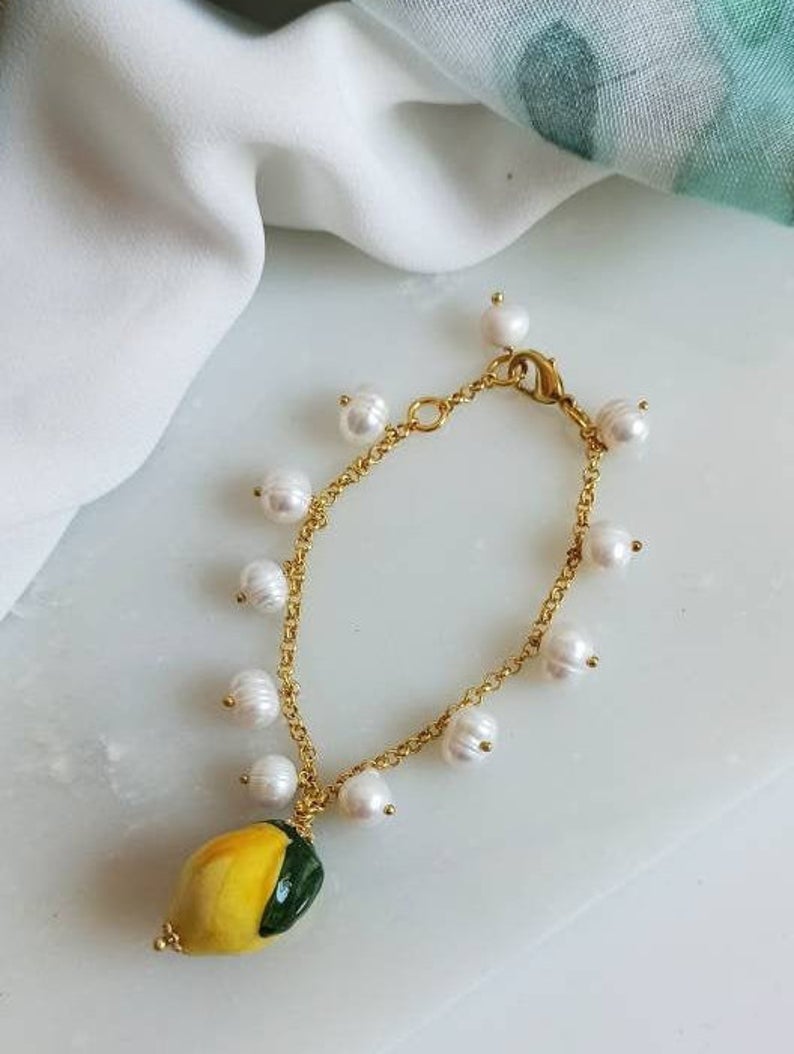 Delizioso braccialetto a catena con perle e limone in ceramica di Caltagirone.