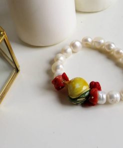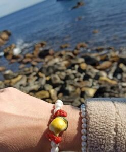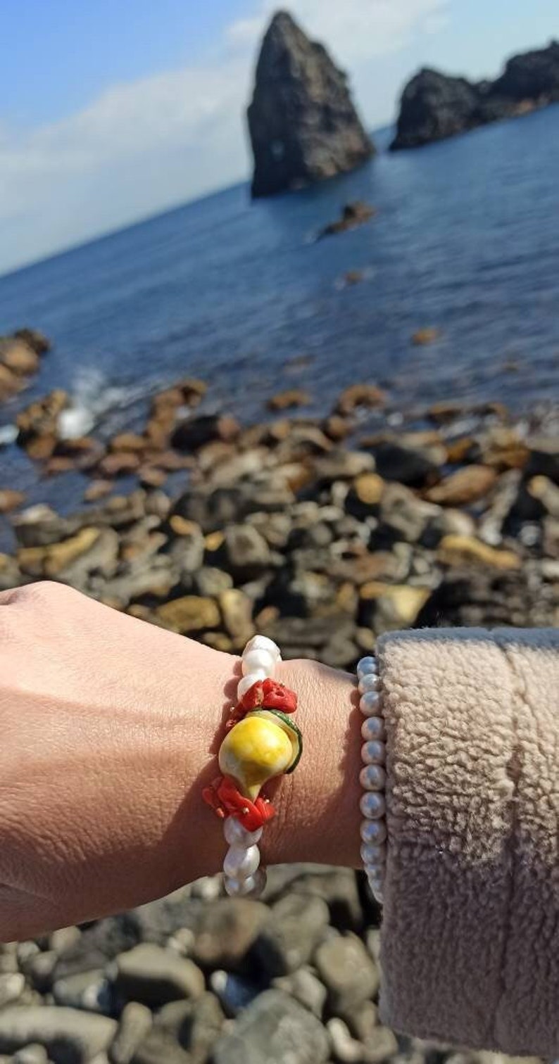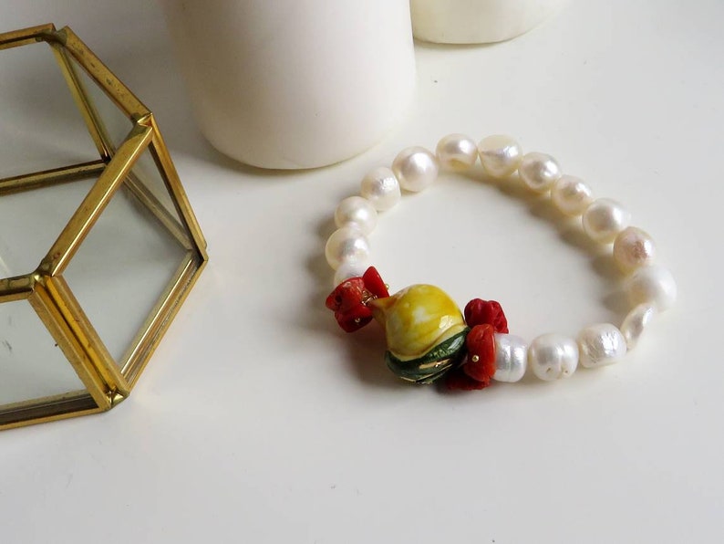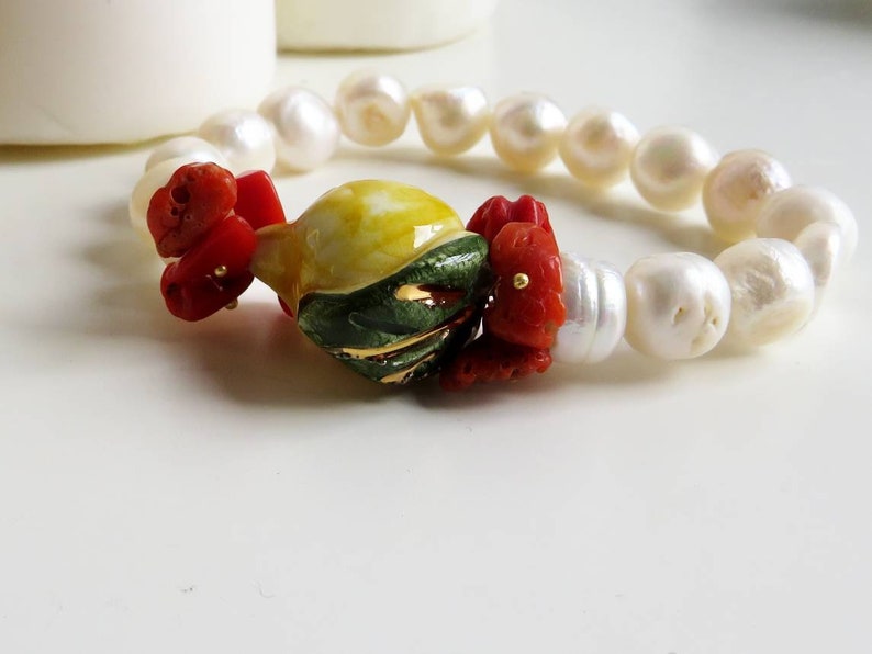 Bracciale Elastico di Perle con Limone in Ceramica di Caltagirone