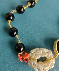Al centro del bracciale spicca un grappolo circolare di perle naturali dalla forma irregolare. Le perle donano luce e movimento al gioiello, creando un contrasto raffinato con il nero profondo dell’onice.