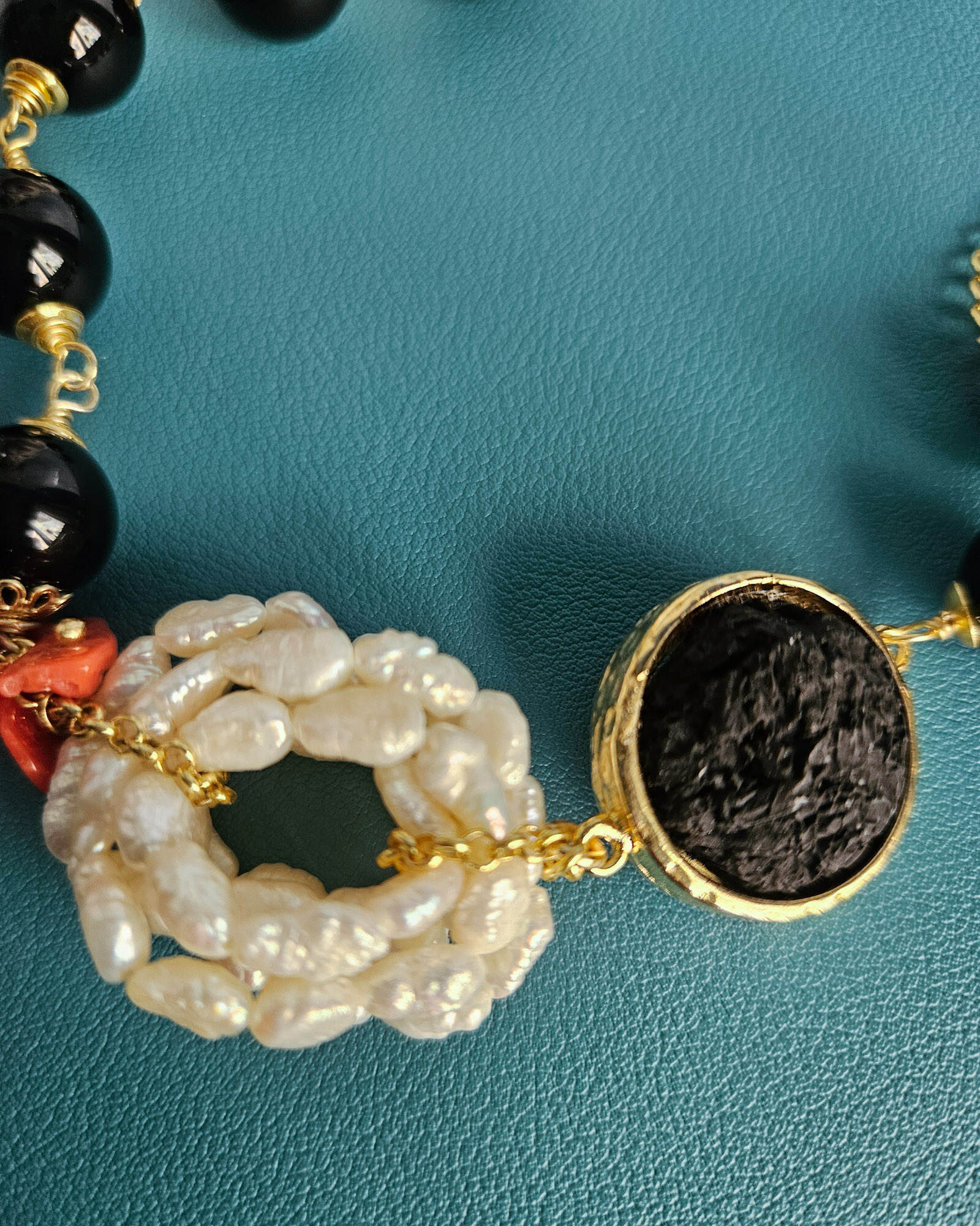 Un gioiello artigianale dal carattere deciso, perfetto da indossare con una camicia bianca, una giacca sartoriale o un outfit total black, dove il contrasto tra nero, rosso e perle risulta particolarmente valorizzato.
