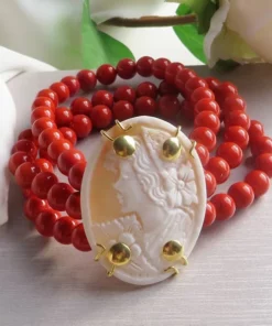 Eleganza e tradizione si incontrano in questo bracciale raffinato, perfetto per chi cerca un gioiello unico e sofisticato. La combinazione di pasta di corallo e cammeo centrale dona al pezzo un carattere distintivo, adatto a qualsiasi occasione.