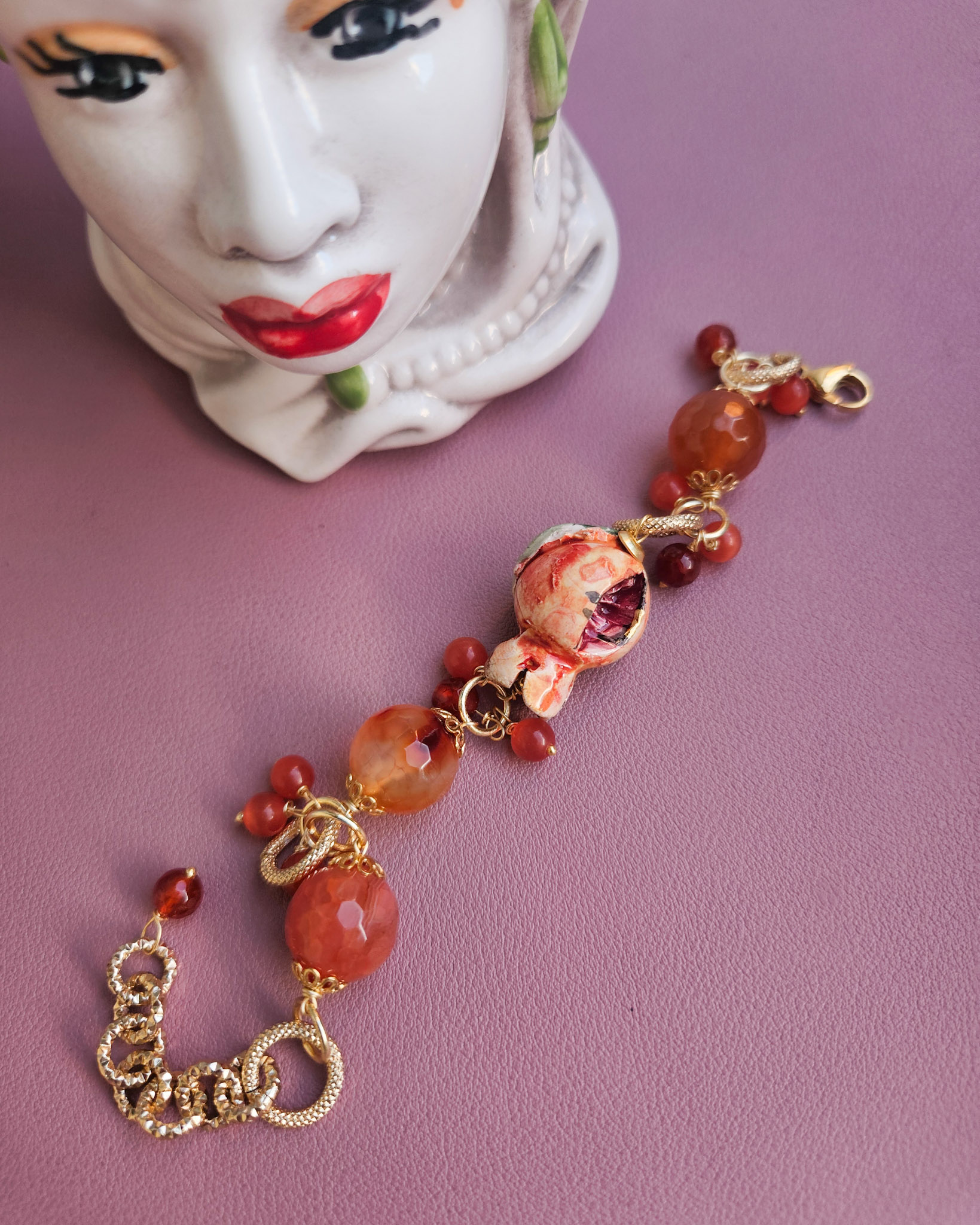 Bracciale siciliano realizzato con catena, corniola e melograno in Ceramica di Caltagirone.