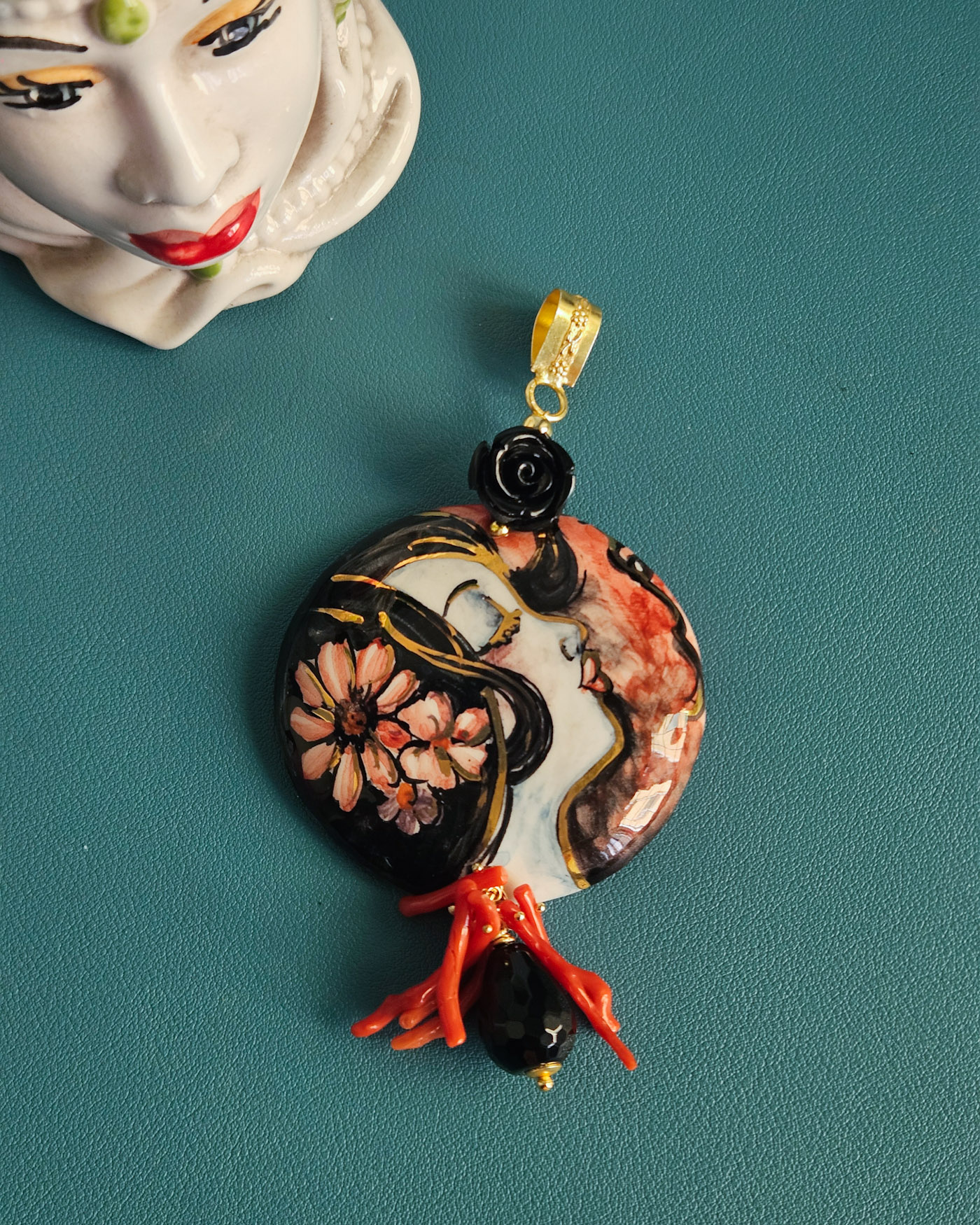 Ciondolo in Ceramica di Caltagirone con Onice e Corallo Rosso