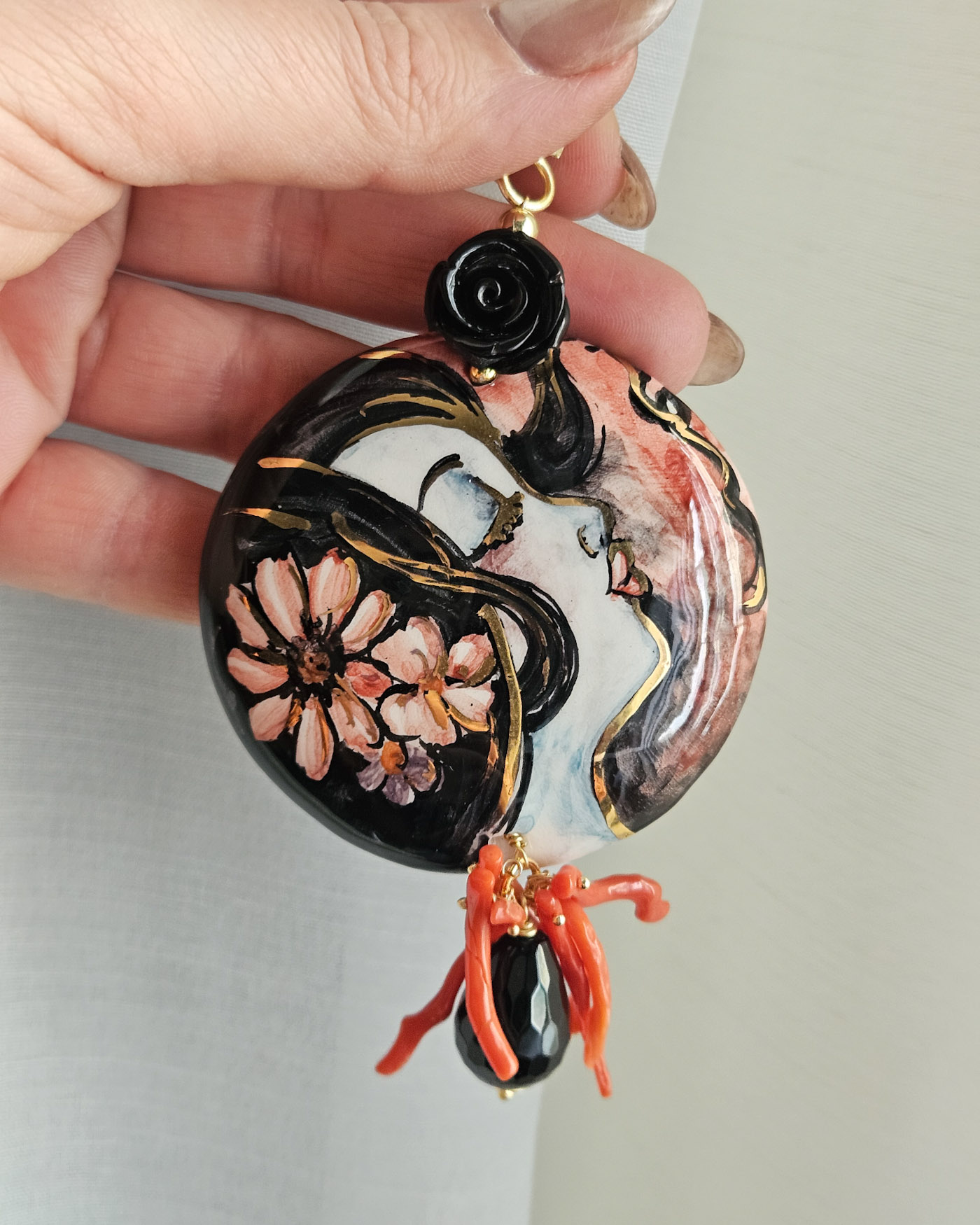 Il ciondolo è realizzato in ceramica dipinta a mano, di forma circolare, e raffigura un volto dall’espressione dolce e dalle vibes romantiche e sognatrici. I colori predominanti sono il rosso e il nero.