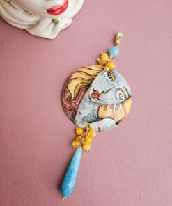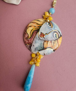 Il ciondolo è realizzato in ceramica dipinta a mano, di forma circolare, e raffigura un volto dallo stile artistico moderno. I colori sono decisi e vivaci.