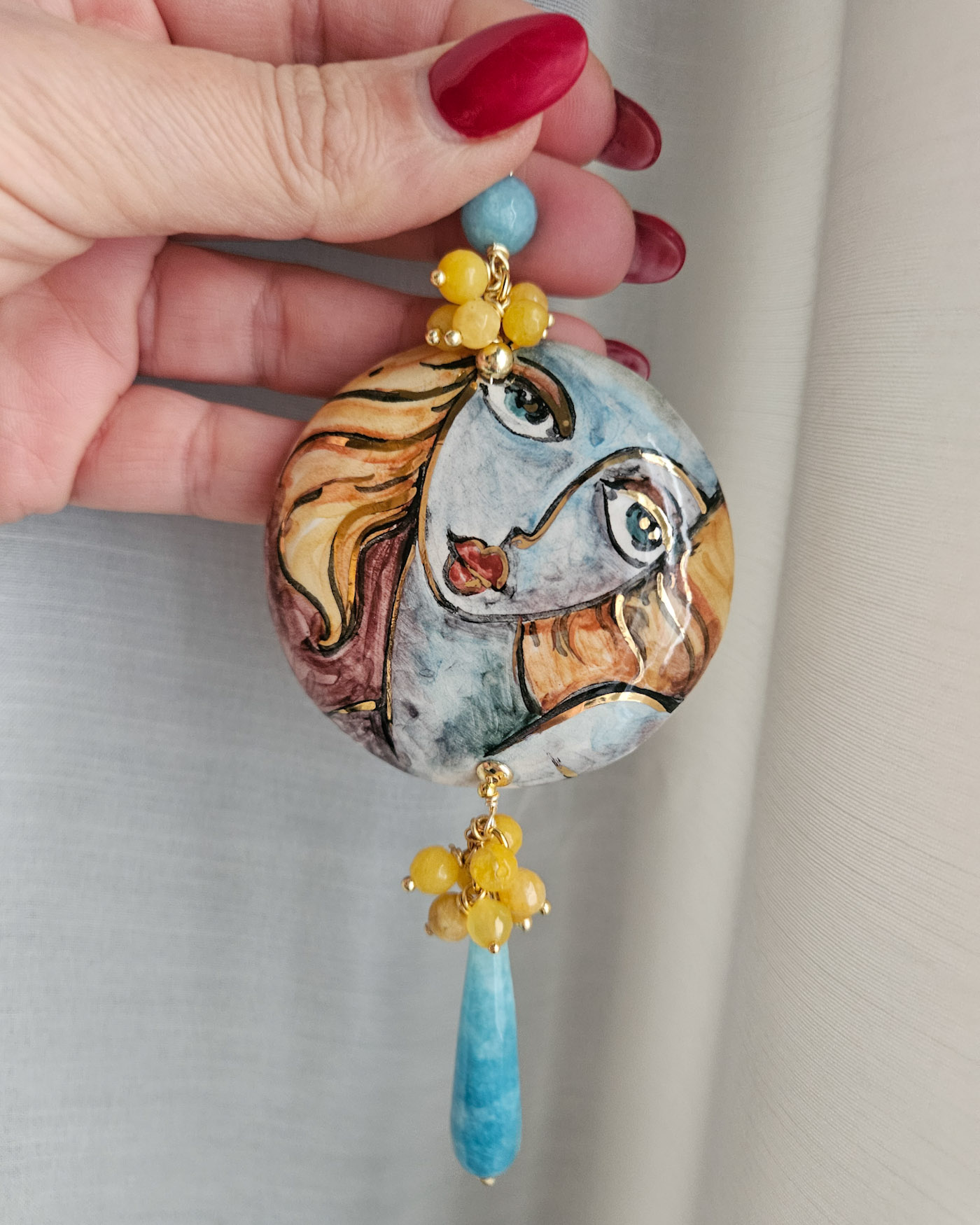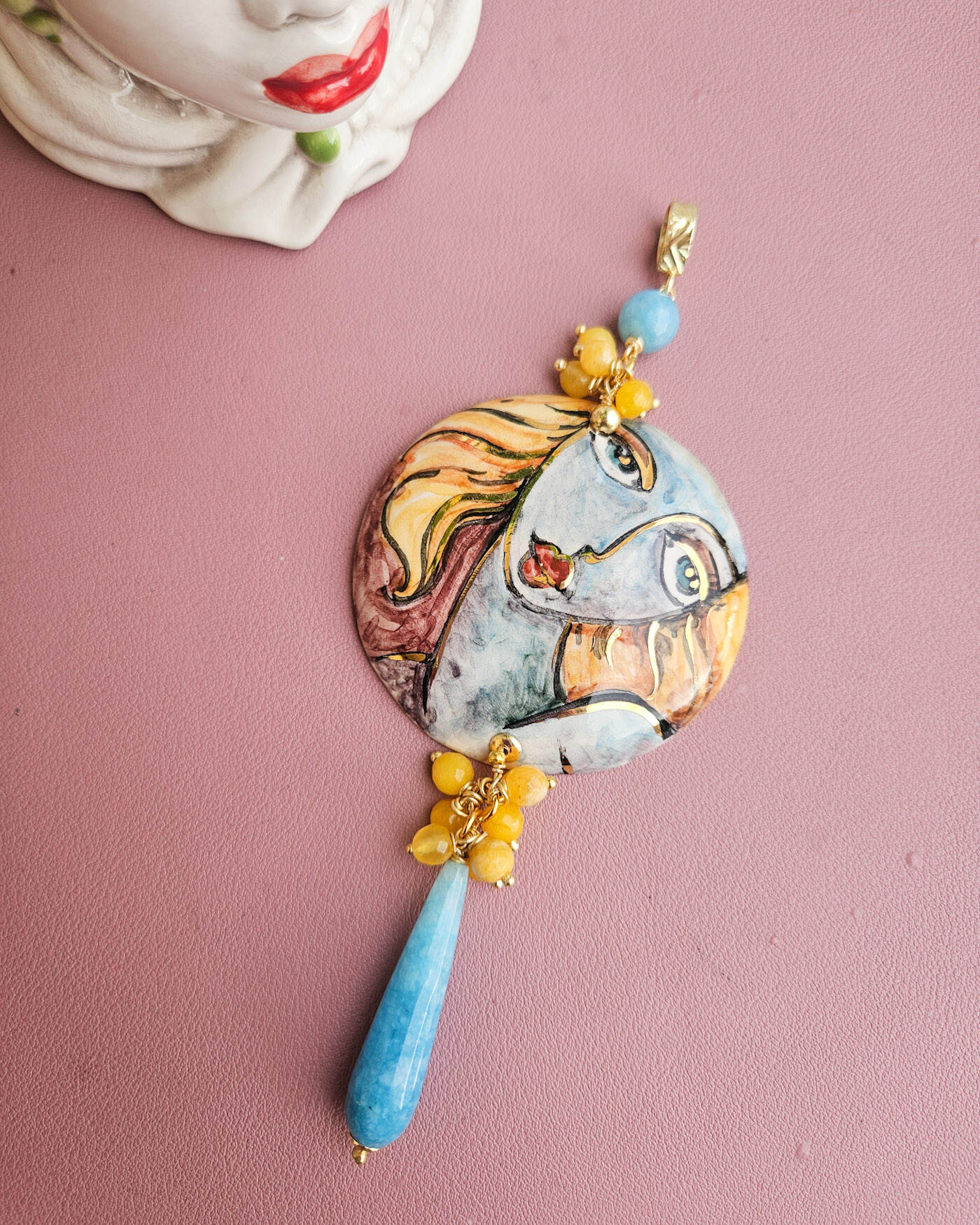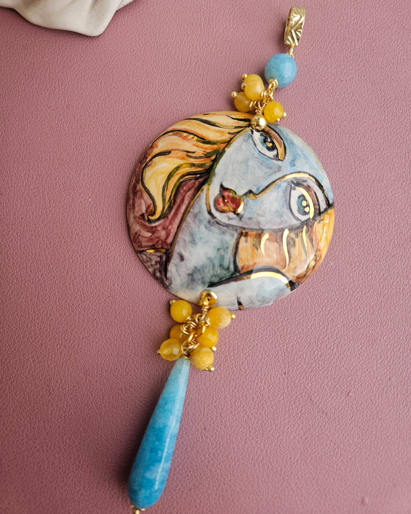 Ciondolo in Ceramica di Caltagirone Dipinta a Mano con Agata Gialla e Angelite