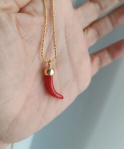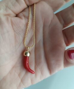 Collana a Catena in Argento 925 Placcato Oro con Corno Portafortuna in Corallo