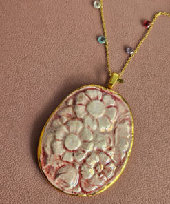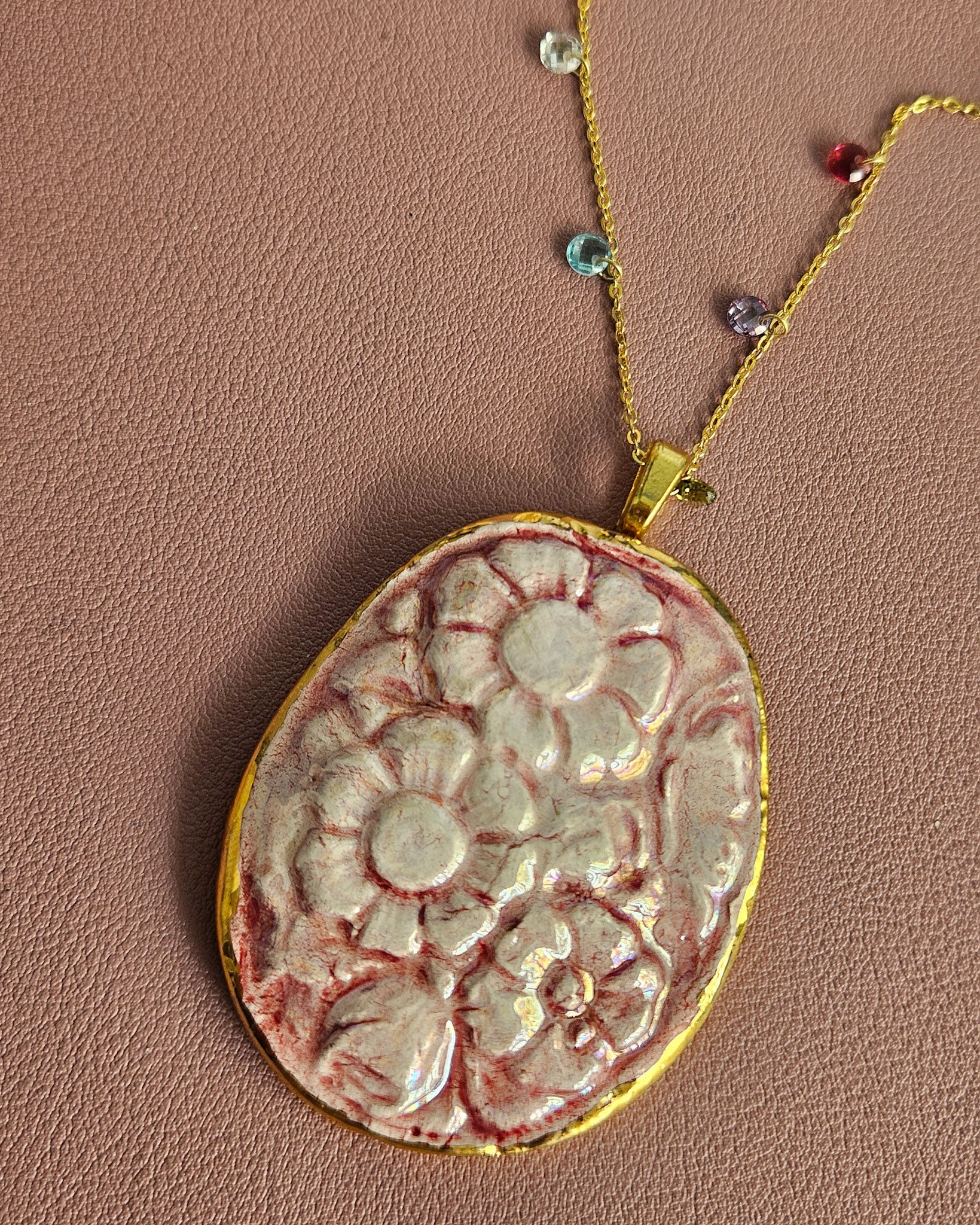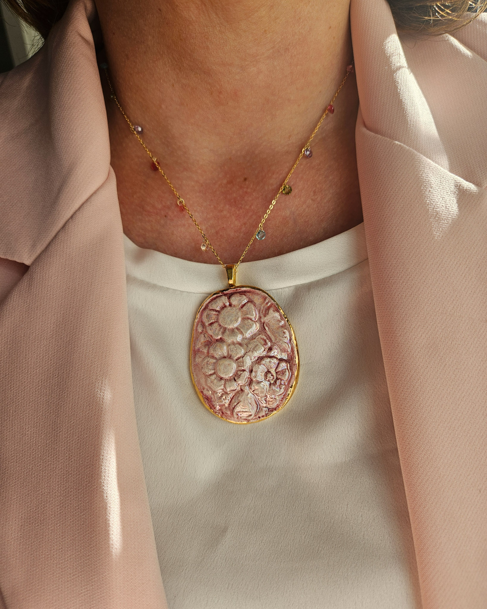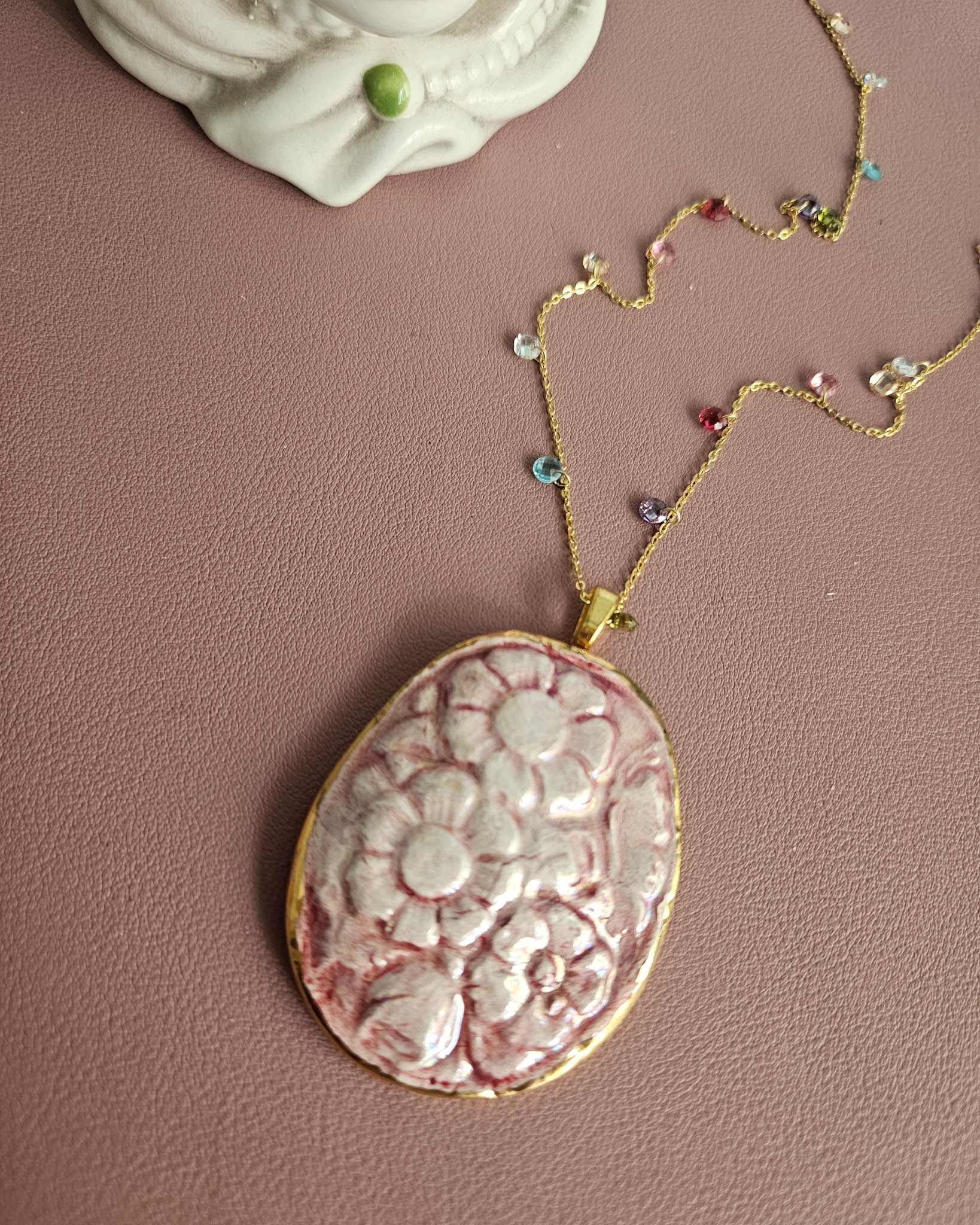 Questa catenina in argento 925 è delicata e luminosa, impreziosita da piccoli zirconi colorati che aggiungono un tocco di allegria e leggerezza. Al centro pende un ciondolo cammeo in ceramica, di forma ovale, con un dolce motivo floreale in rilievo nei toni del rosa, incorniciato da un bordo dorato che lo rende ancora più elegante. È un gioiello romantico e raffinato, perfetto per chi ama i dettagli unici e intramontabili.