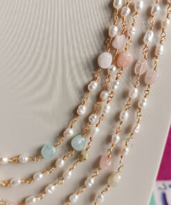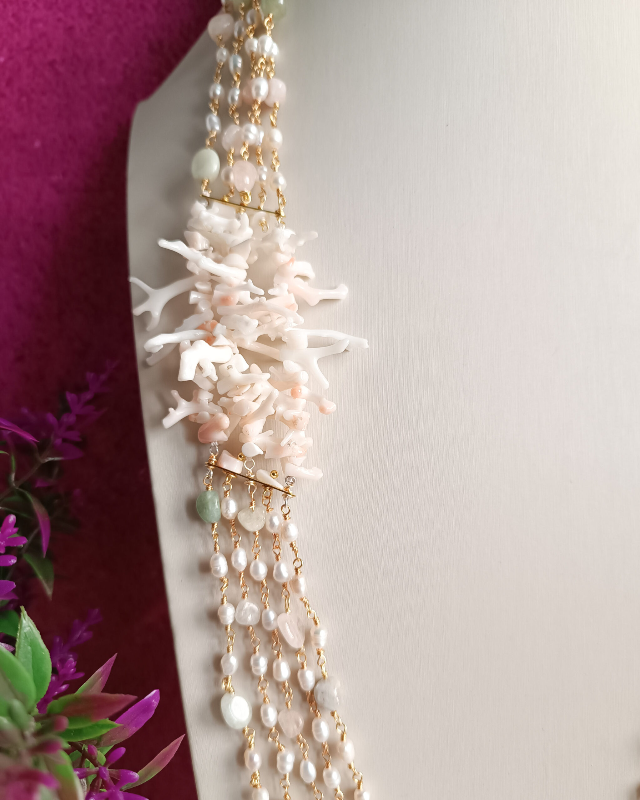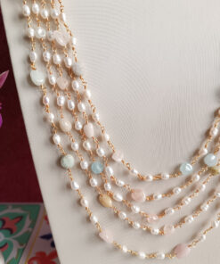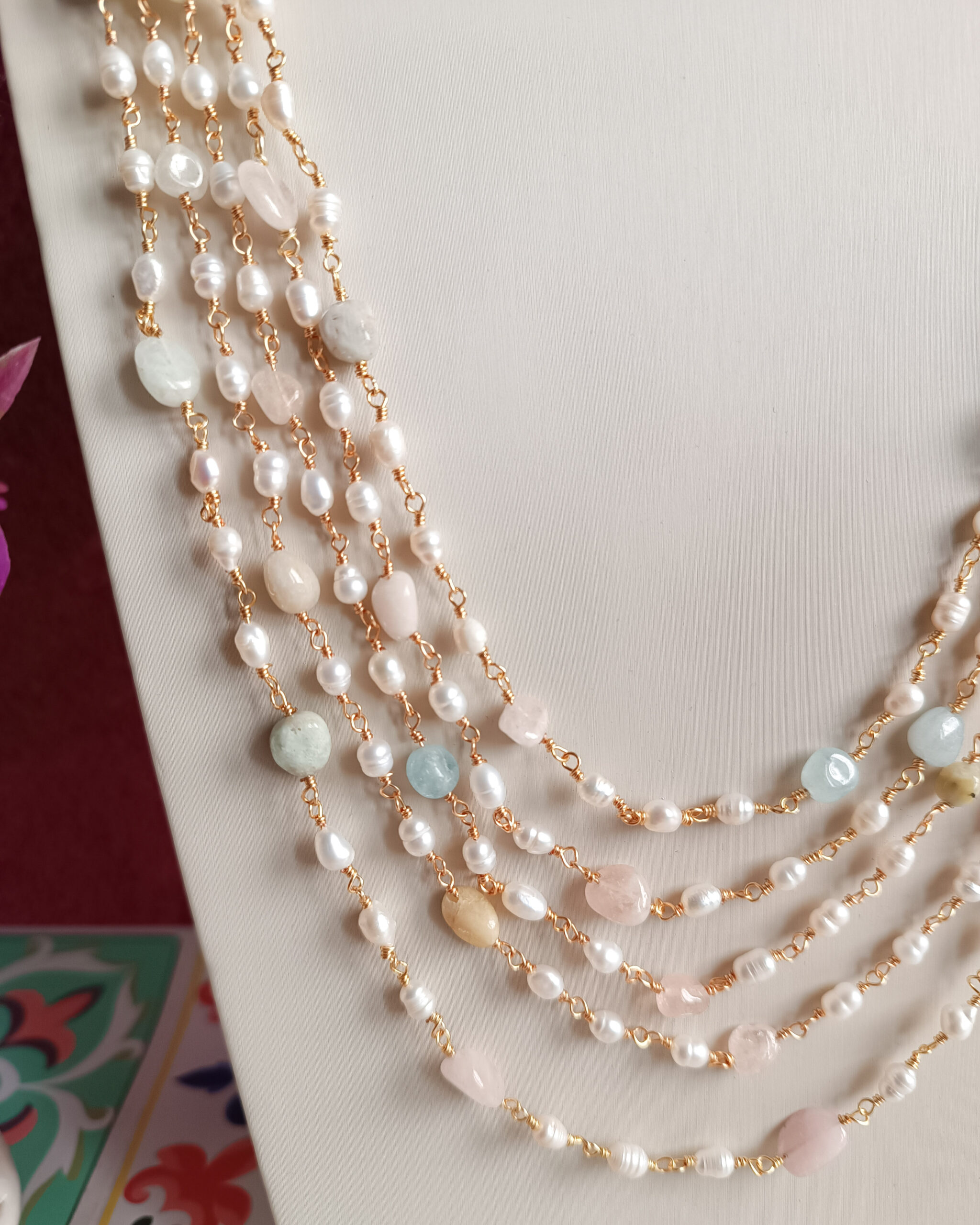 Collana a Cinque Fili con Acquamarina, Morganite, Perle e Corallo Rosa