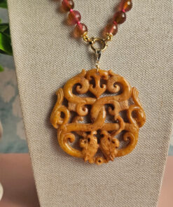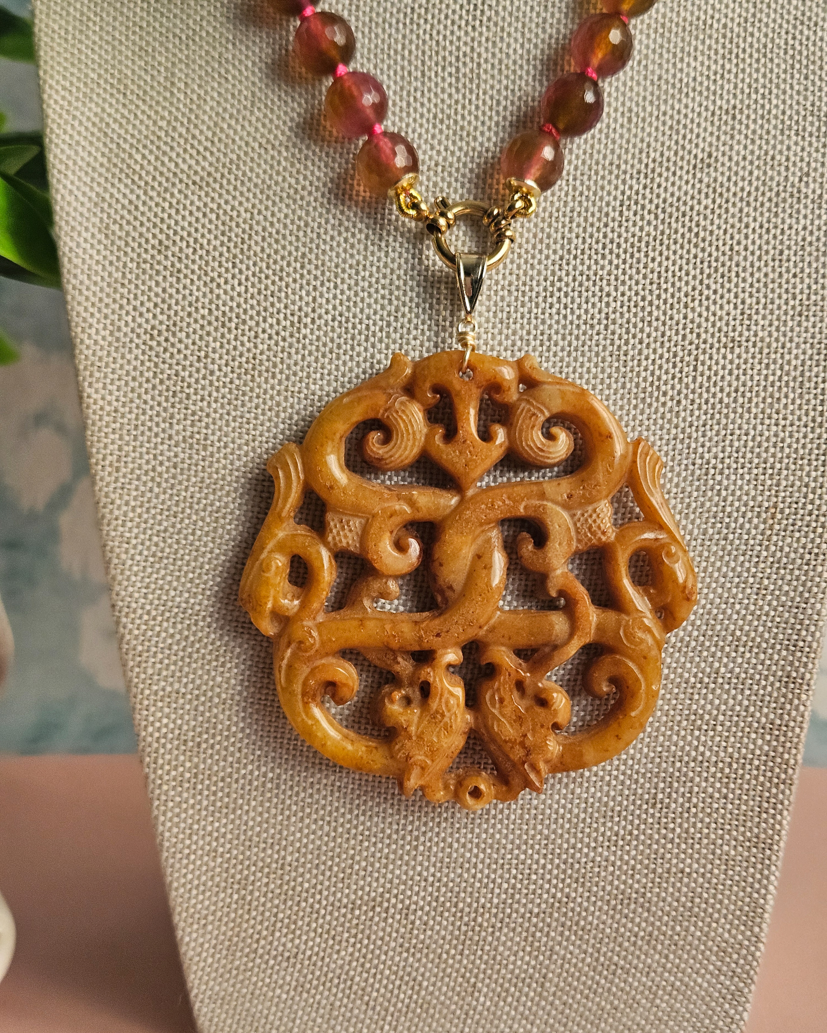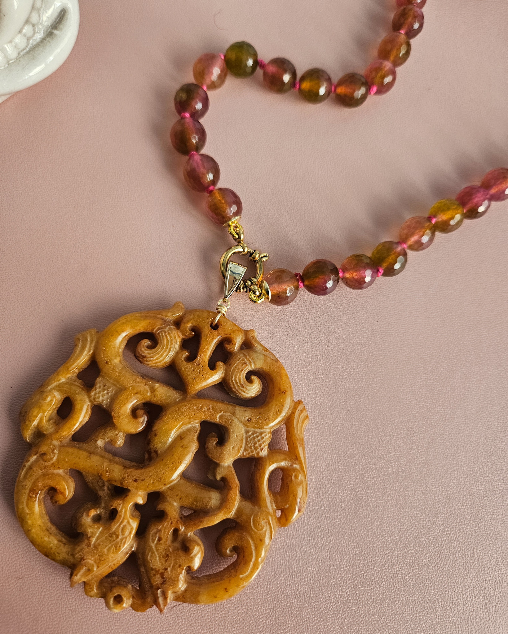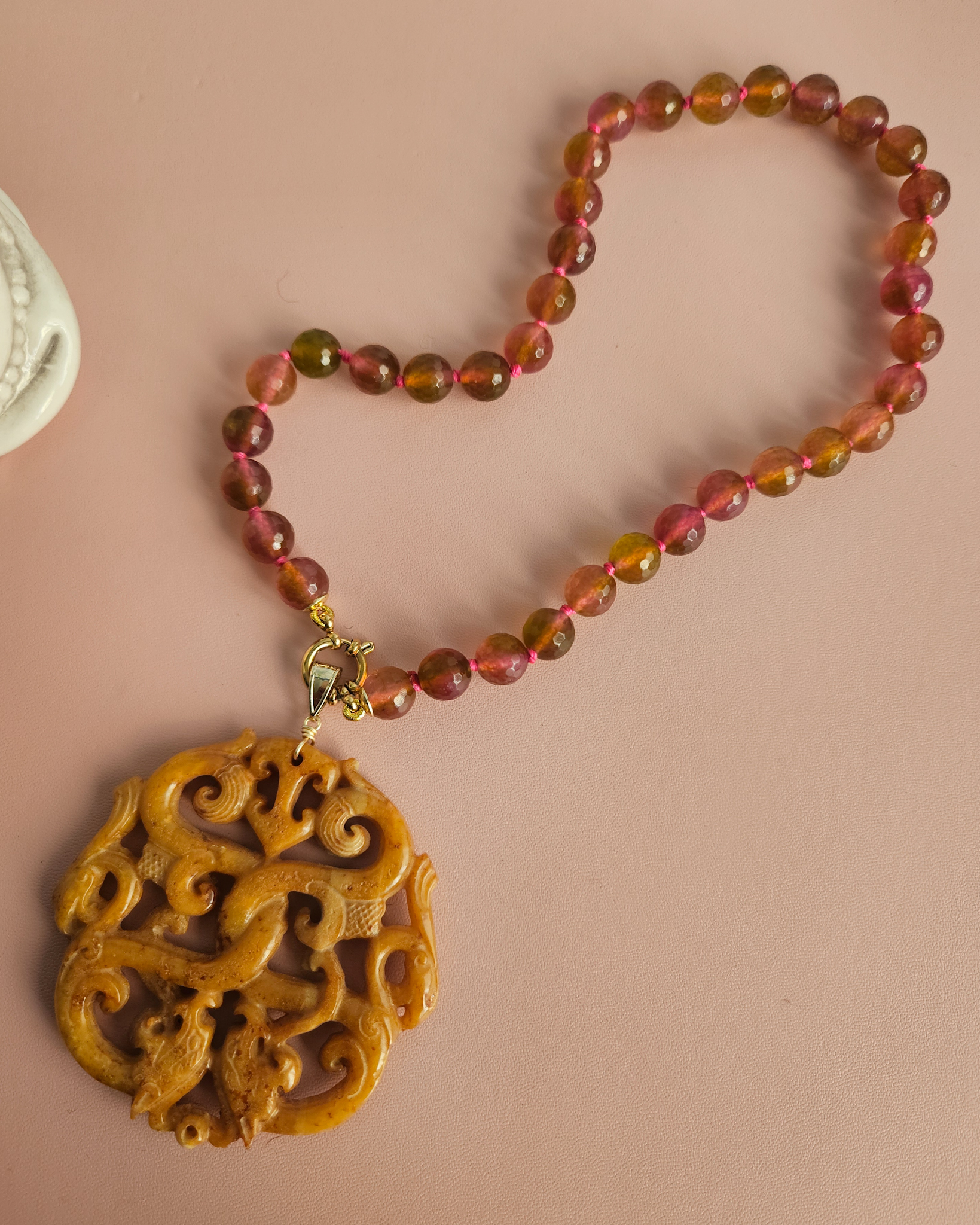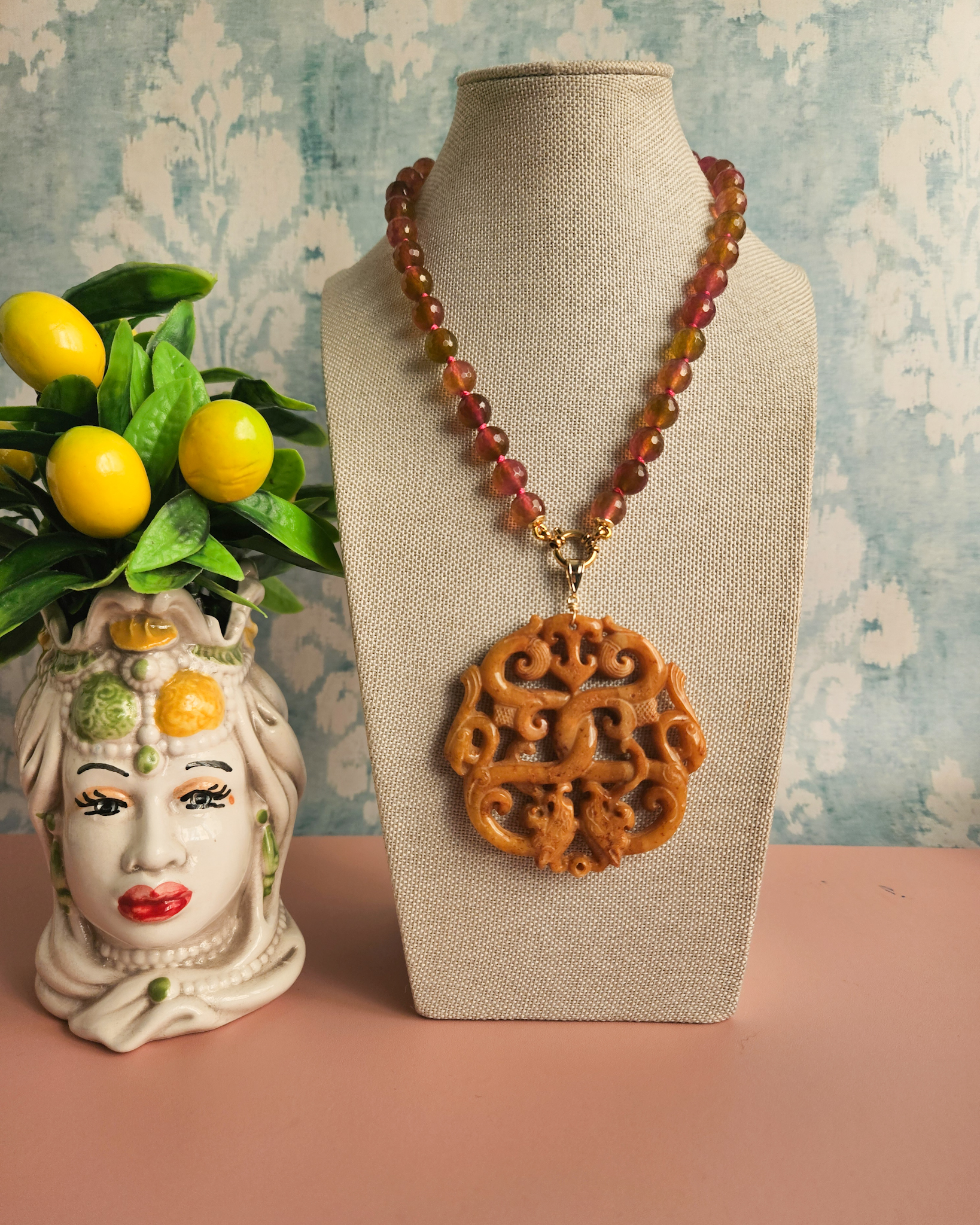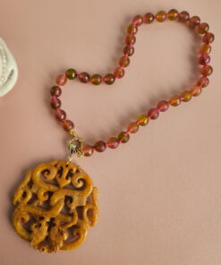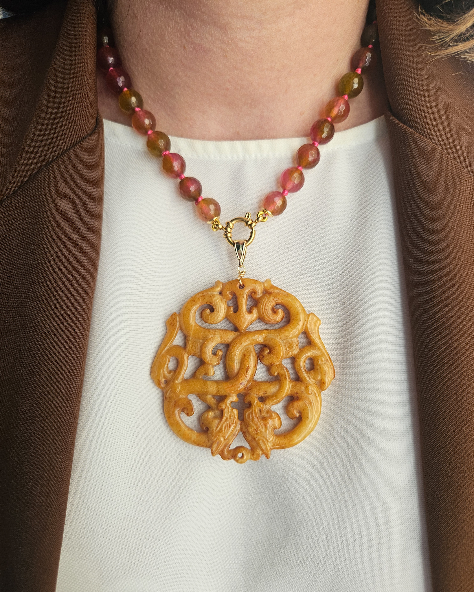 Al centro spicca un ciondolo in giada Burma, in un vivido e solare colore giallo. Il ciondolo si fonde perfettamente con la luminosità della giada floreale, creando un mix caldo e avvolgente.