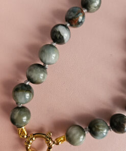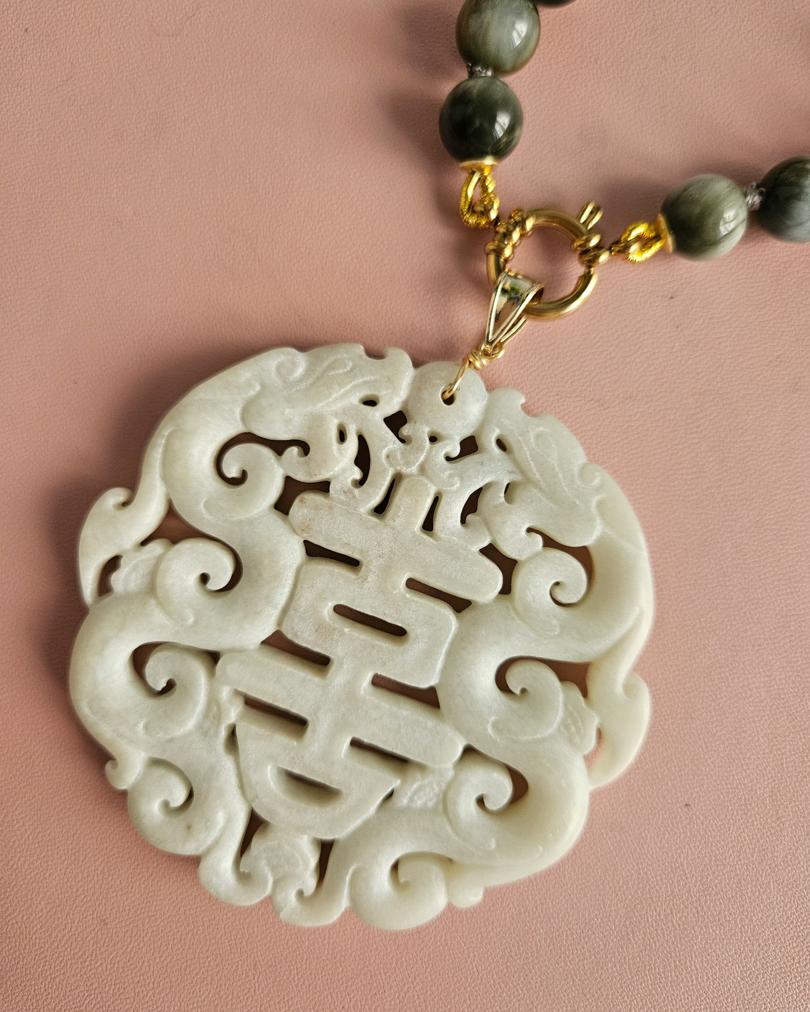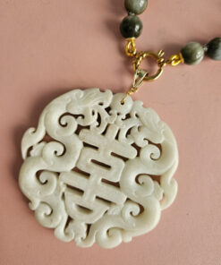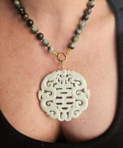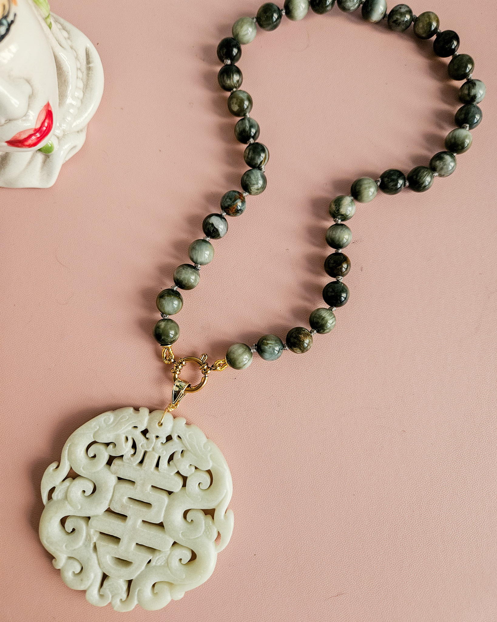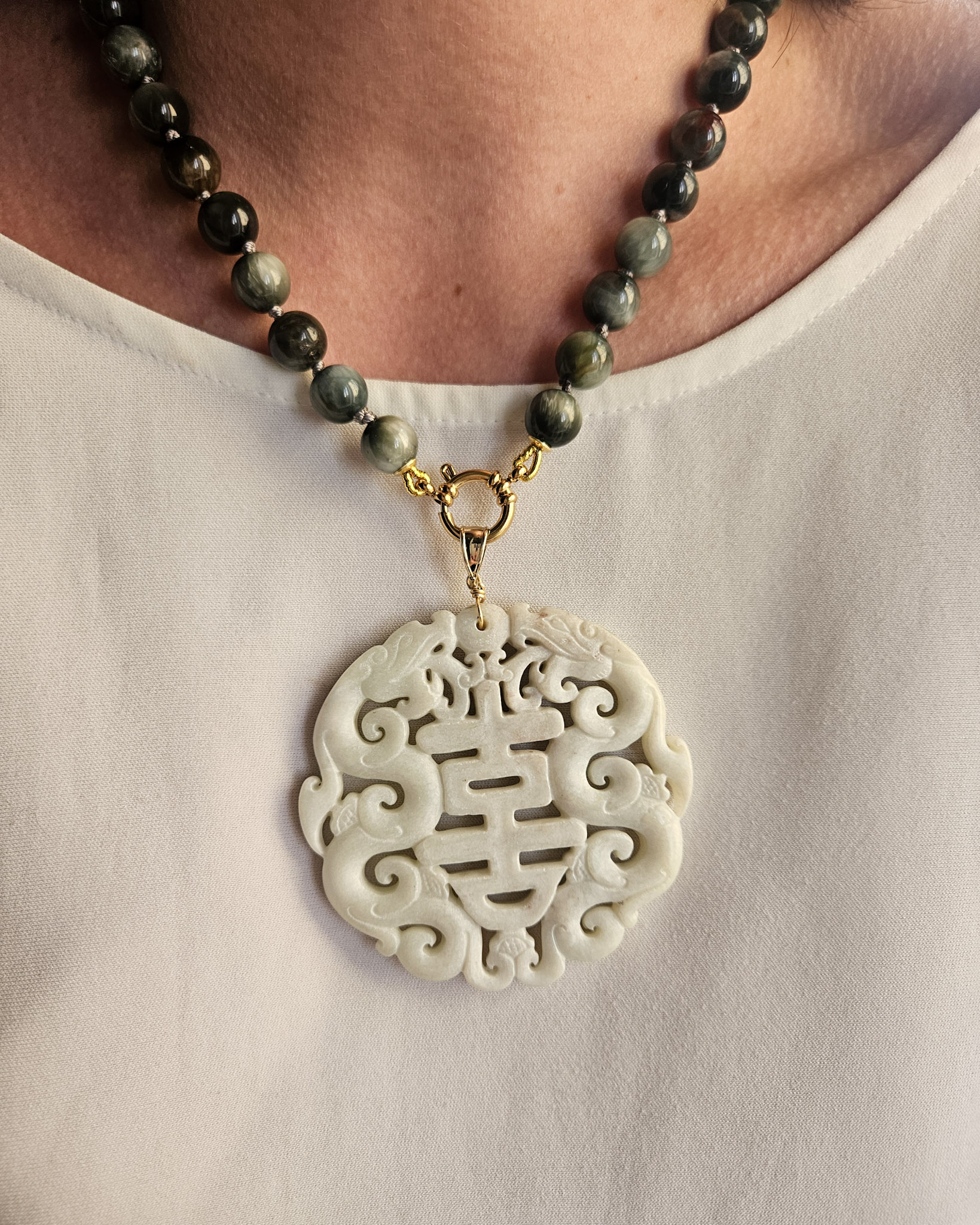 Una combinazione particolare tra pietre di occhio di falco, luminose e dalle sfumature profonde e naturali, e il grande ciondolo in giada bianca, lavorato con cura e ricco di dettagli.