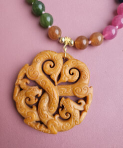 Al centro della collana è presente un importante ciondolo in giada Burma, finemente lavorato e intagliato, in una tonalità giallo caldo e luminoso. Il ciondolo diventa il vero punto focale del gioiello, dialogando perfettamente con le cromie della tormalina e valorizzando l’intera composizione.