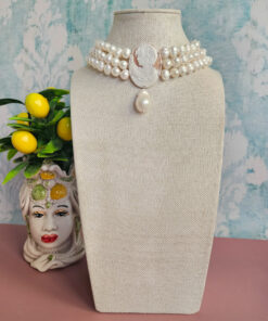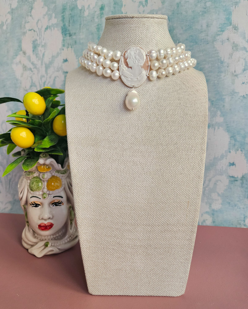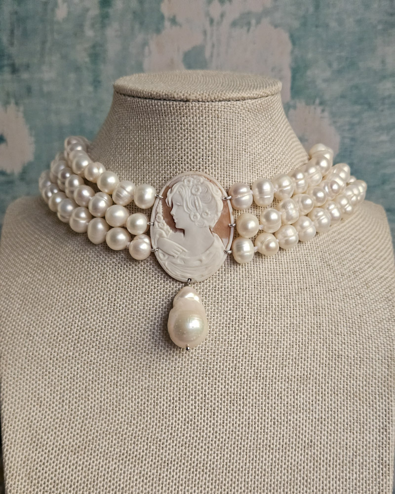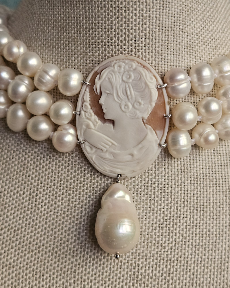 Modello intramontabile, con perle di fiume e straordinario cammeo originale di Torre del Greco. La figura femminile rappresentata è di straordinaria bellezza e ricca di particolari. Posto al centro della collana sarà un perfetto protagonista della tua collana ed un elemento di pregio che impreziosirà i tuoi look con innato stile.