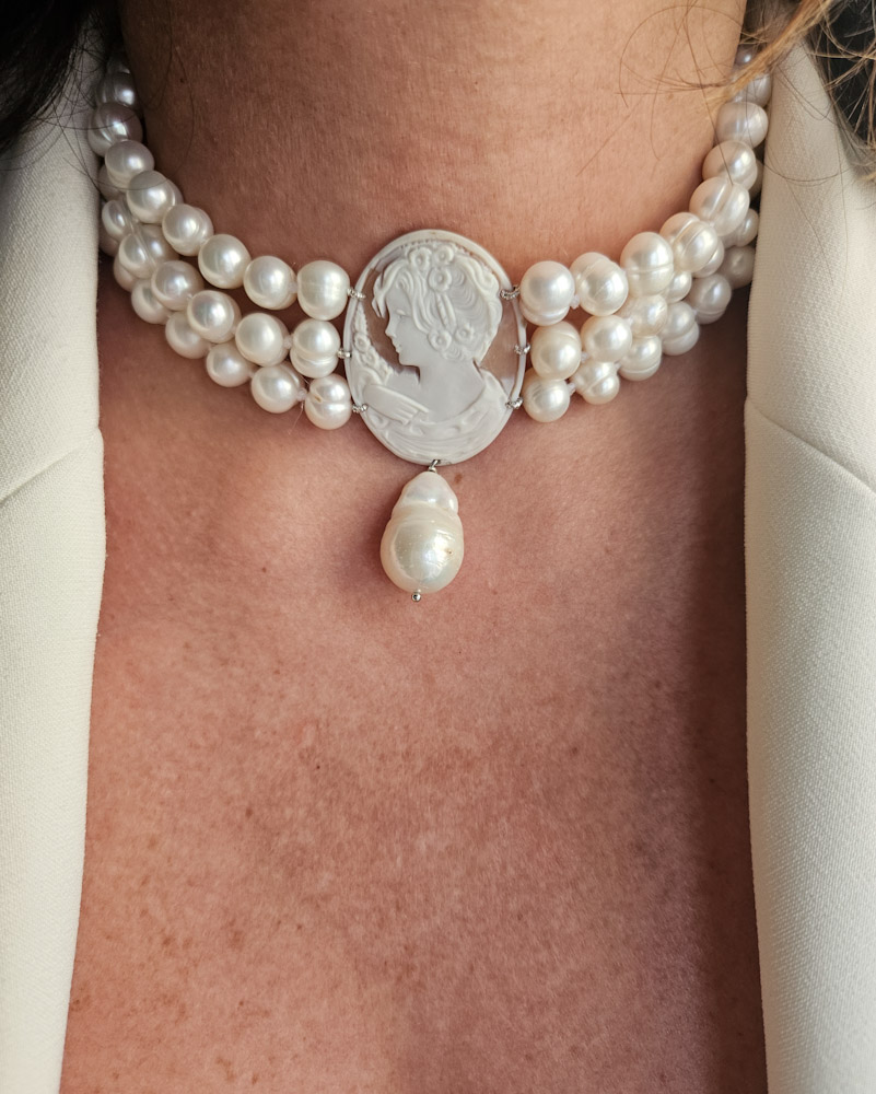 Collana Choker a Tre Fili con Perle di Fiume e Cammeo Conchiglia Sardonica