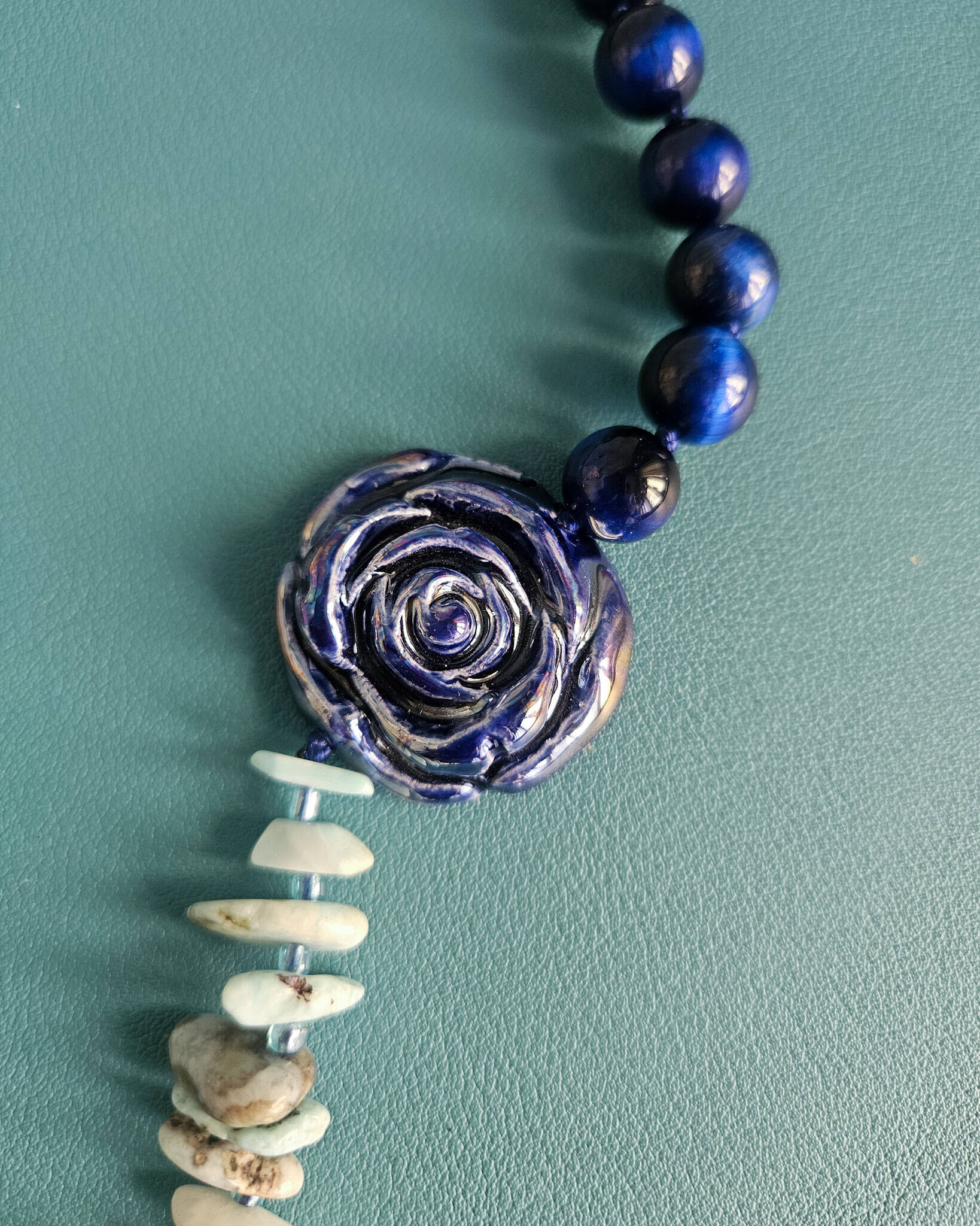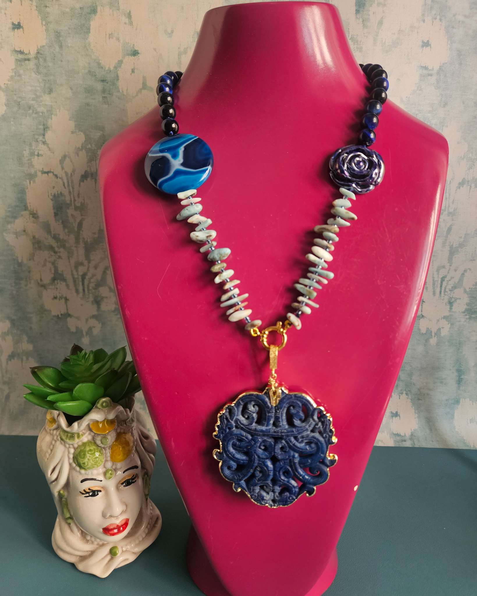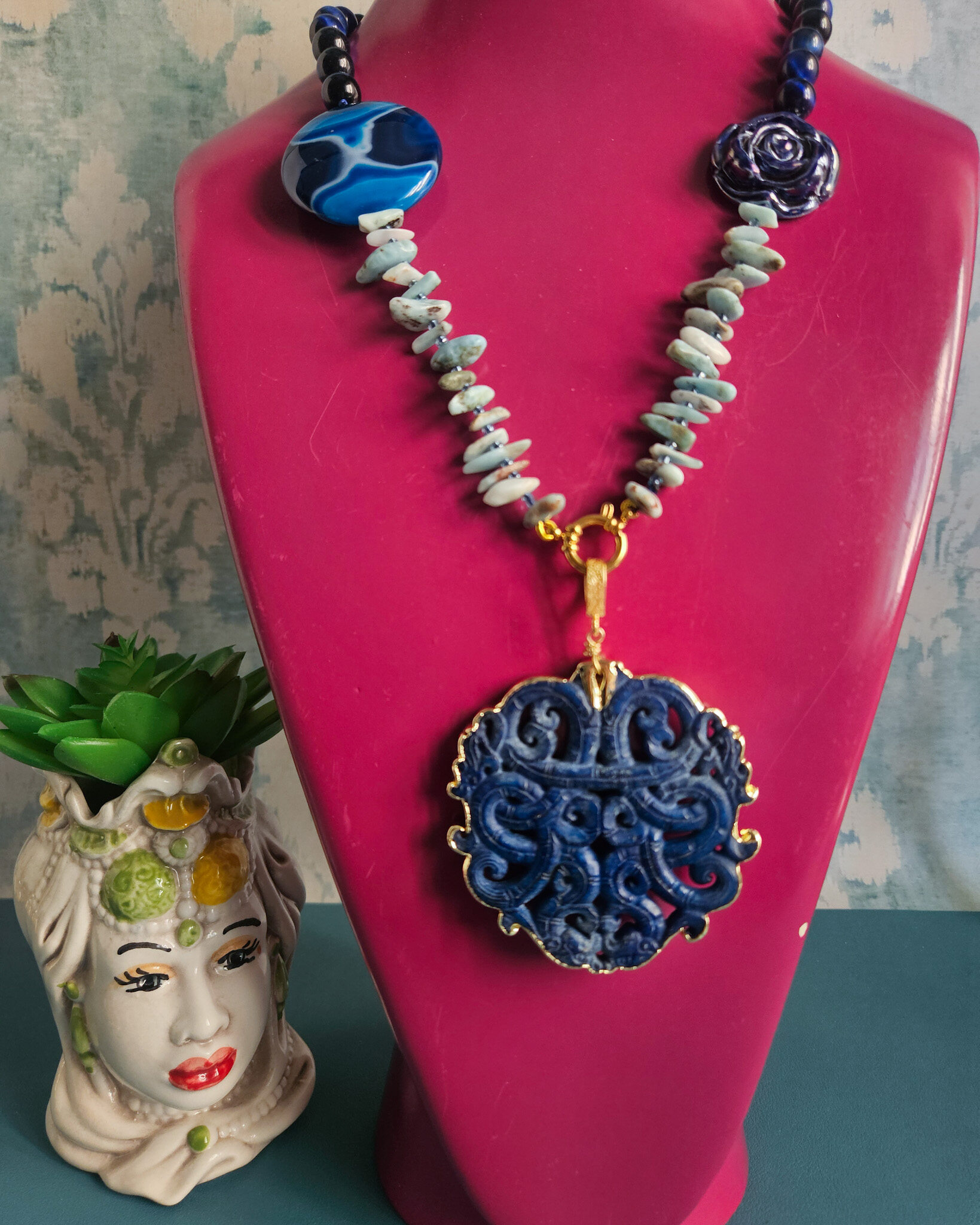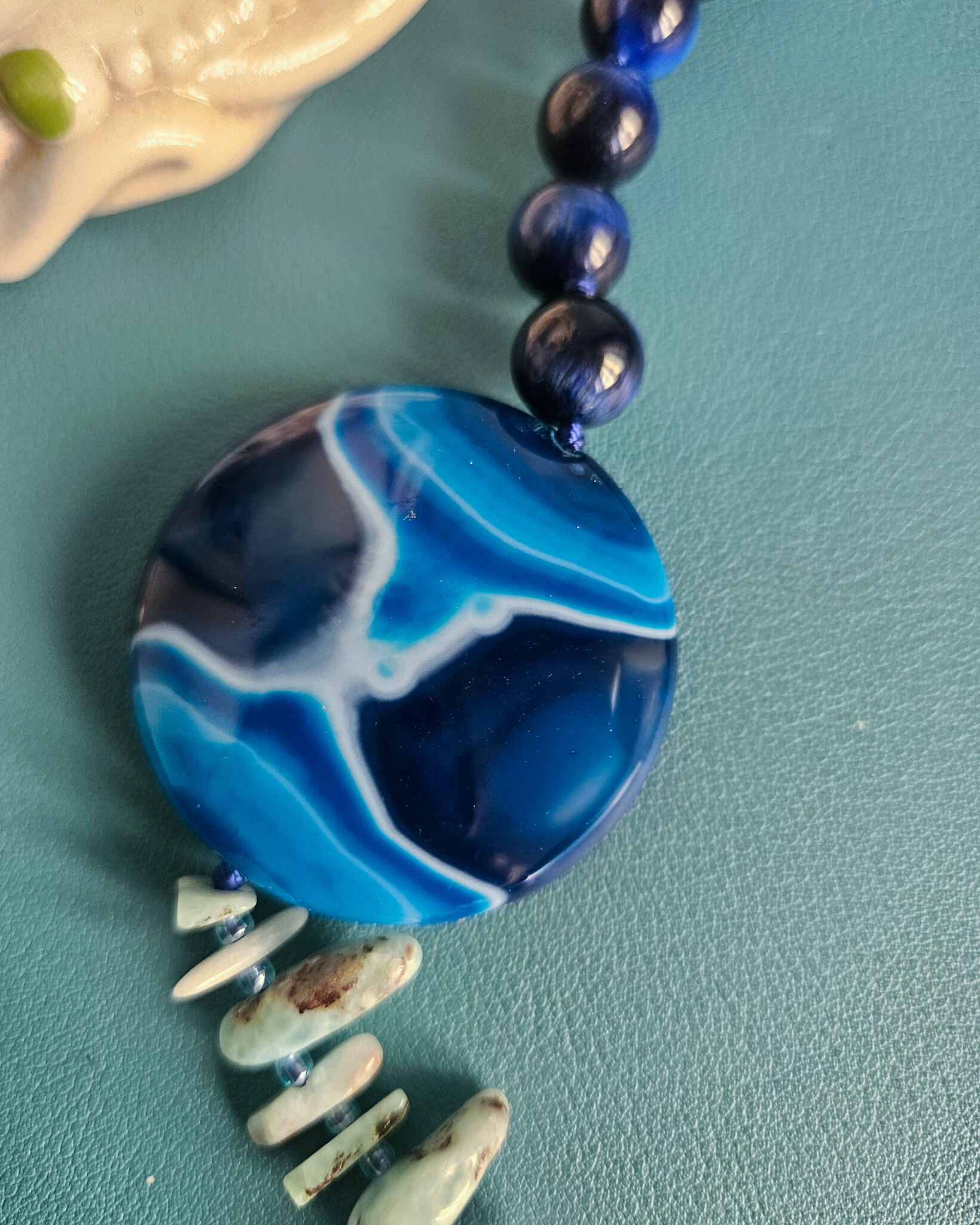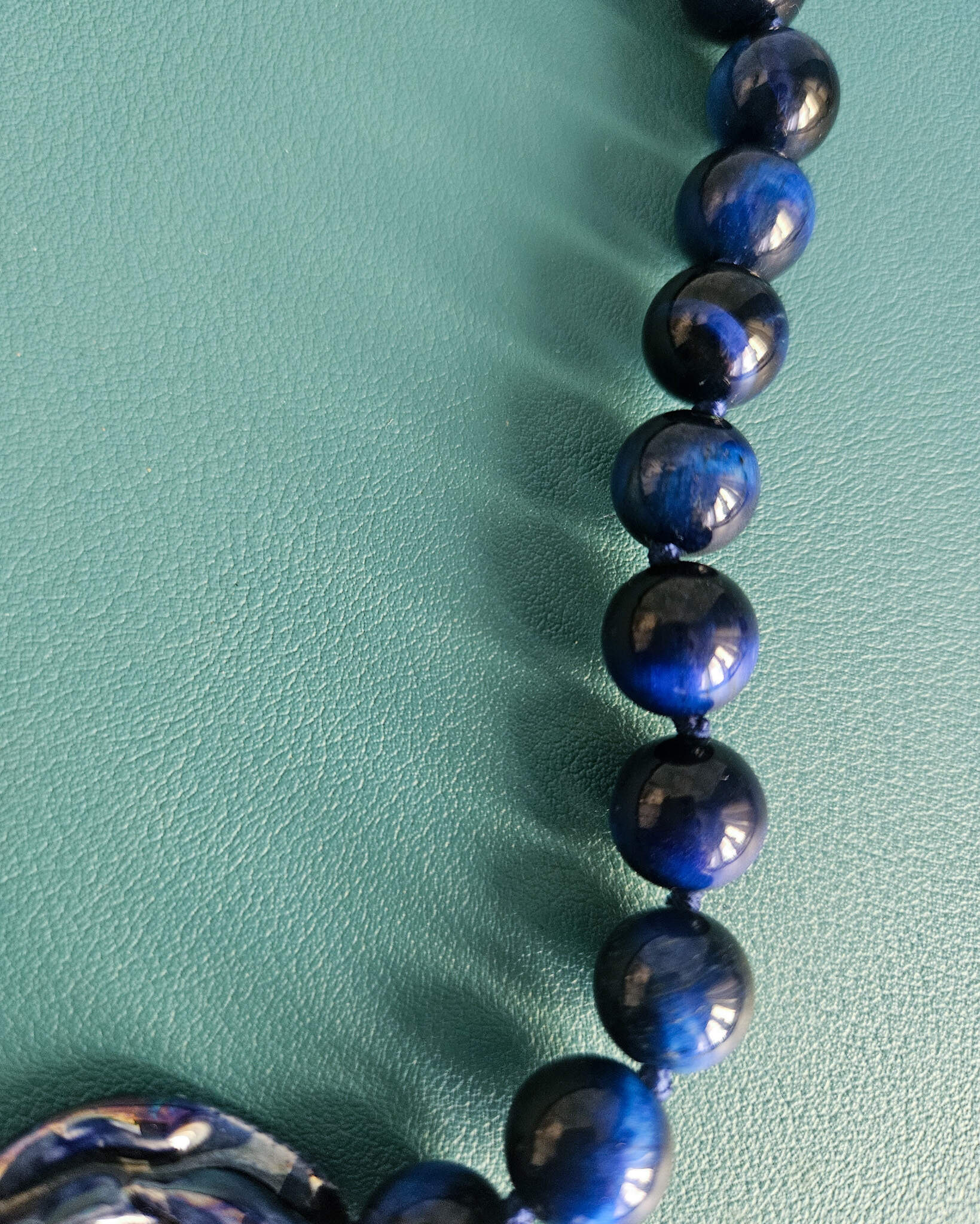 Collana Decollete con Occhio di Tigre Blu, Larimar e Ciondolo Giada Blu