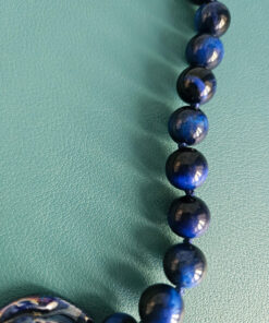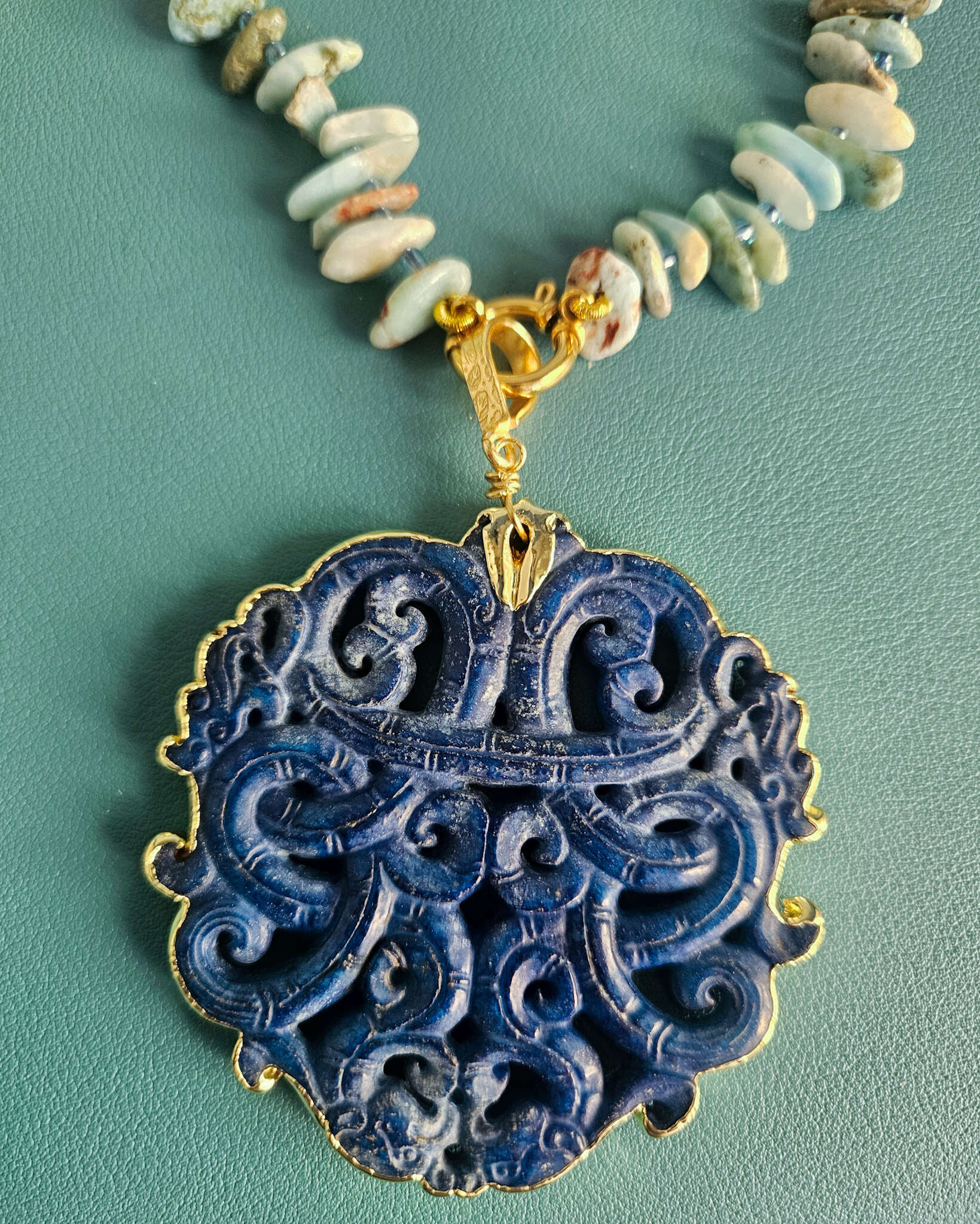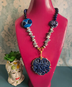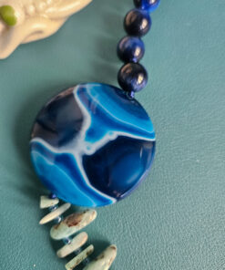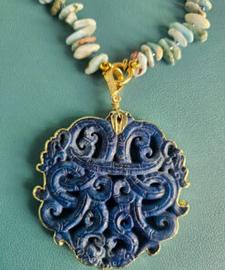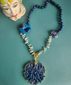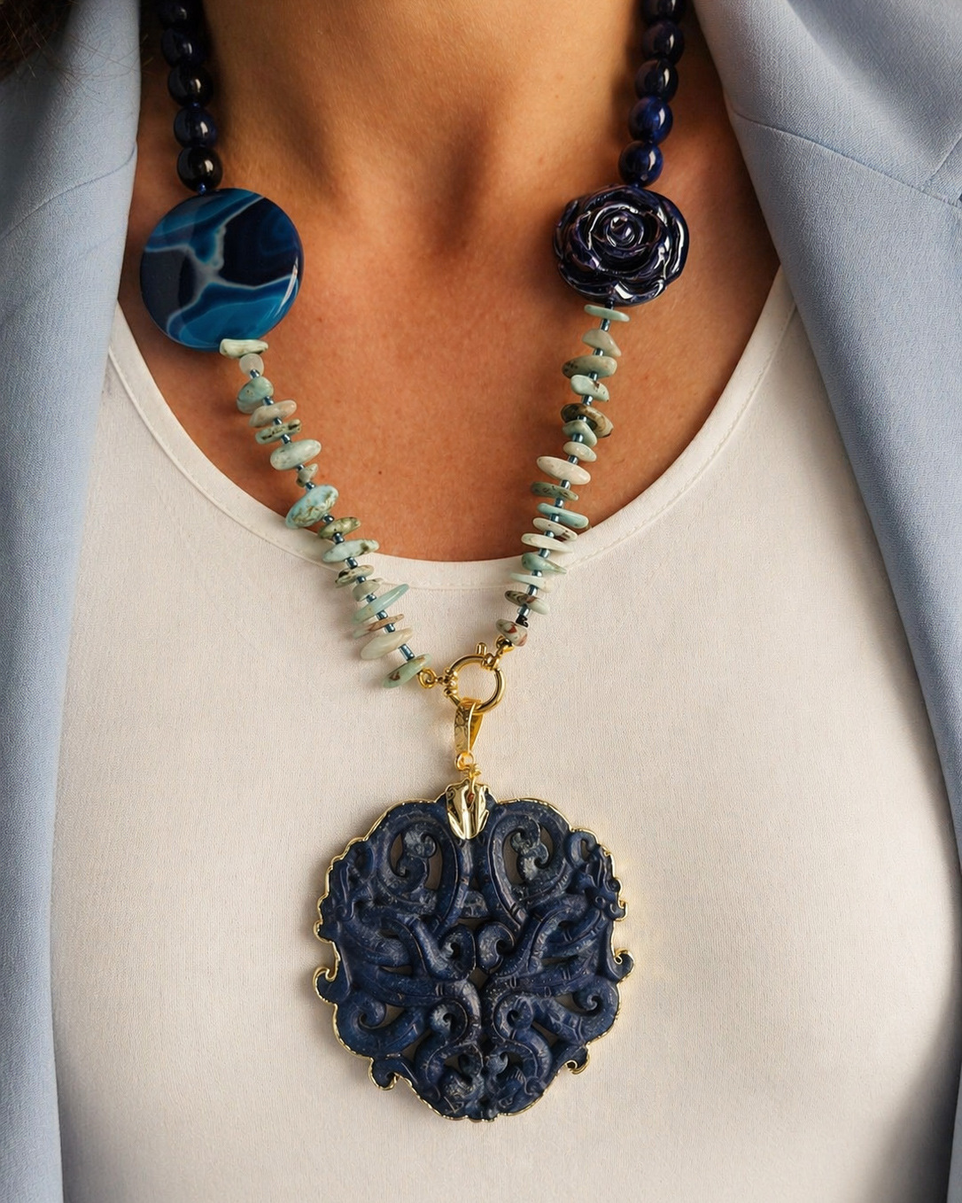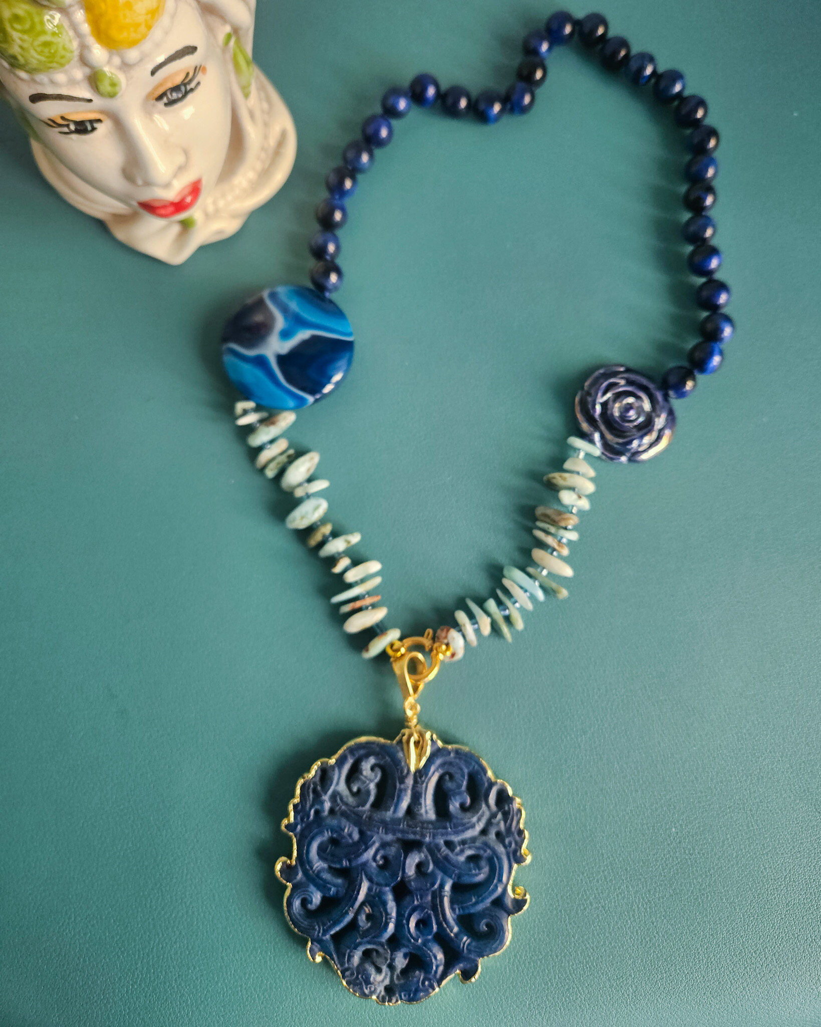 Il cuore della collana è il ciondolo in giada blu: un elemento che cattura immediatamente lo sguardo e trasmette personalità.
