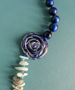 Realizzata con occhio di tigre blu, è arricchita da chips di larimar che donano luminosità, contrasto ed eleganza decisa. Le pietre, sapientemente alternate, creano un ritmo visivo armonioso, mai rigido, che rende ogni dettaglio vivo e dinamico.