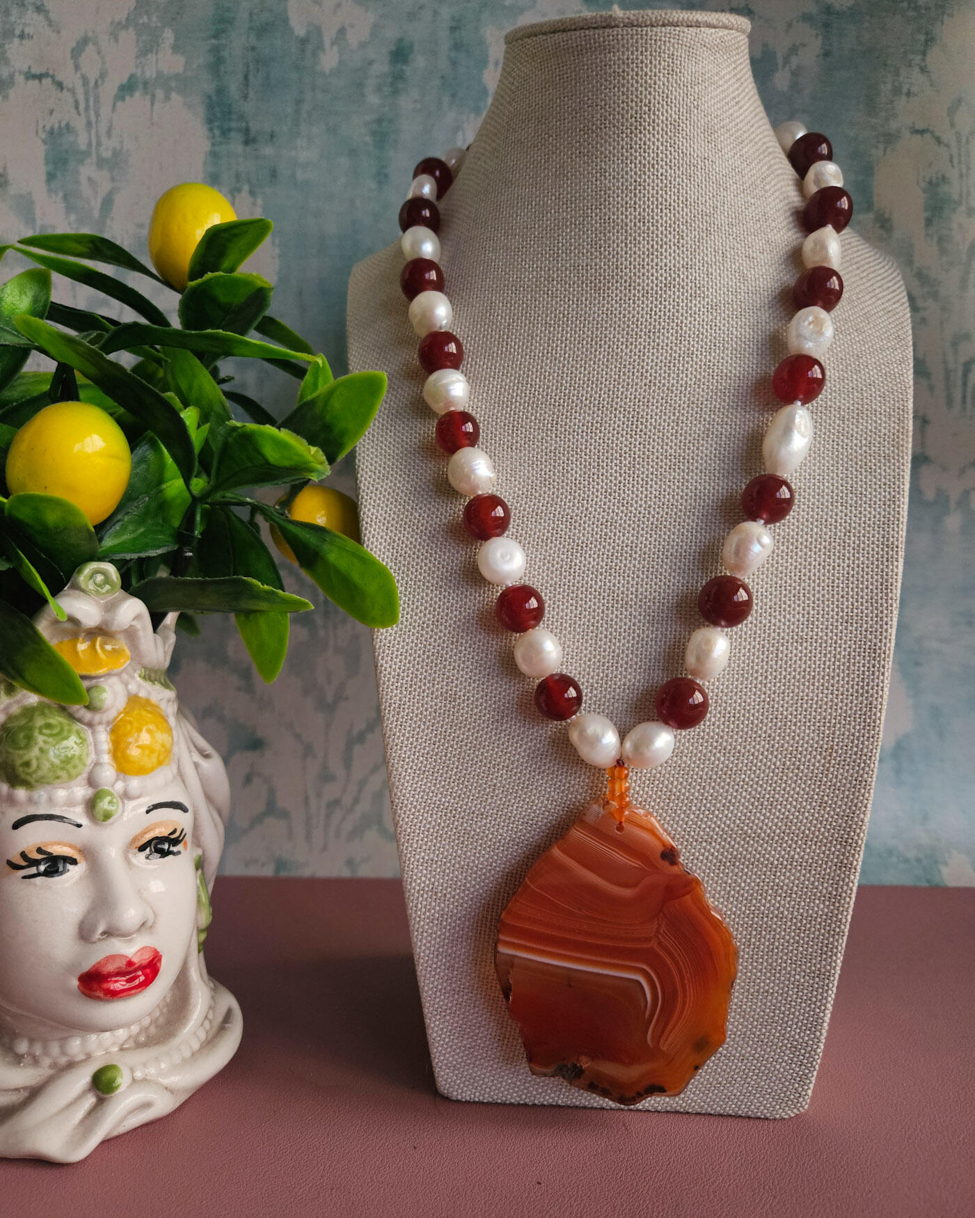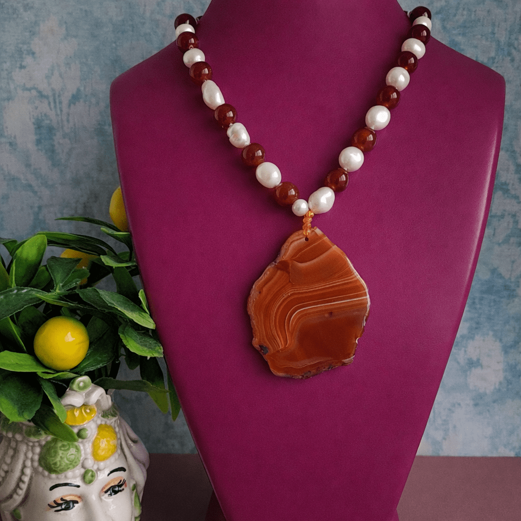 Collana Decollete con Perla, Corniola e Ciondolo Agata Naturale