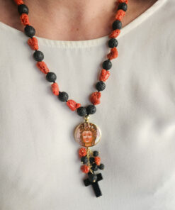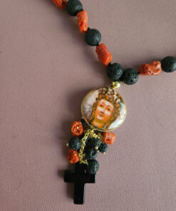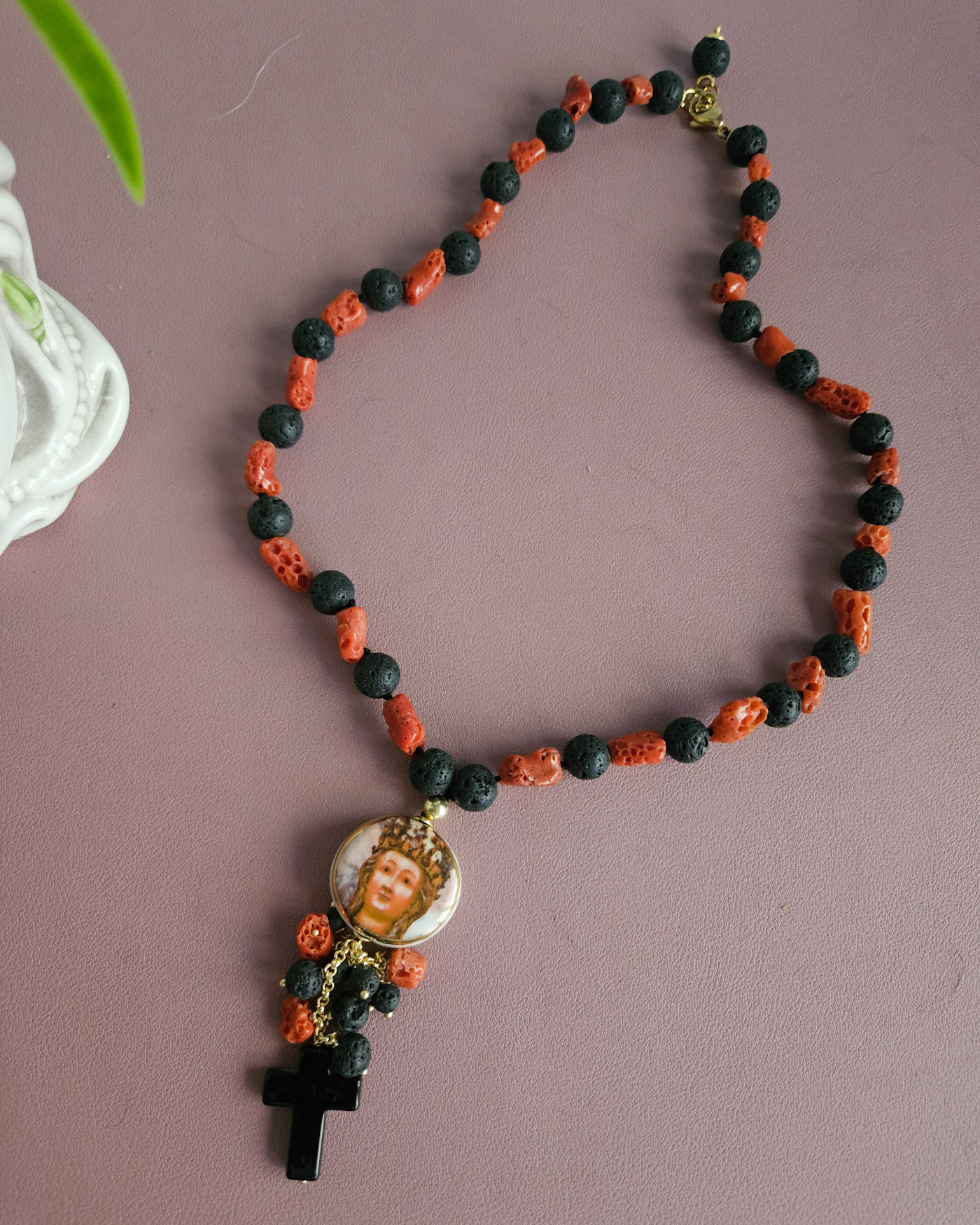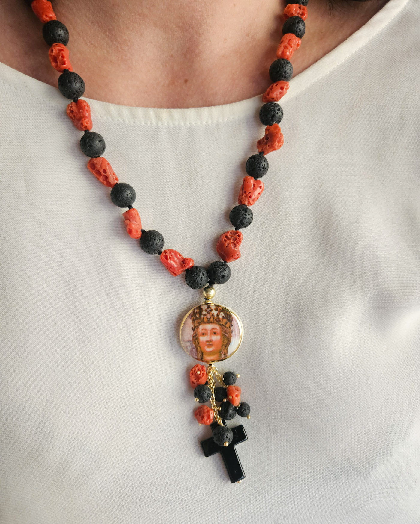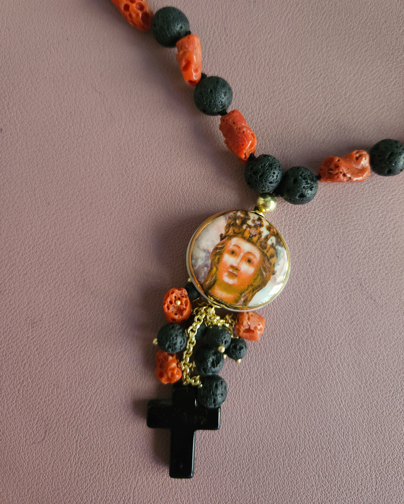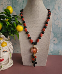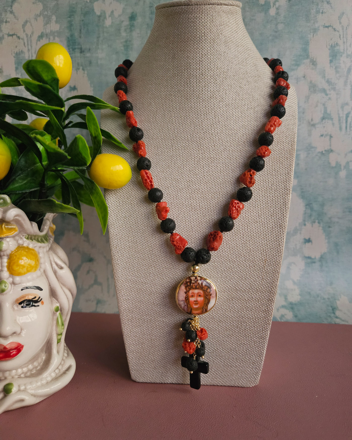 Collana Decollete con Pietra Lavica, Corallo Rosso e Ciondolo in Ceramica di Caltagirone con Sant’Agata