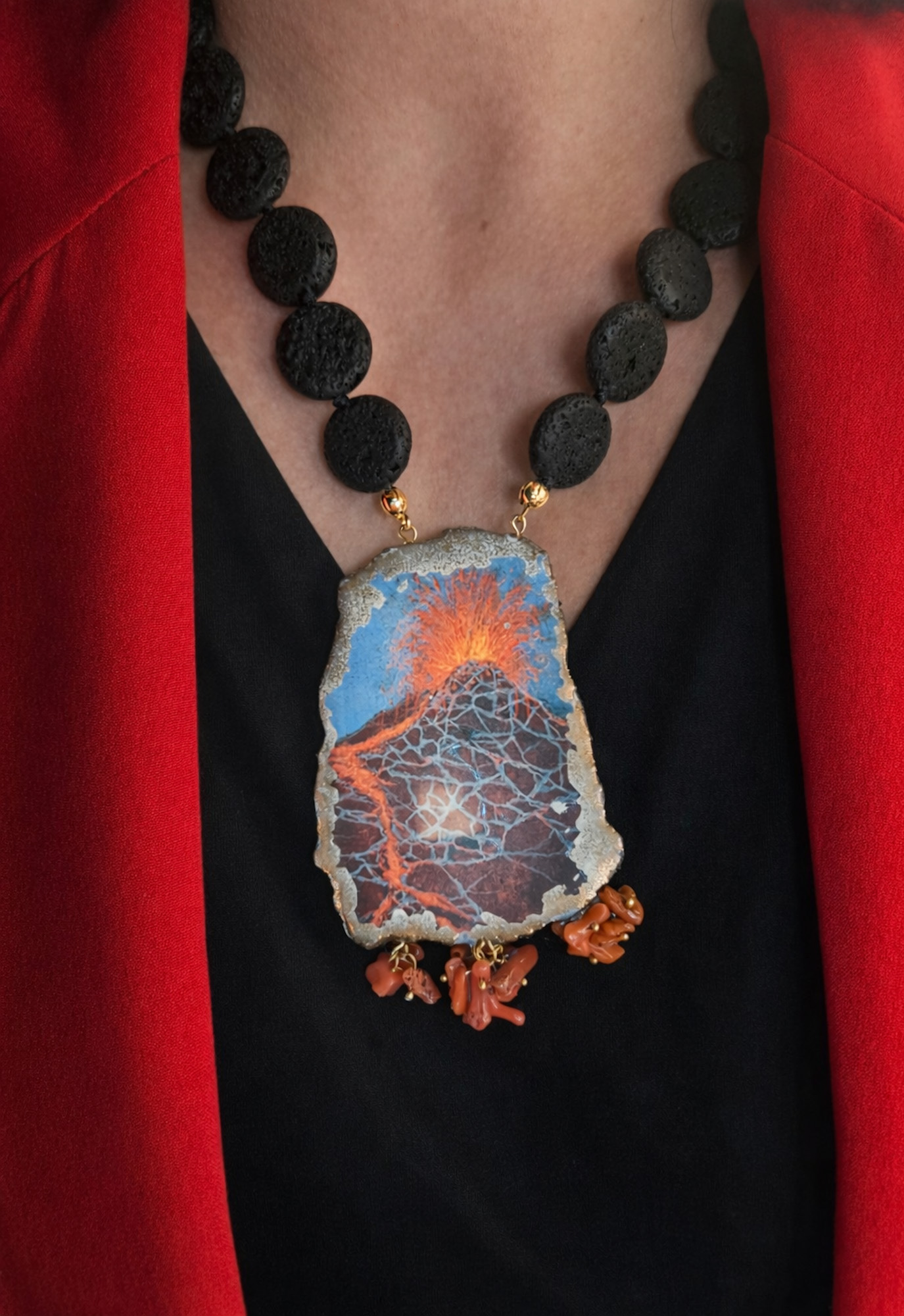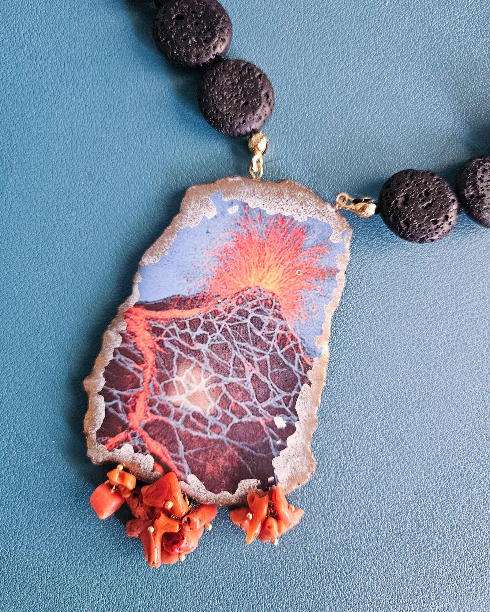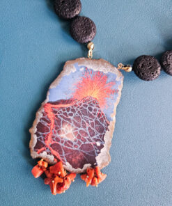 Il pendente è un vero omaggio all’Etna, con richiami visivi alle sue colate incandescenti e alla sua anima potente e indomabile. È come portare al collo un momento sospeso nel tempo, quando la terra si apre e si trasforma in spettacolo.
